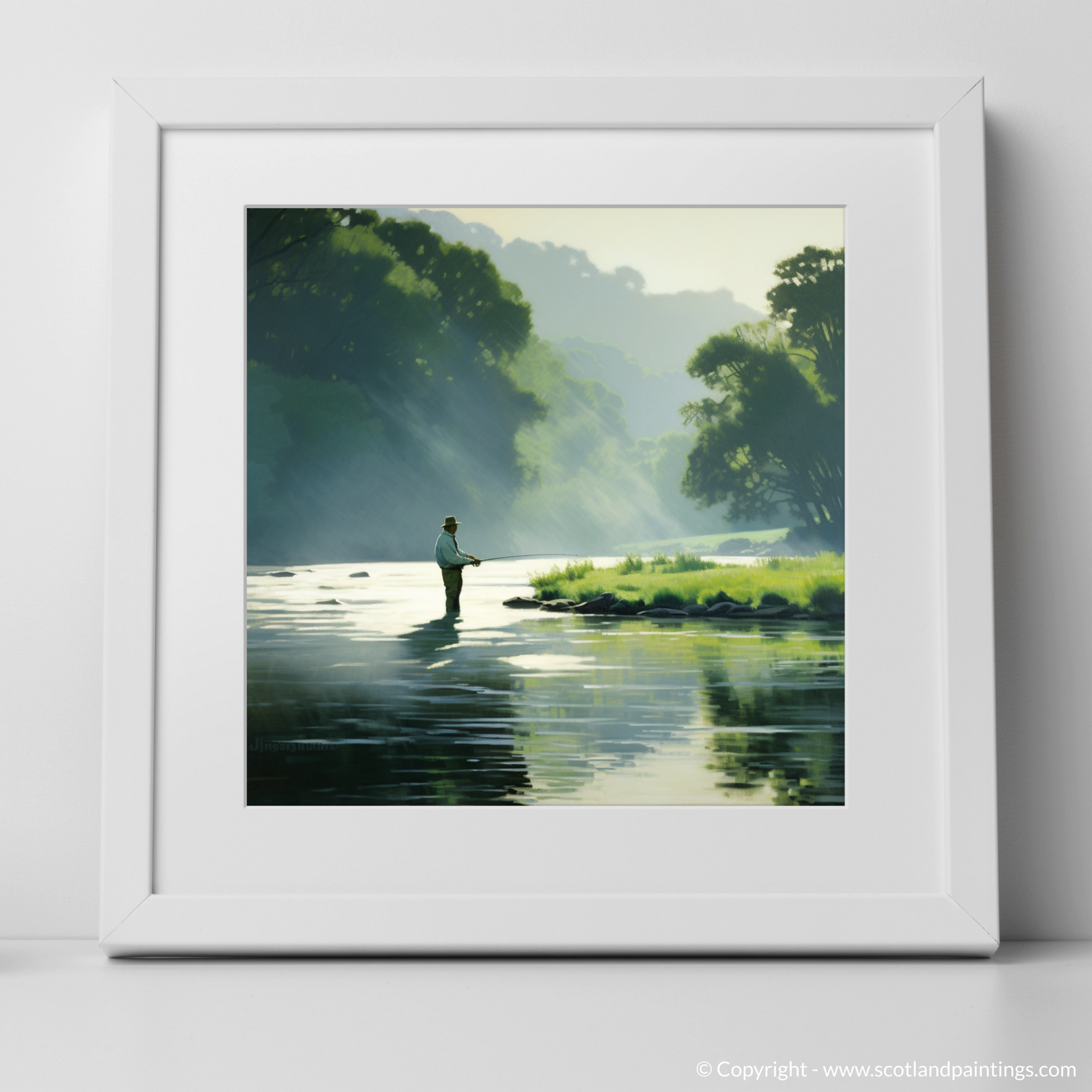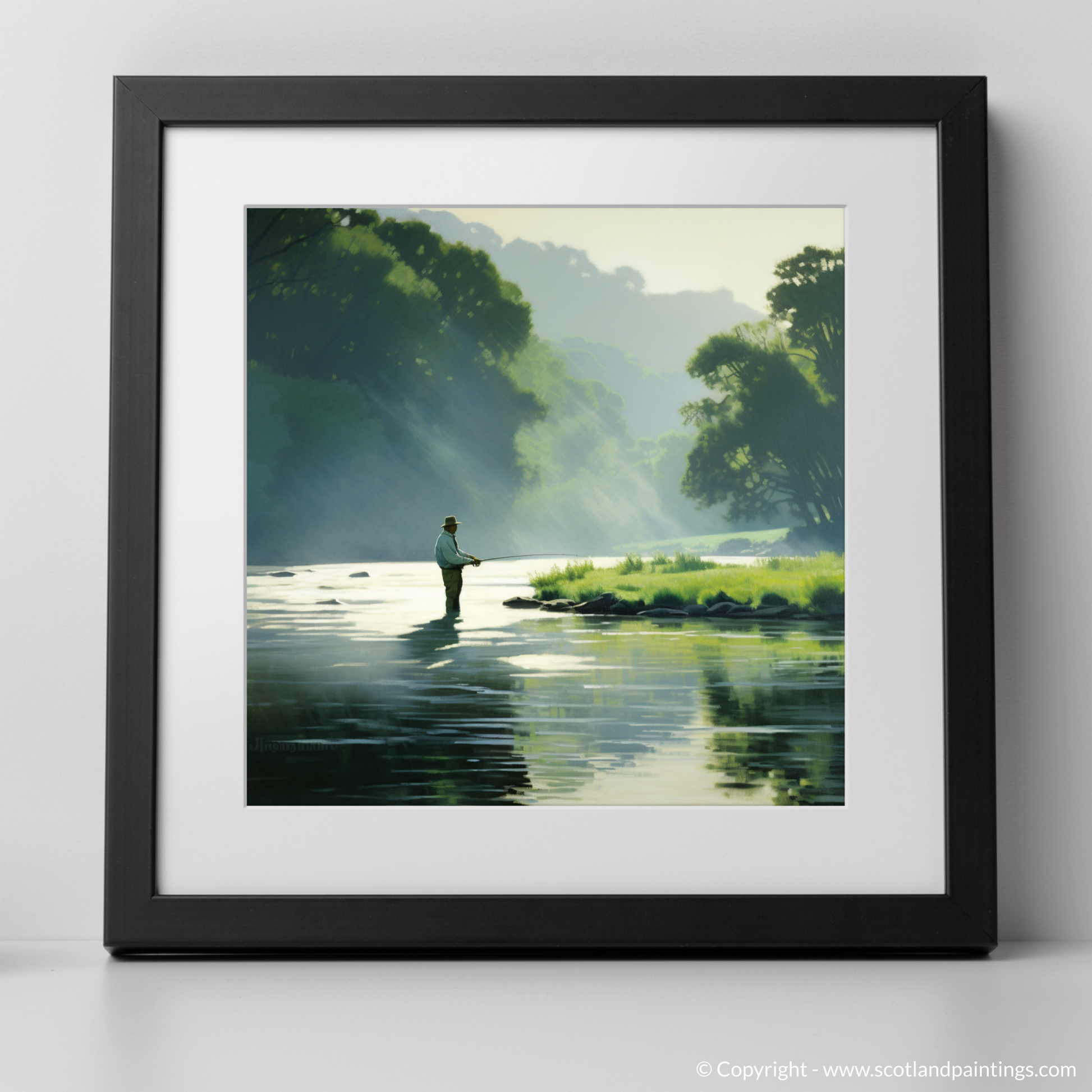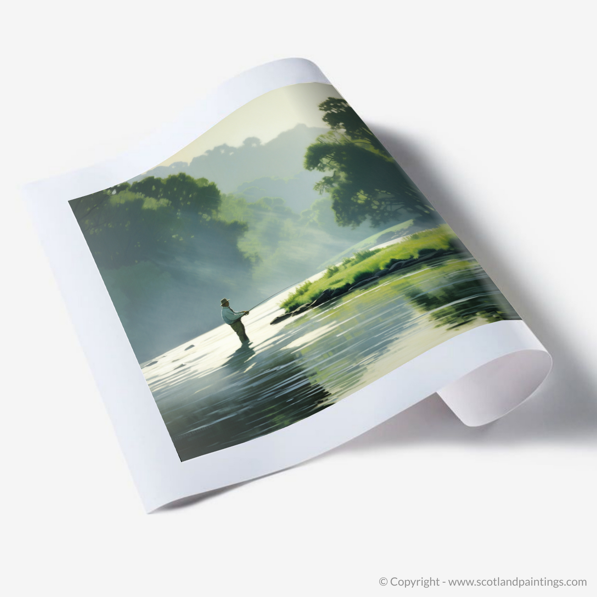 Immerse yourself in the tranquil essence of Scottish fly fishing with this exquisite print, capturing a timeless moment of harmony between man and nature. At first light, the soft hues of dawn gently blanket the River Earn, crafting a scene steeped in peaceful solitude. A lone fisherman, engrossed in the art of fly fishing, stands mid-stream, his silhouette gracefully etched against the calming waters.