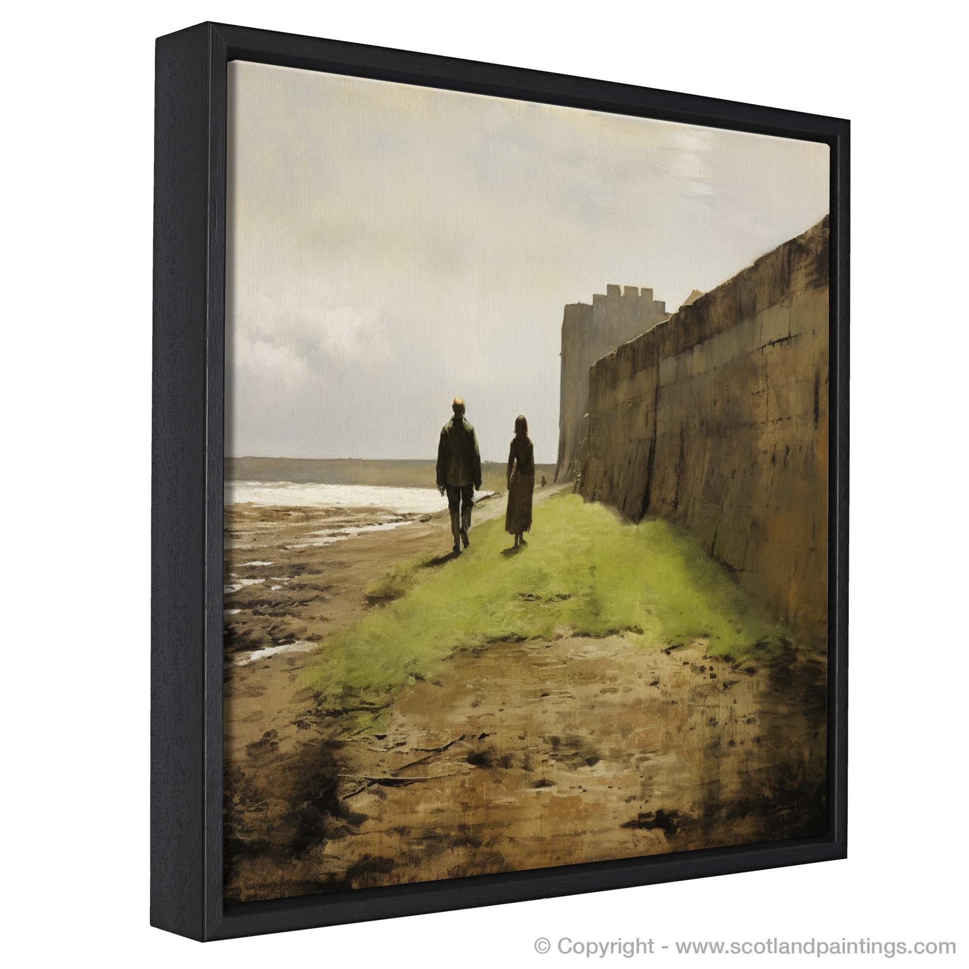 Journey with us through the overcast skies and the gentle, unspoken romance of this evocative scene, set against the historic backdrop of Berwick-upon-Tweed. Two figures are depicted meandering along the age-worn paths by the formidable walls that have stood the test of time. These ancient battlements bear witness to countless tales, their robust sandstone surface now a canvas for shadows and whispers of days gone by.
