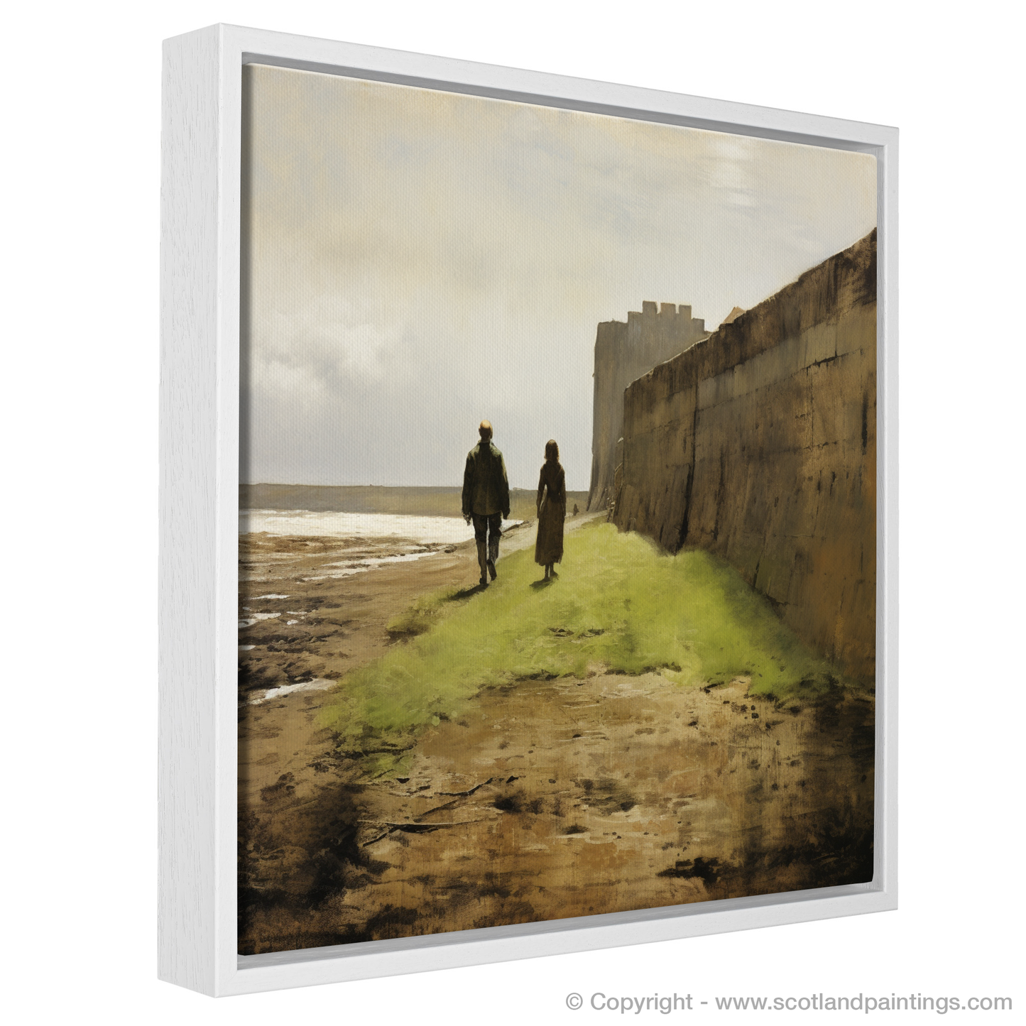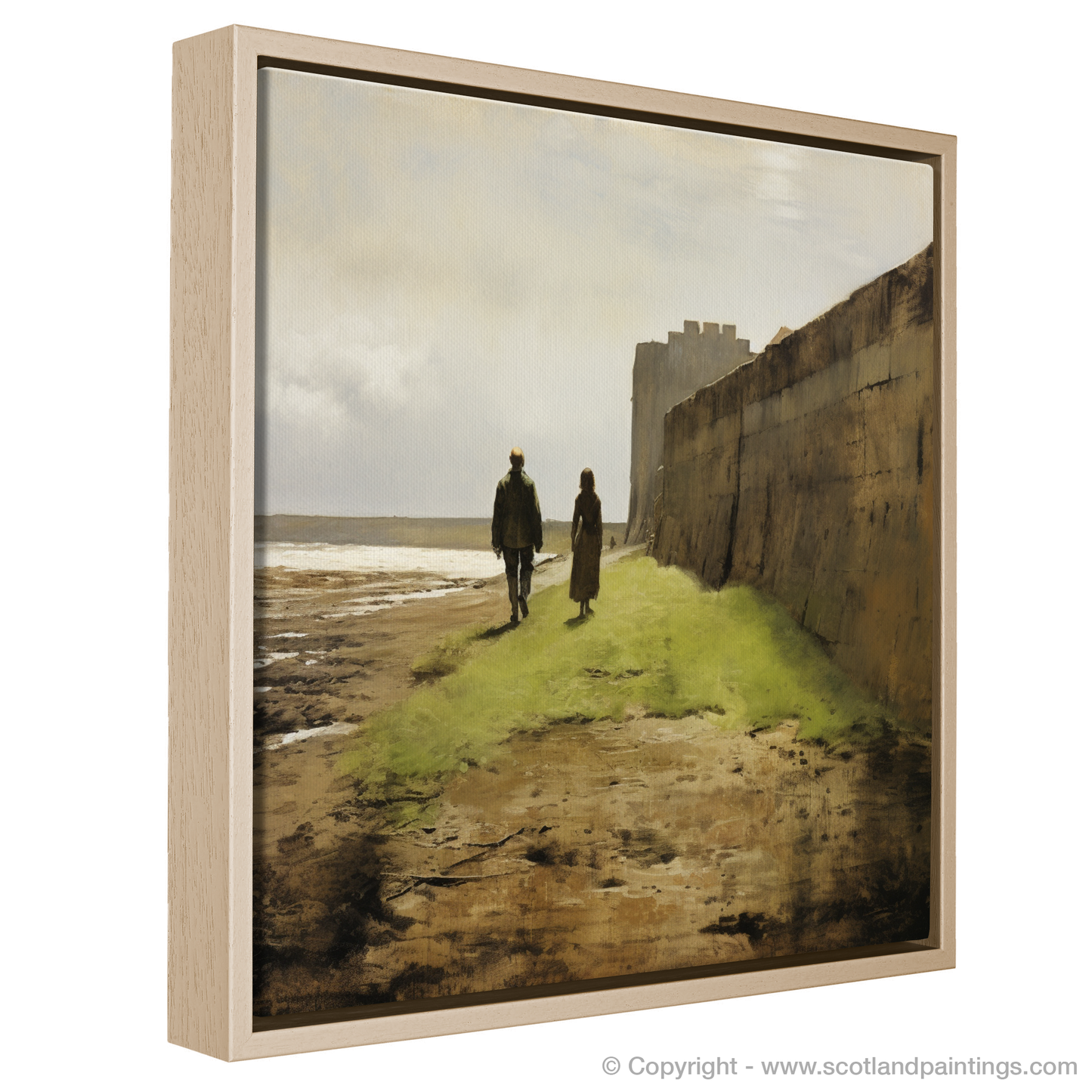 The print captures the essence of realism, inviting the viewer into a moment steeped in tranquillity and a sense of enduring love. The couple, small against the expanse of the landscape, are portrayed in a naturalistic manner—cloaked in garments that sway with their unhurried steps and the gentle coastal breeze.