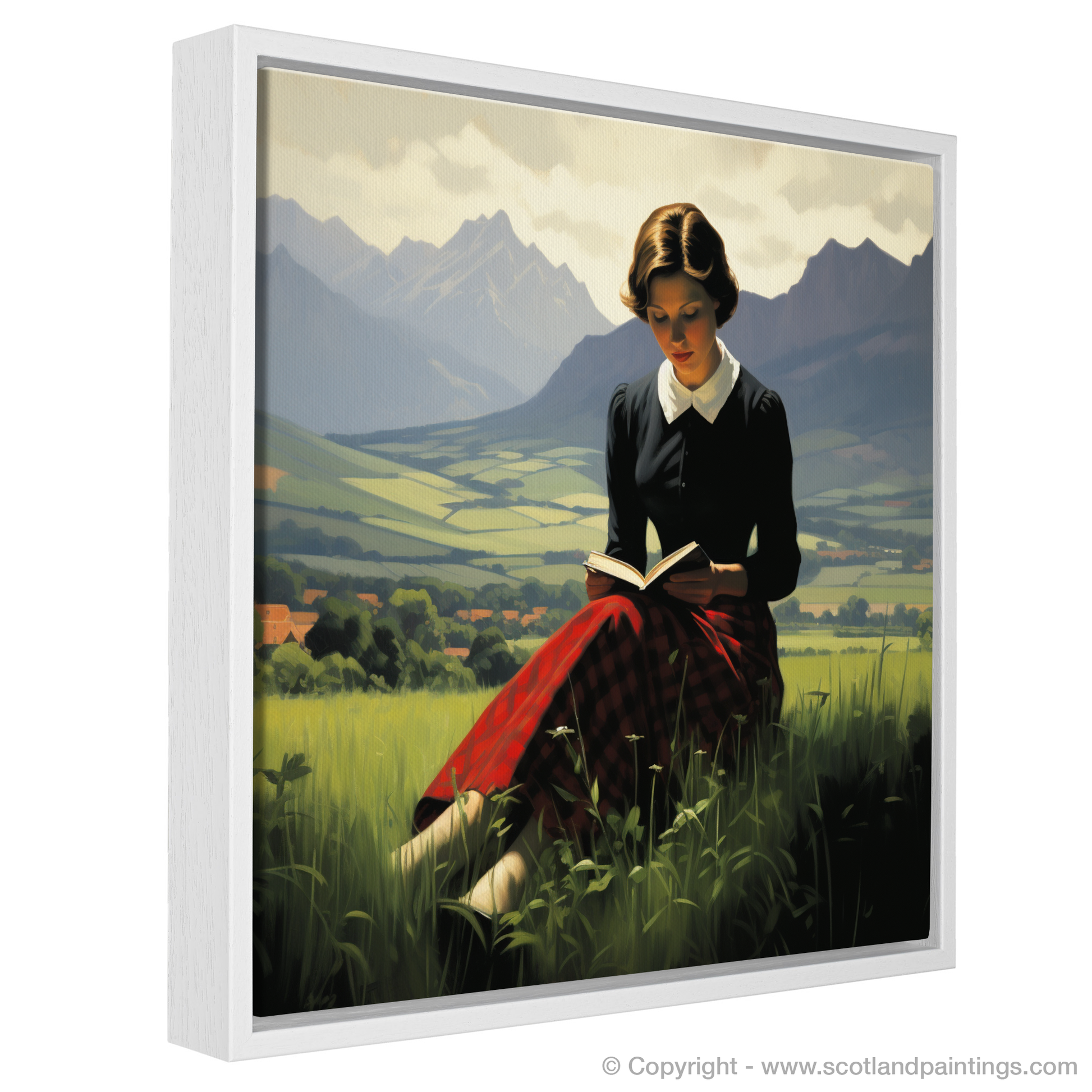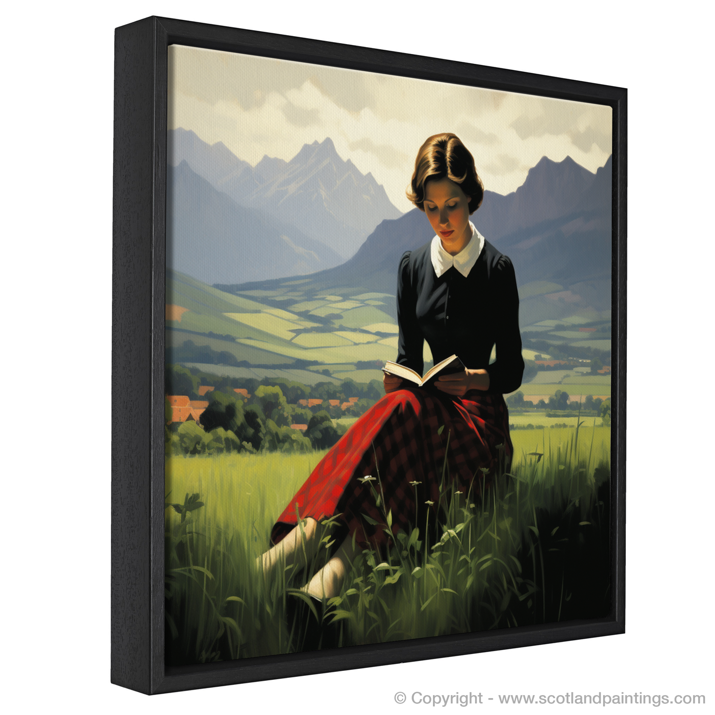 The verdant hues of the grass she sits upon seem to whisper with the gentle Highlands breeze, a soft caress against her poised figure. The woman, engrossed in the pages of her diary, becomes the embodiment of tranquility and introspection. Her delicate posture and absorbed mien invite onlookers to ponder the thoughts being penned, the stories that dance between lines in the shadow of Scotland's famed mountain.