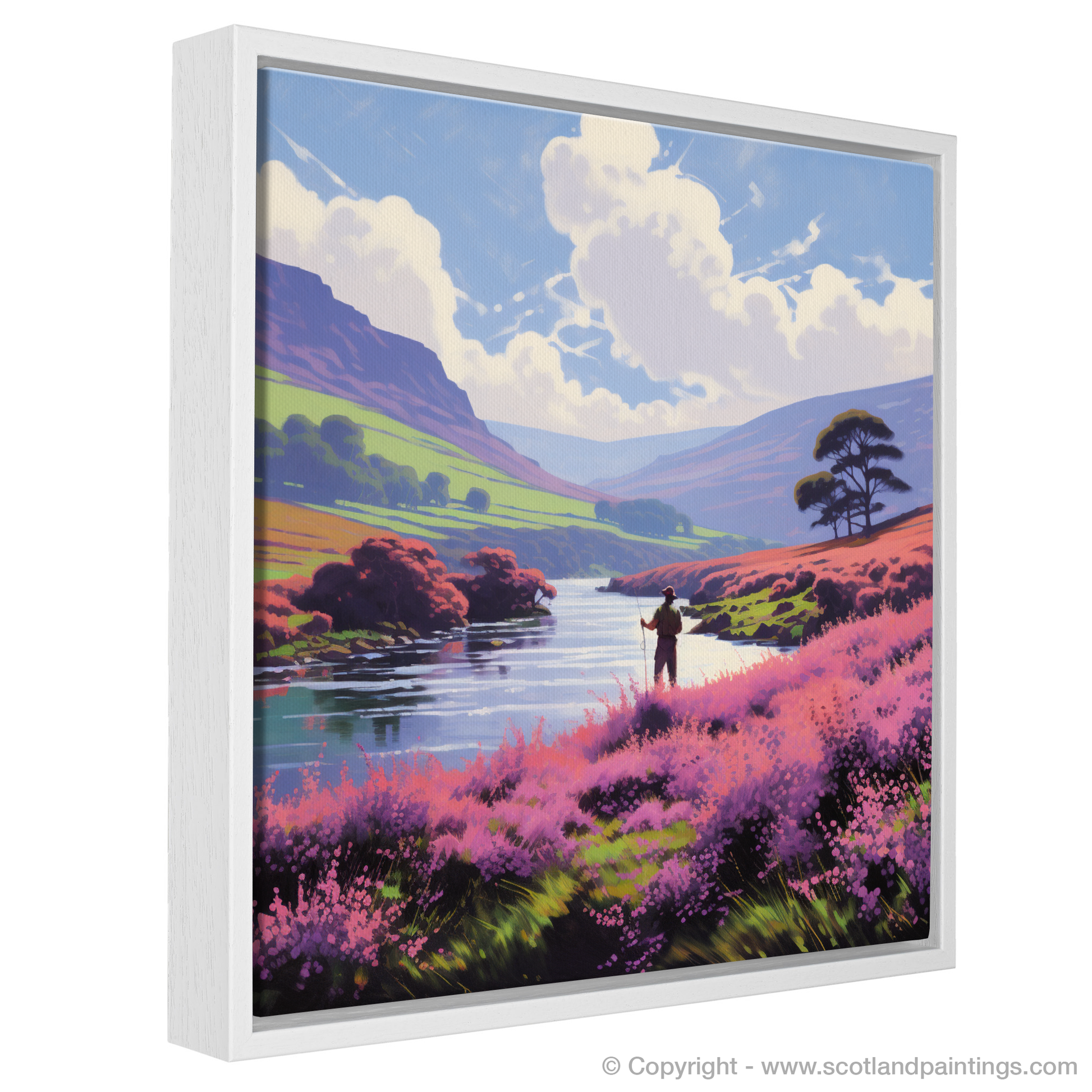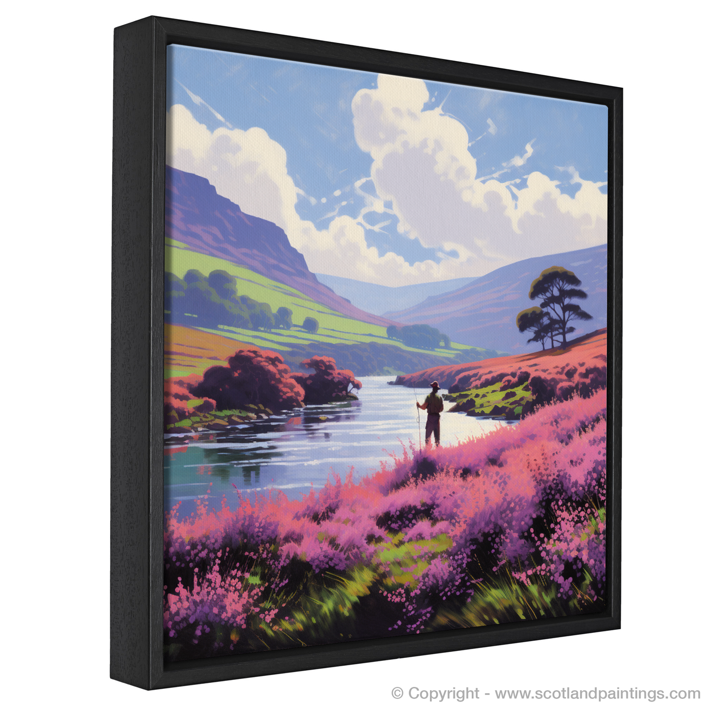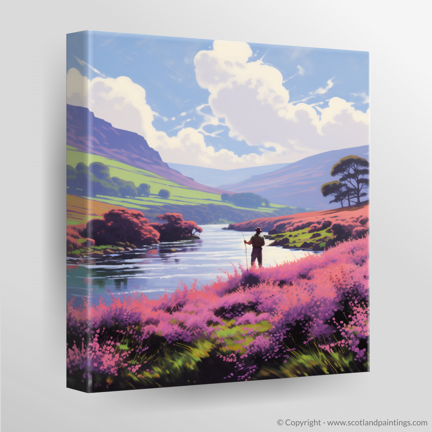 Immerse yourself in the serene beauty of the Scottish countryside with our captivating print. The scene unfolds along the tranquil banks of the River Conon, where a lone man is engrossed in the timeless art of fly fishing. Framed by the gentle undulations of the rural landscape, he stands amid a flourish of heather in full bloom, its vibrant purple hues painting a contrast against the luscious greens of the surrounding hills.