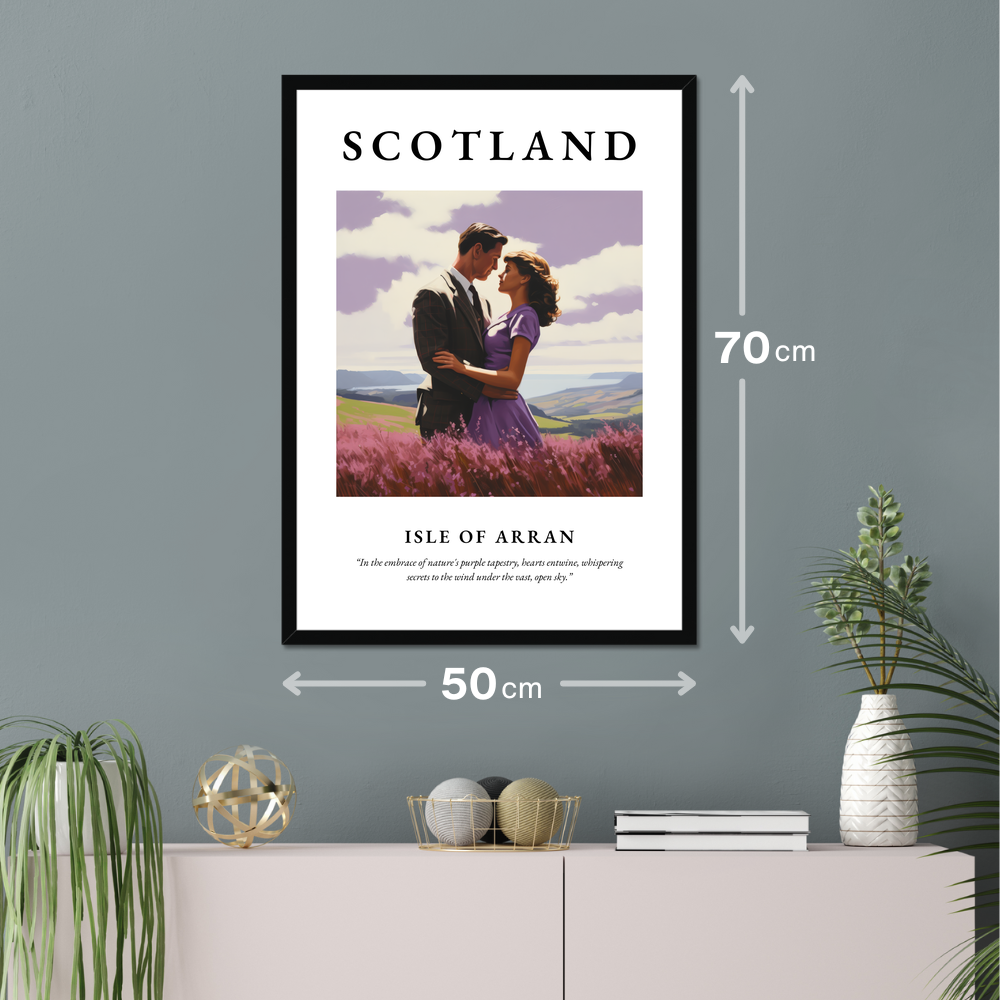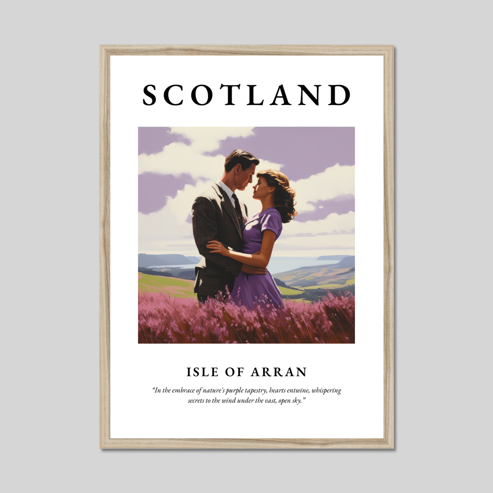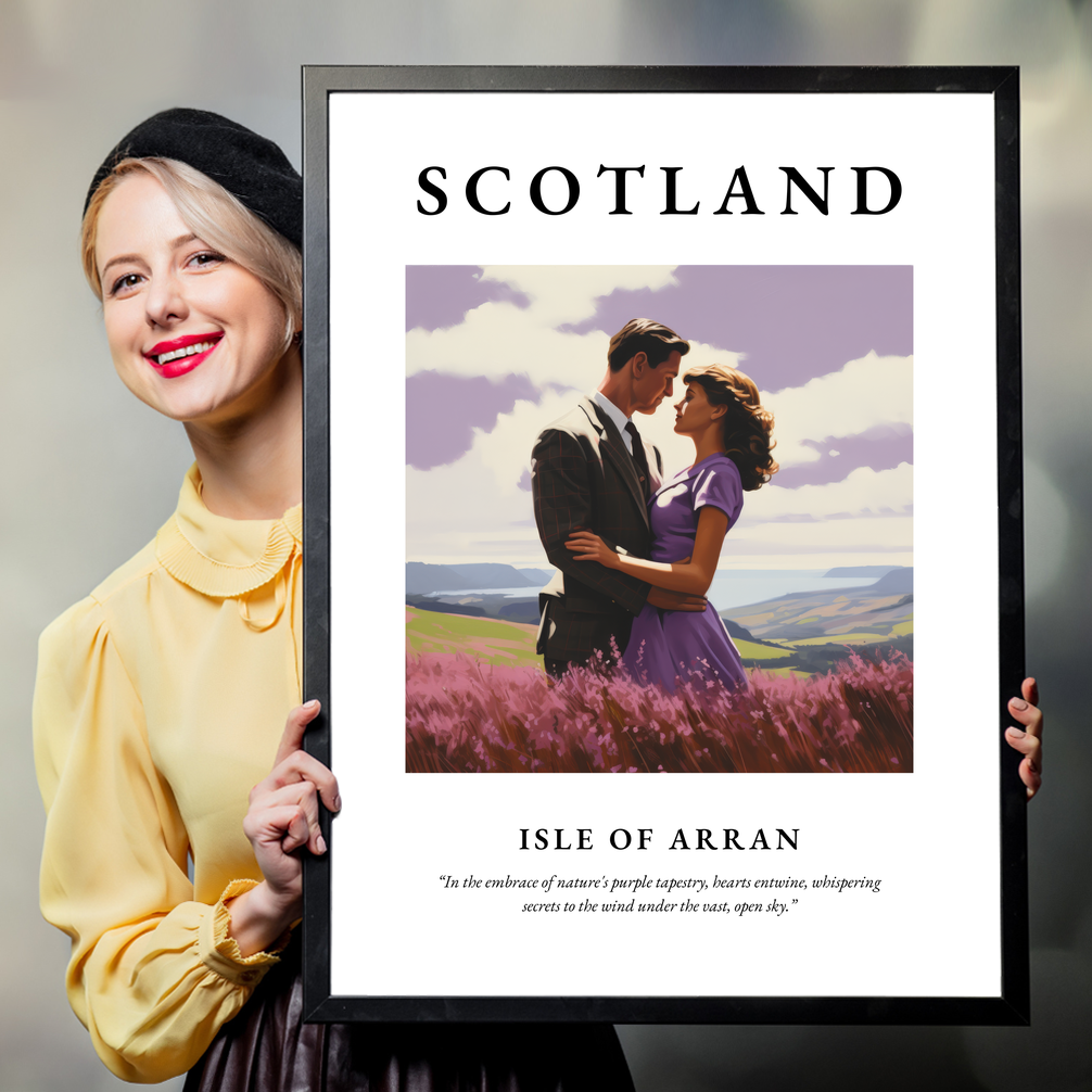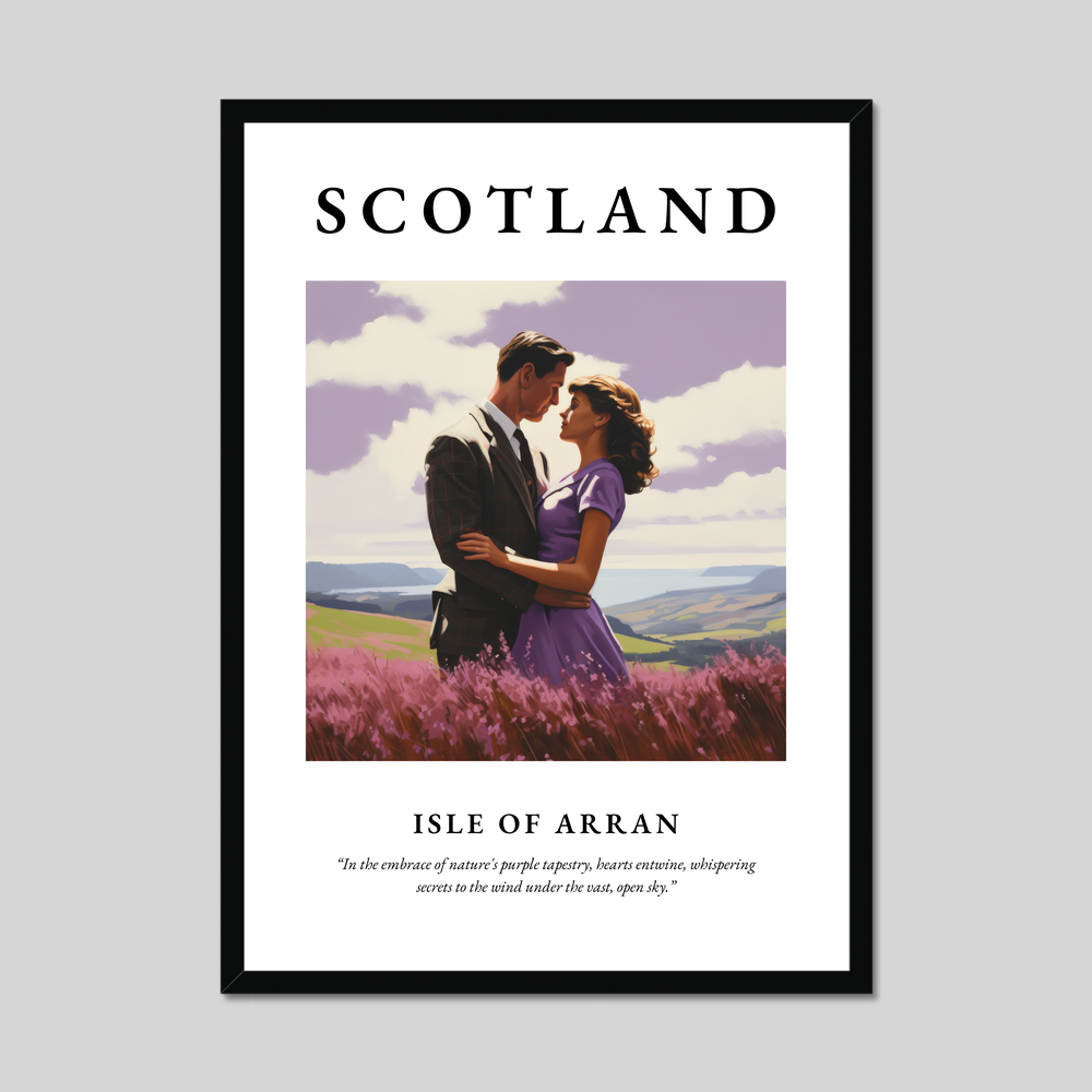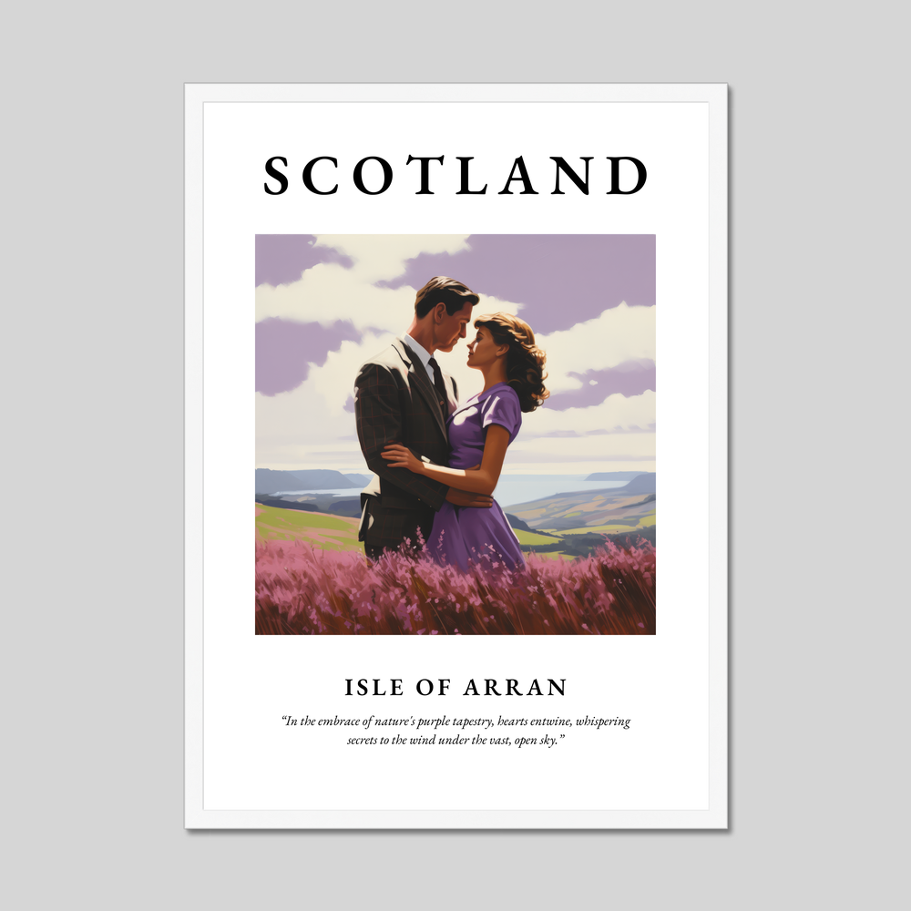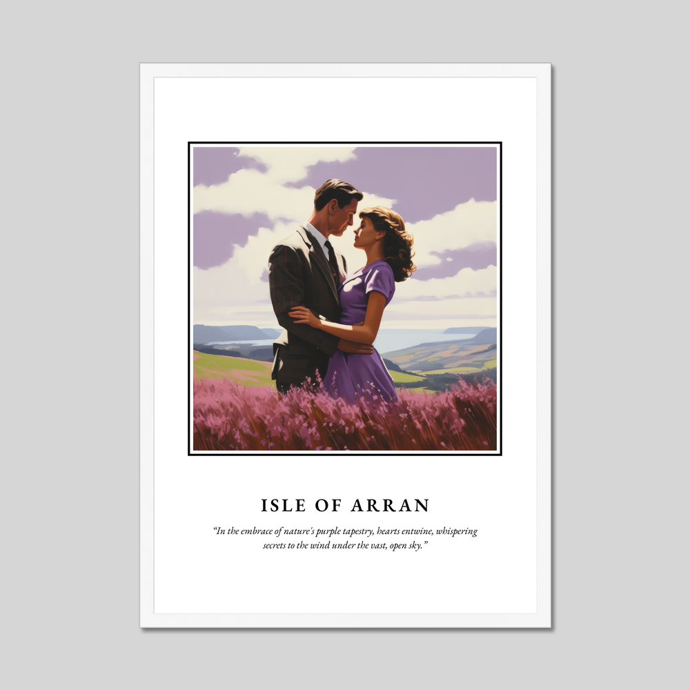 Dominated by the bold lettering of "SCOTLAND," the poster captures the heart of the Isle of Arran in stunning realism. The painting showcases a couple embracing amidst a field of vibrant purple heather, with the rolling hills and serene sea in the background. The atmospheric scene is a perfect celebration of love and nature, brought to life with meticulous detail and rich colours. Below the painting, the poignant quote “In the embrace of nature's purple tapestry, hearts entwine, whispering secrets to the wind under the vast, open sky” adds a poetic touch, enhancing the romantic mood.
