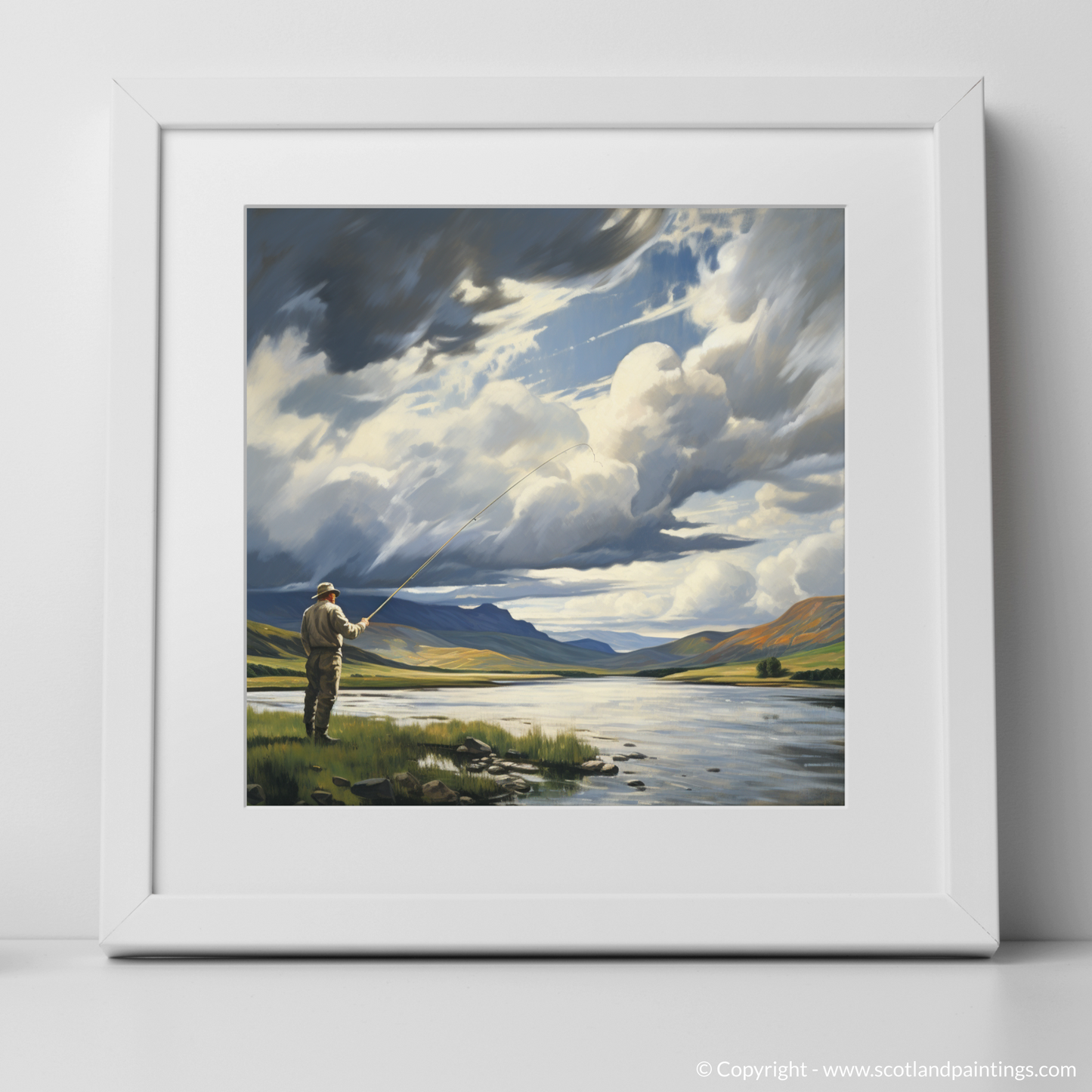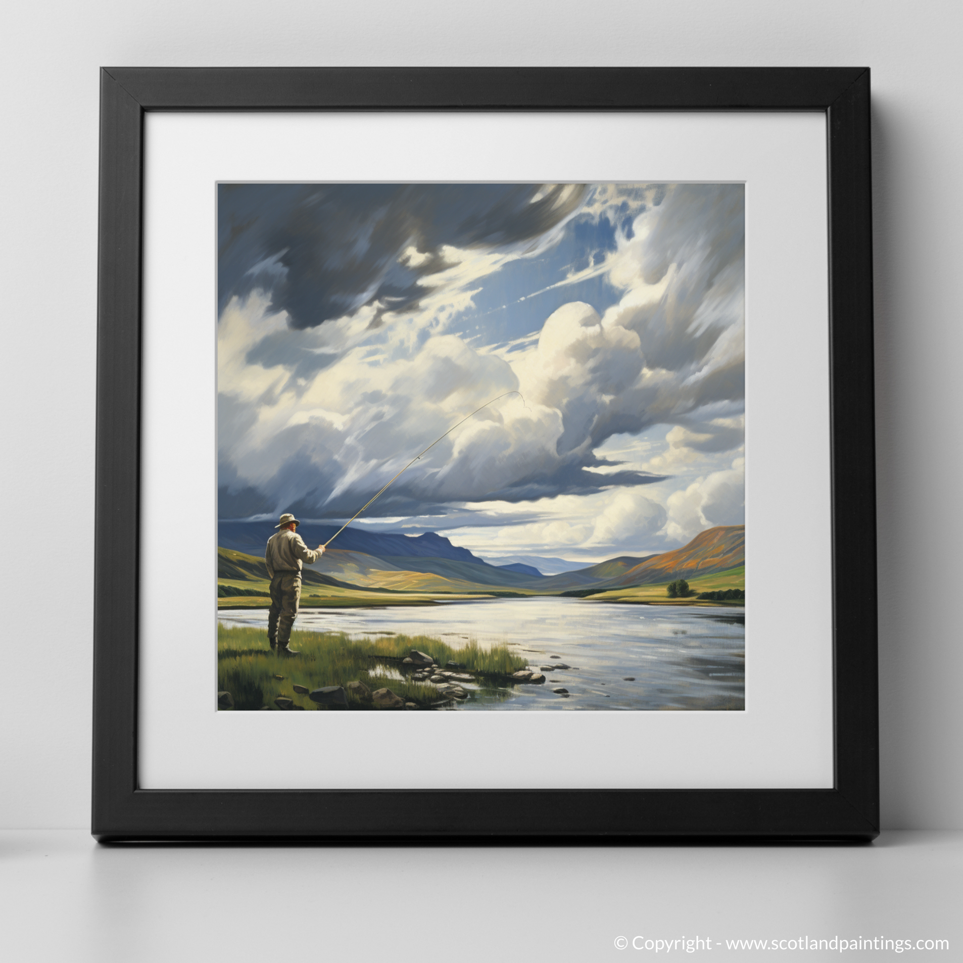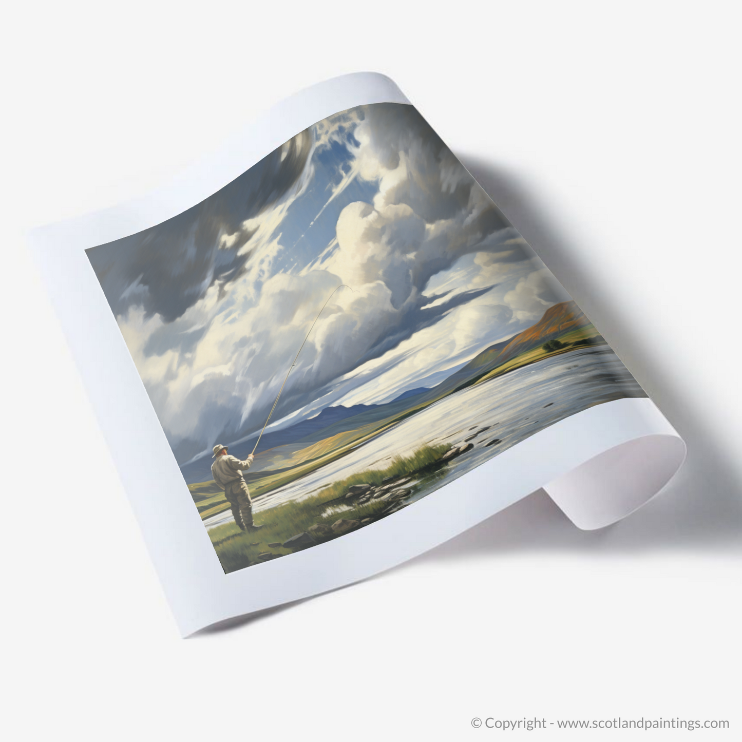 Immerse your space with the serene ambiance of the Scottish Highlands with this evocative print. An angler, immersed in the timeless ritual of fly fishing, stands amidst the tranquil waters of Loch Leven. His focus is unyielding as he expertly casts his line under the contemplative expanse of a brooding, cloud-laden sky.