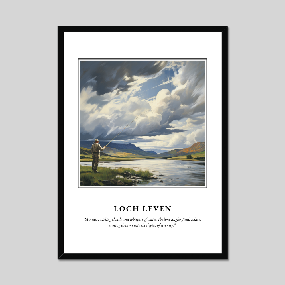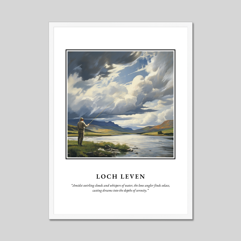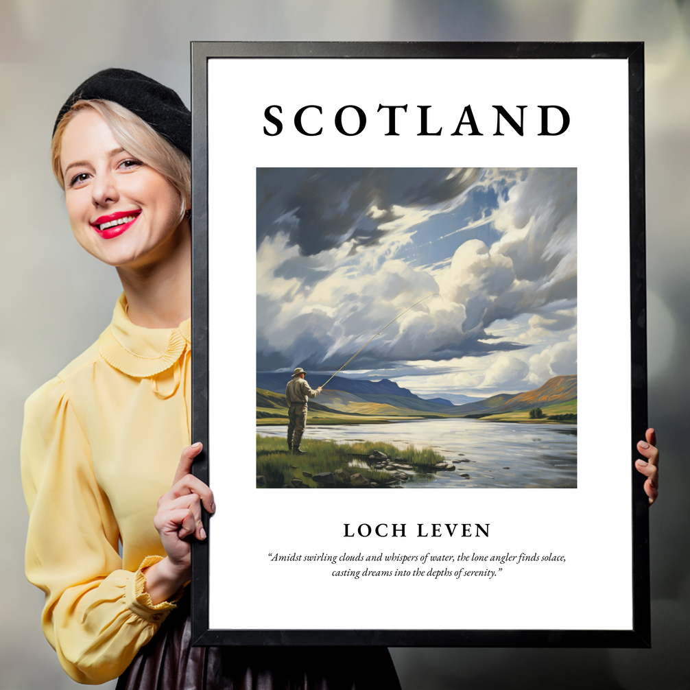 The top proudly displays "SCOTLAND" in bold lettering, drawing you into the serene world depicted in the painting below. The artwork captures the tranquil beauty of Loch Leven in stunning realism—a place where the swirling clouds mirror the enigmatic whispers of water. A lone angler stands amidst this natural grandeur, casting dreams into the depths of serenity, surrounded by vibrant greens and moody skies. This piece delivers an immersive experience, effortlessly transforming any wall into a window to the enchanting Scottish Highlands.