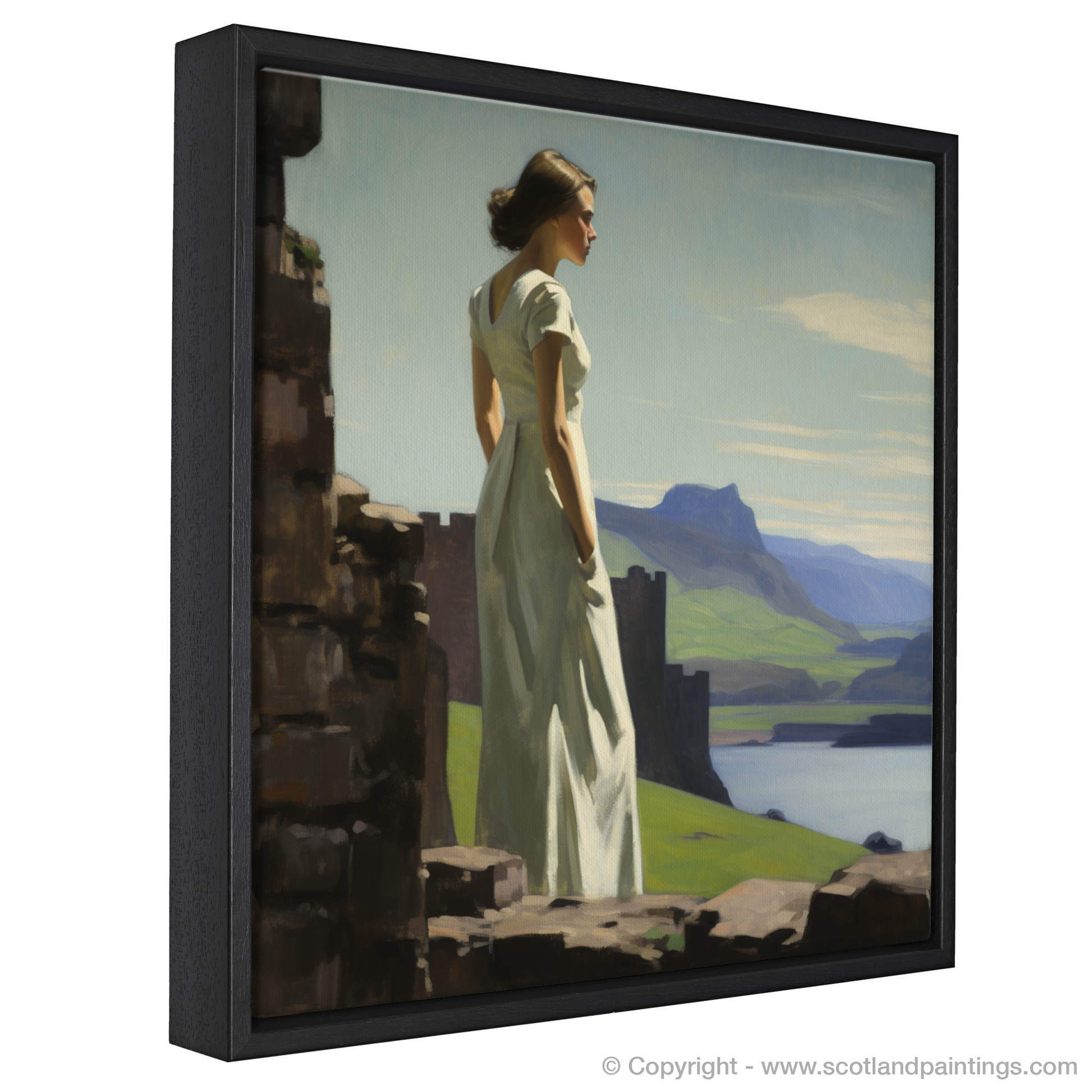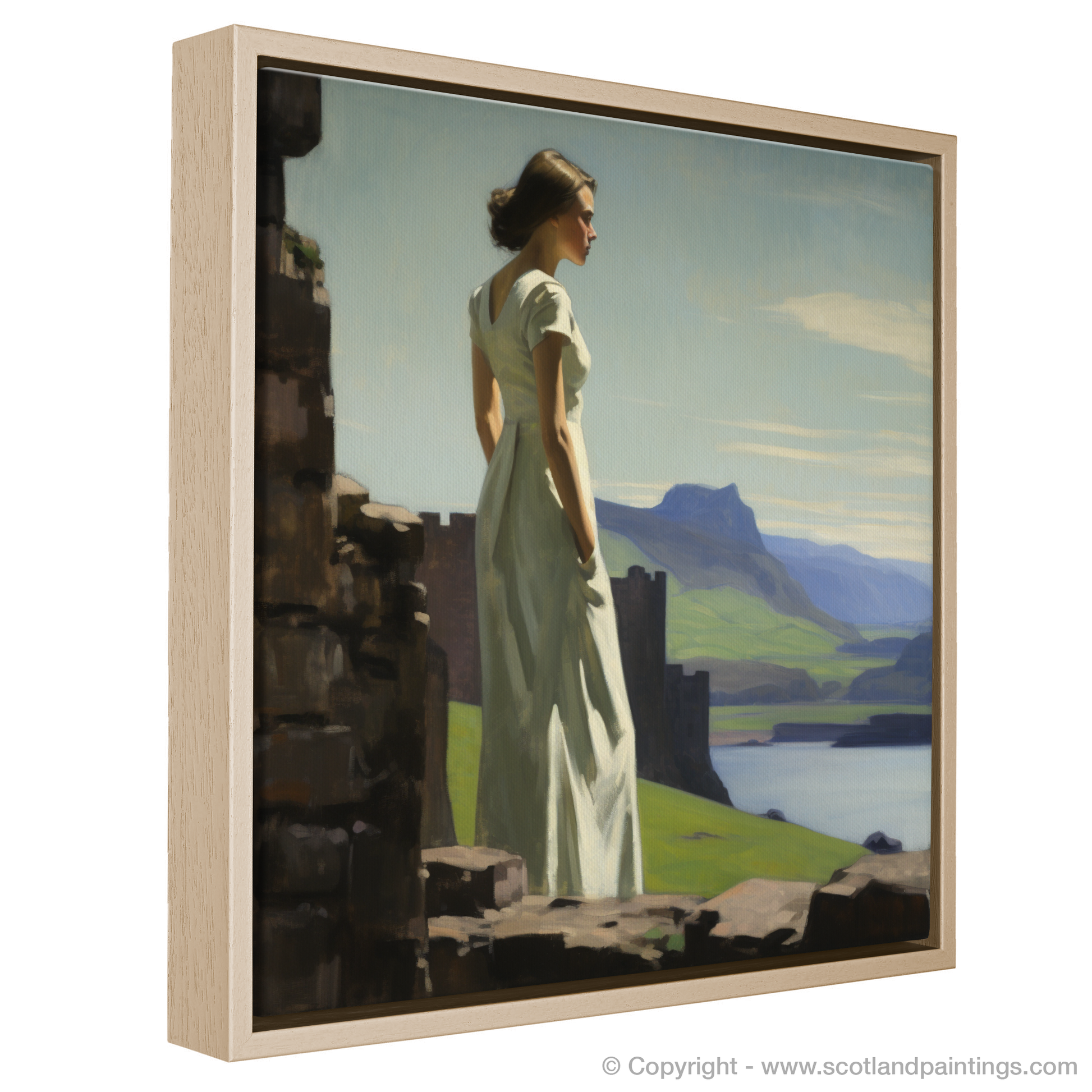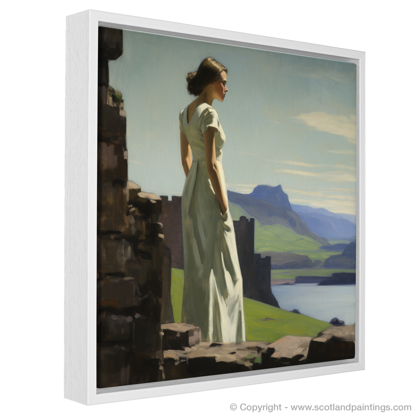 Captured within this exquisite print, a timeless scene unfolds, inviting the viewer to a serene moment overlooking the majestic ruins of Urquhart Castle. The central figure, a woman clad in an ethereal white dress, stands poised against the backdrop of rugged highlands and the sweeping expanses of calm waters. Her profile is a study of contemplation, her gaze drawn to the distant horizon where the past whispers through the crumbled vestiges of history.