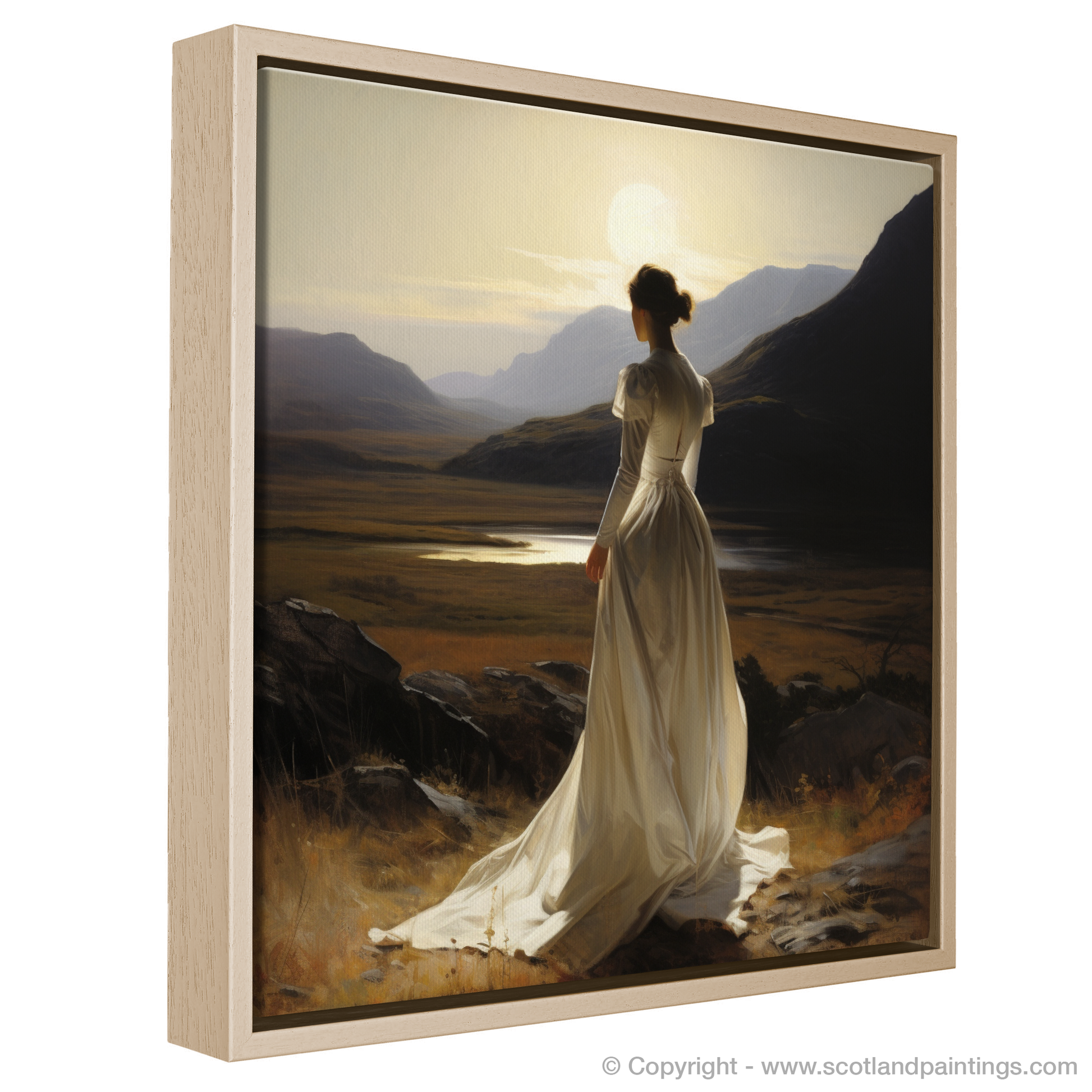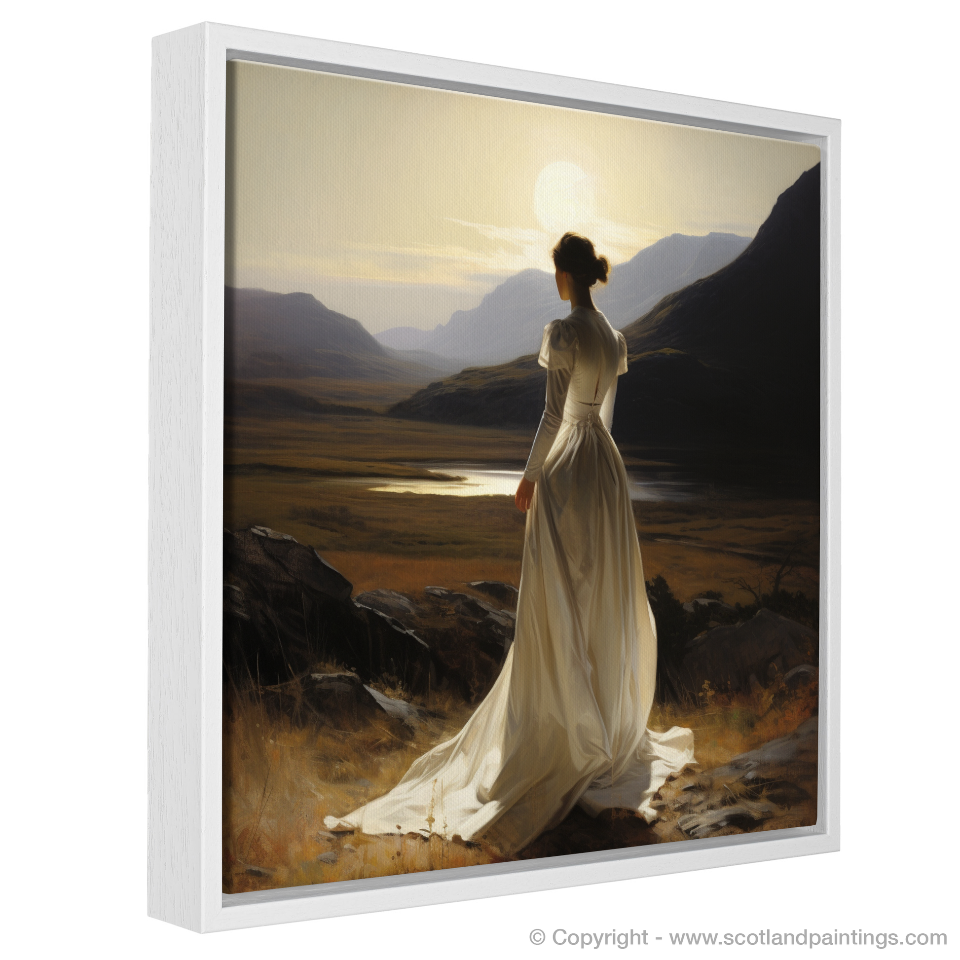 Bathed in the enchanting amber glow of a setting sun, this evocative print captures a fleeting moment of tranquillity set against the majestic backdrop of the Three Sisters of Glencoe. The protagonist of this serene scene is a solitary figure garbed in a flowing white dress that cascades like a gentle waterfall over craggy, heather-strewn ground. Her pose is contemplative, her gaze lost in the dusky hues and the soft luminescence that play upon the tranquil loch and the rolling, timeless Highlands.