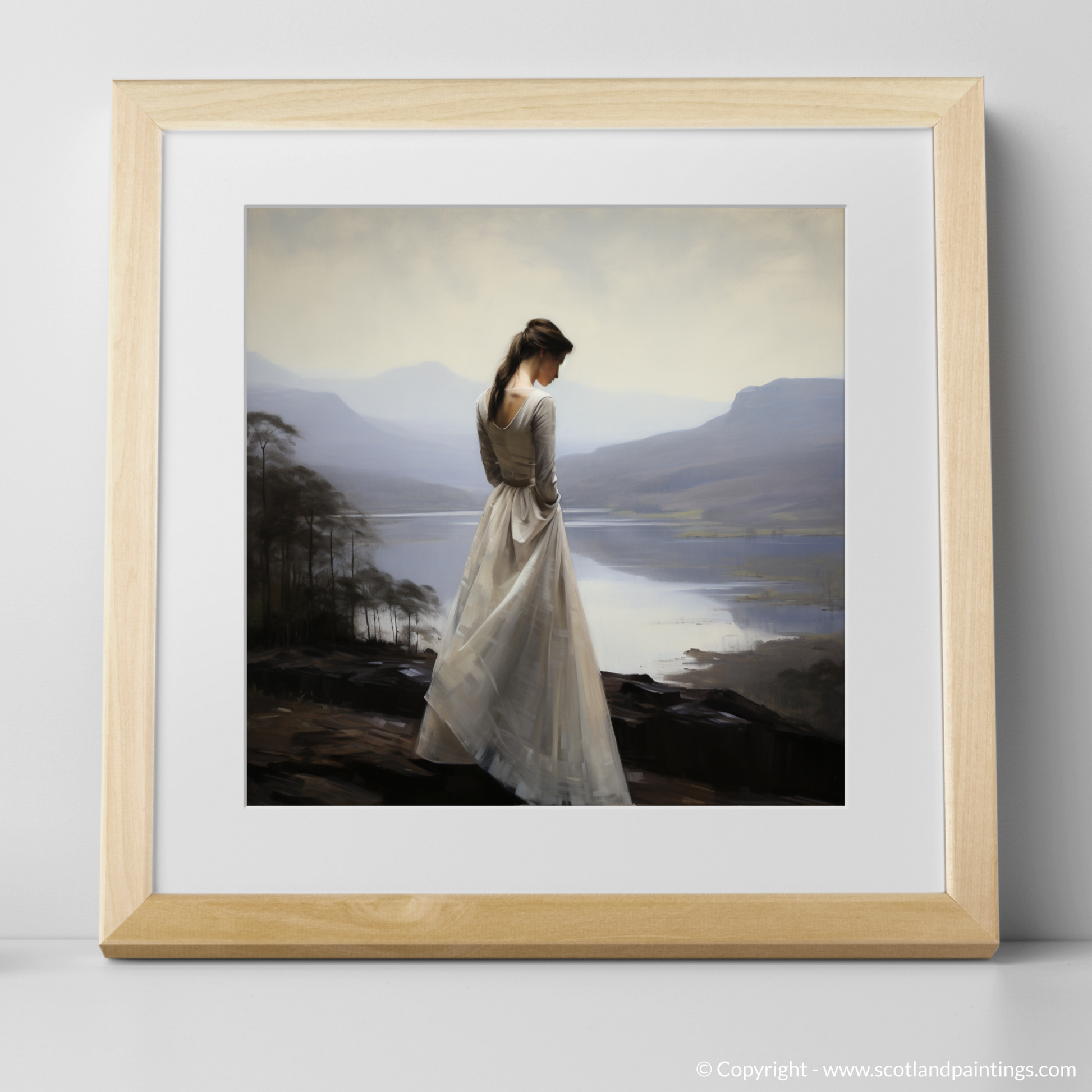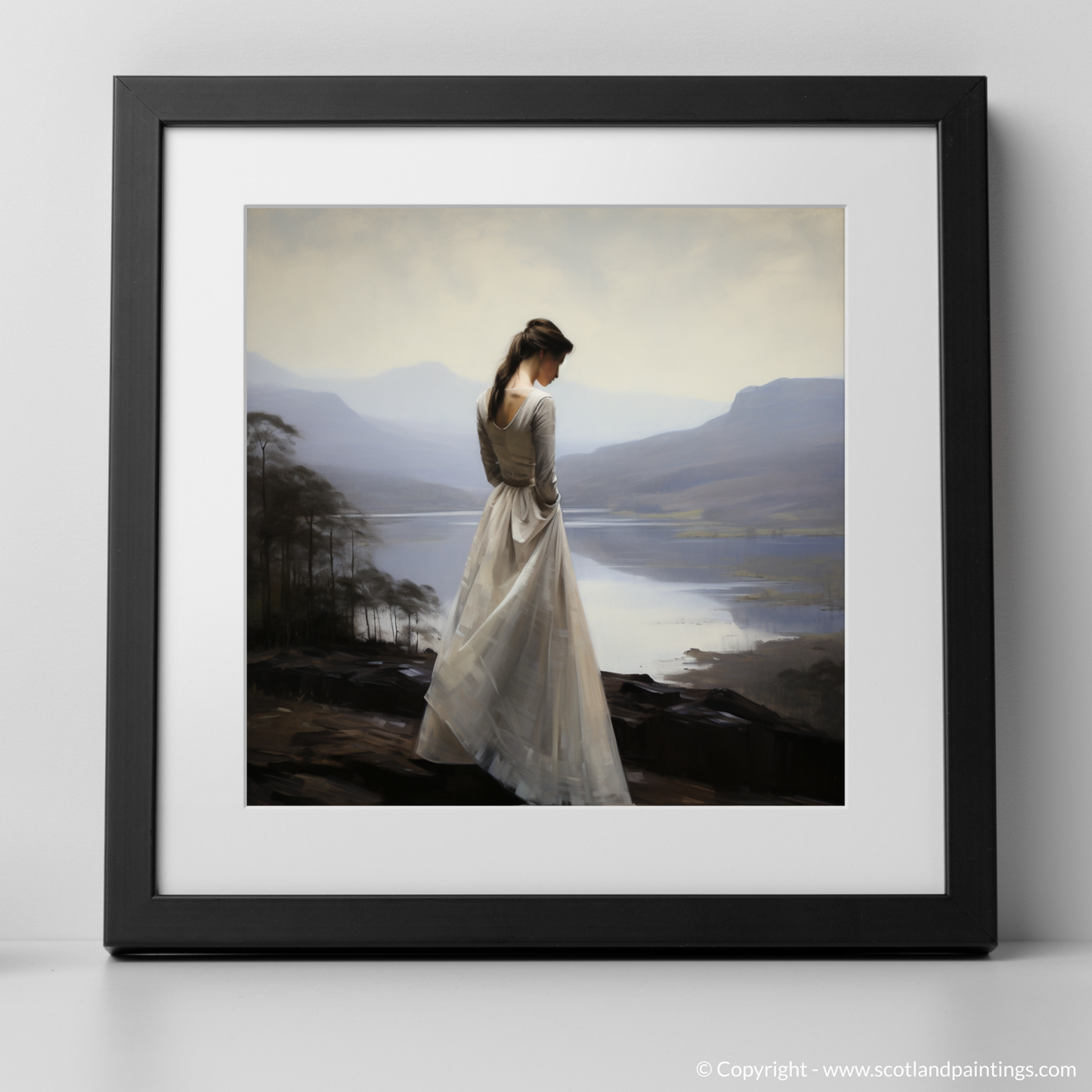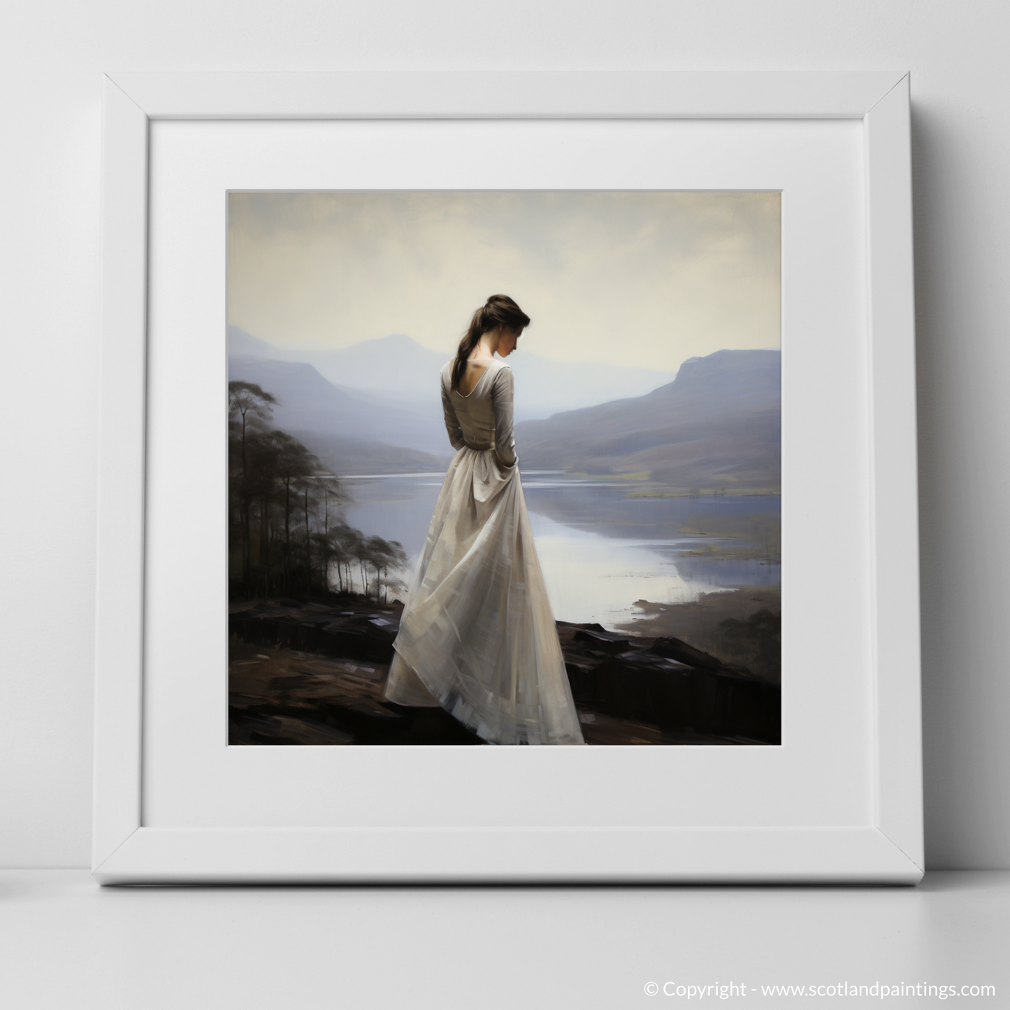 Before you is a serene vista where tranquillity and subtle grandeur converge; our esteemed print depicts a graceful woman swathed in a flowing white dress that captures the pristine essence of peace. She stands poised on a rocky promontory, her gaze cast toward the tranquil waters of Loch Katrine. The ethereal tones of her gown echo the soft, glistening surface of the loch, creating a harmonious dance between the figure and the landscape.