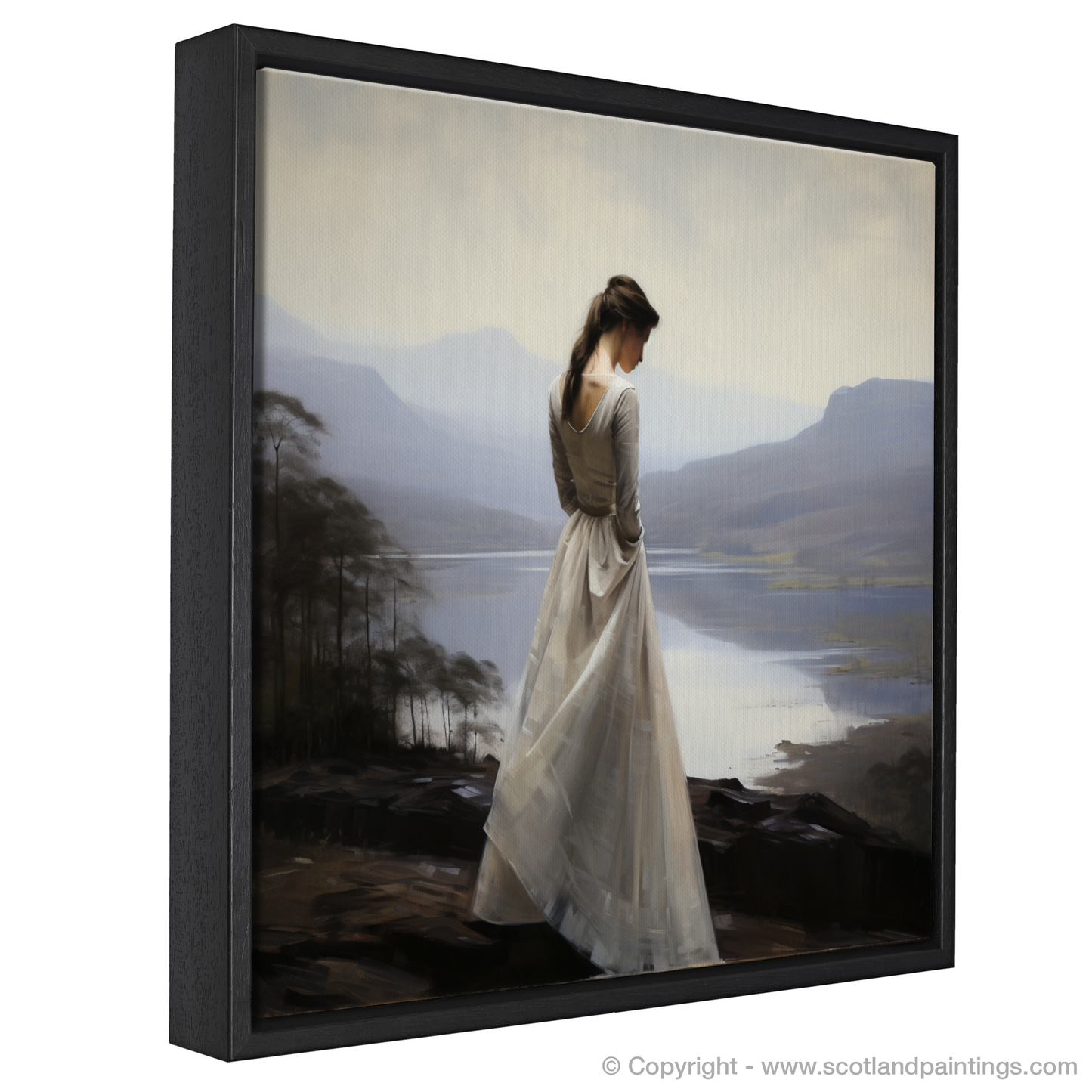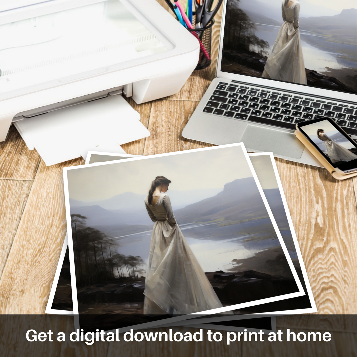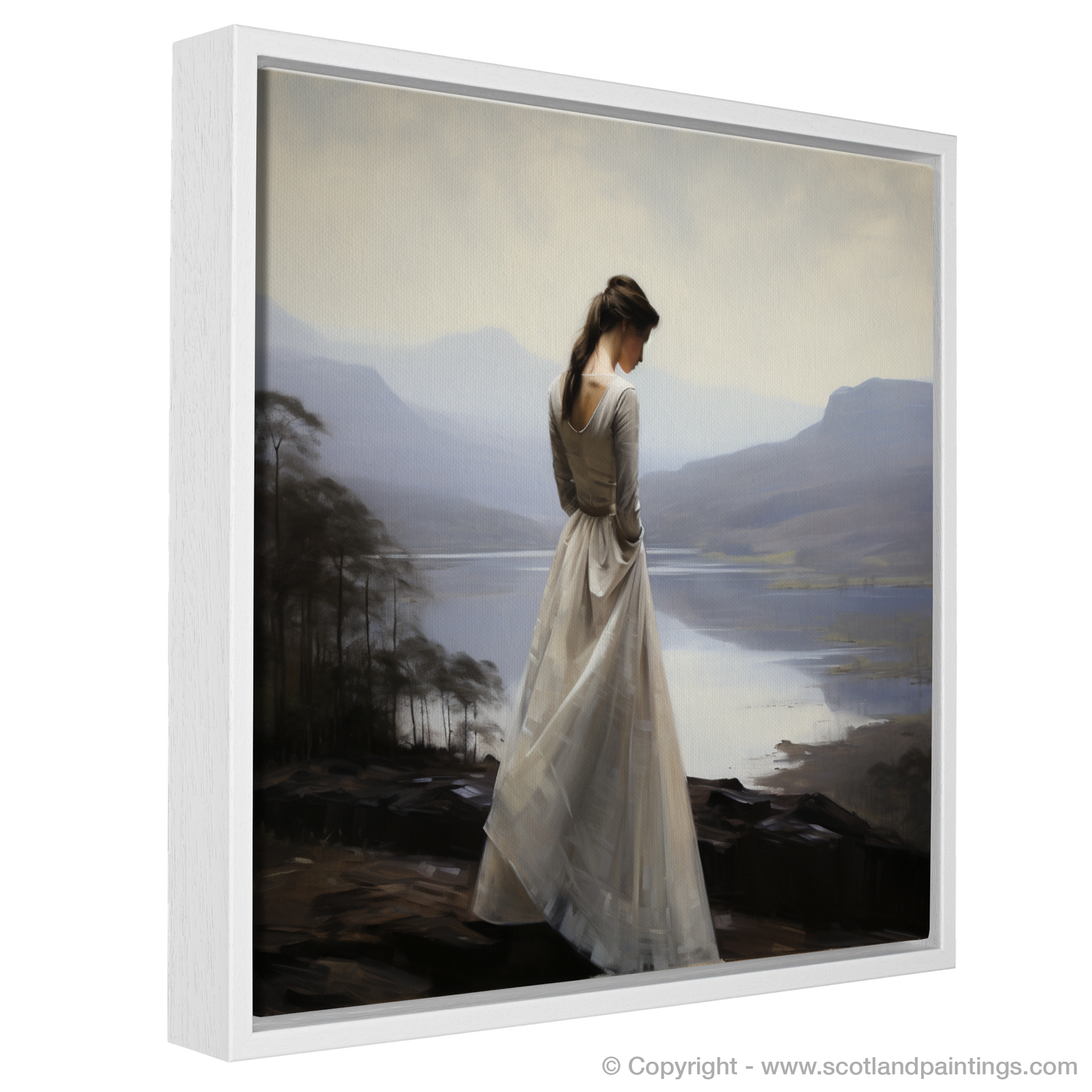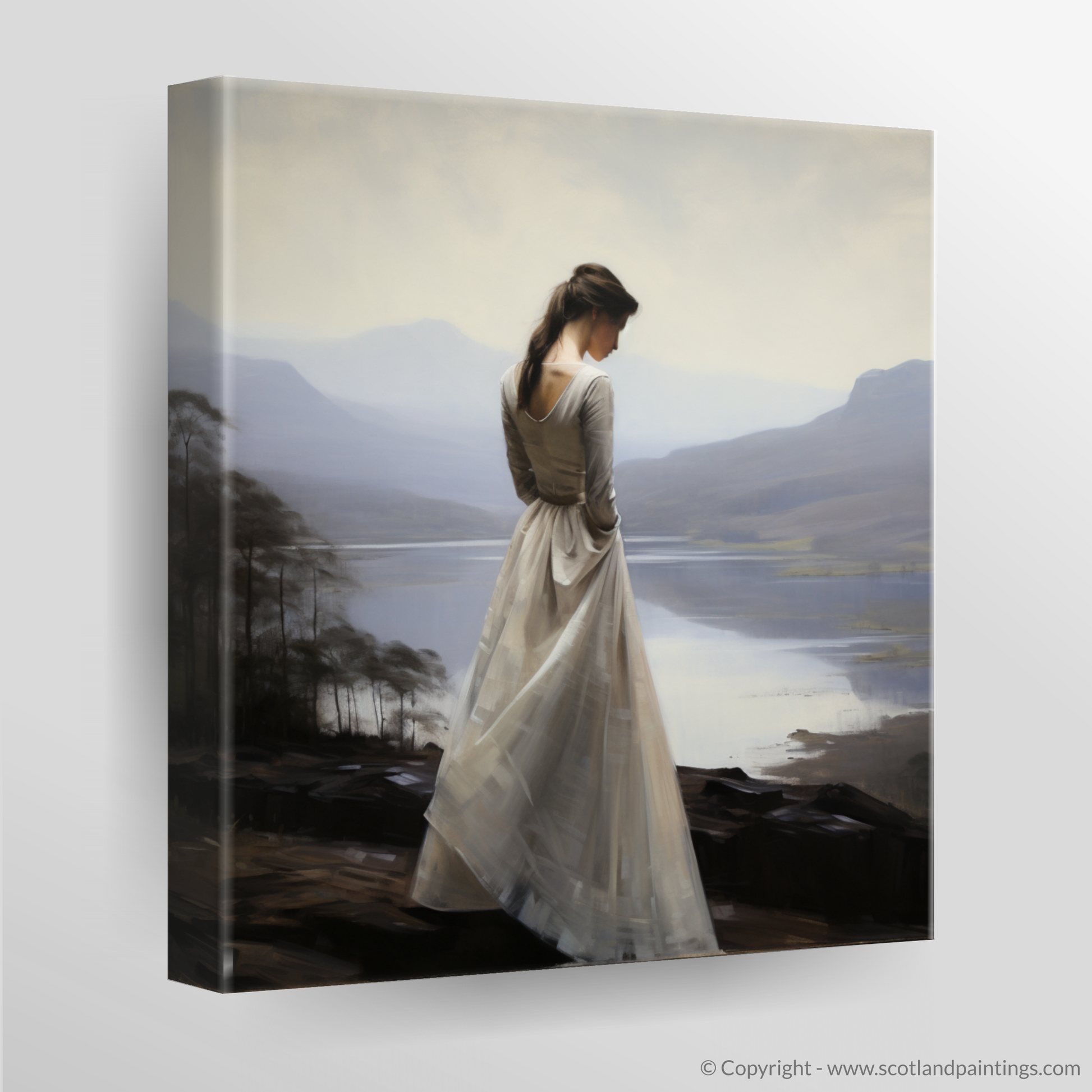 Before you is a serene vista where tranquillity and subtle grandeur converge; our esteemed print depicts a graceful woman swathed in a flowing white dress that captures the pristine essence of peace. She stands poised on a rocky promontory, her gaze cast toward the tranquil waters of Loch Katrine. The ethereal tones of her gown echo the soft, glistening surface of the loch, creating a harmonious dance between the figure and the landscape.