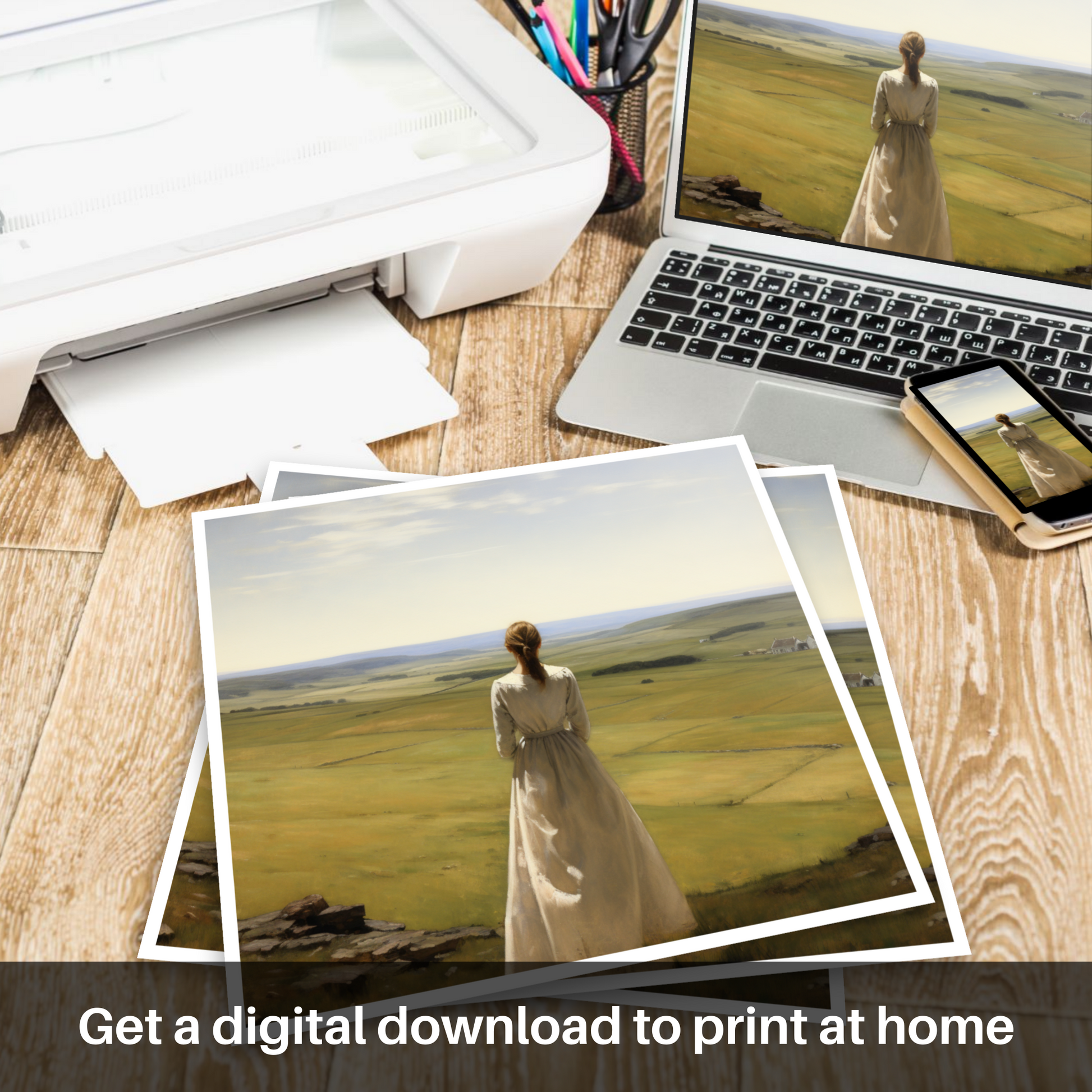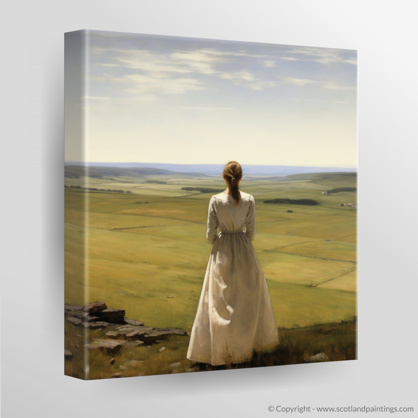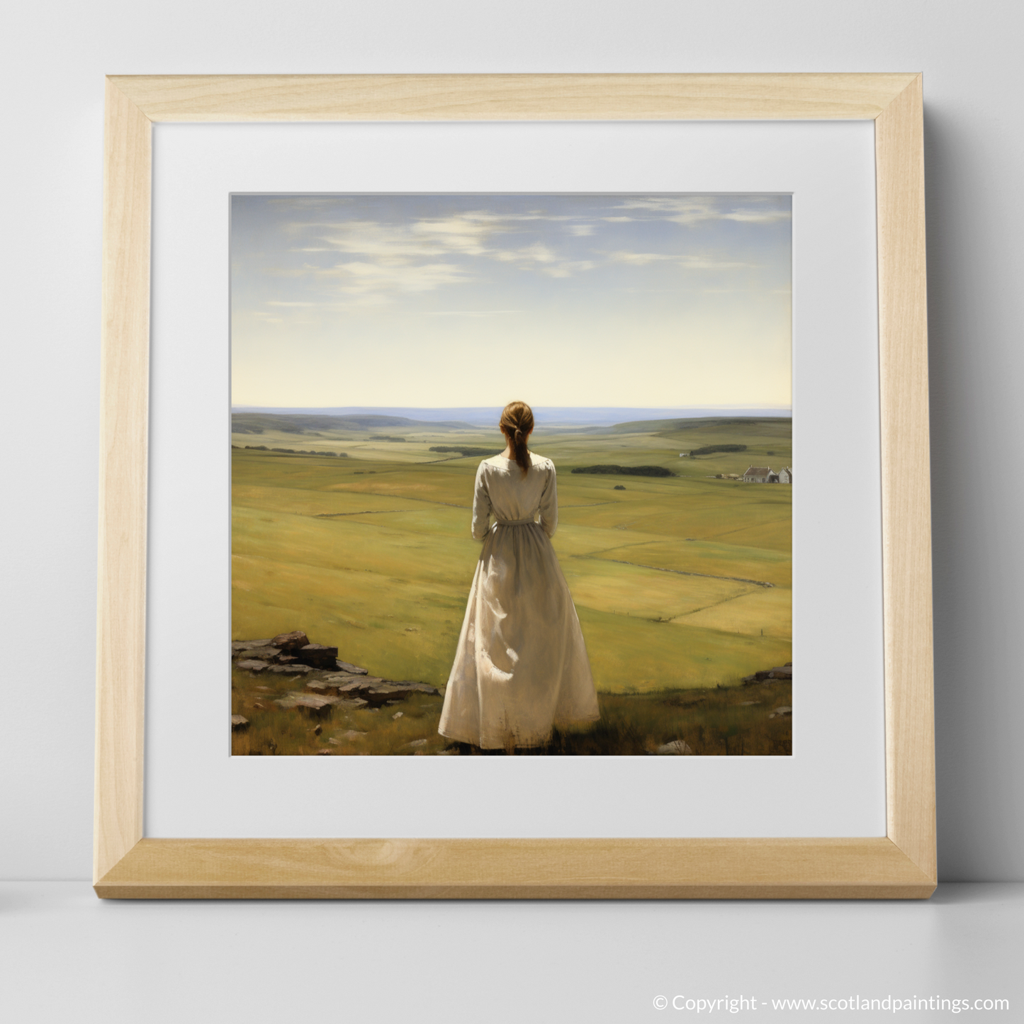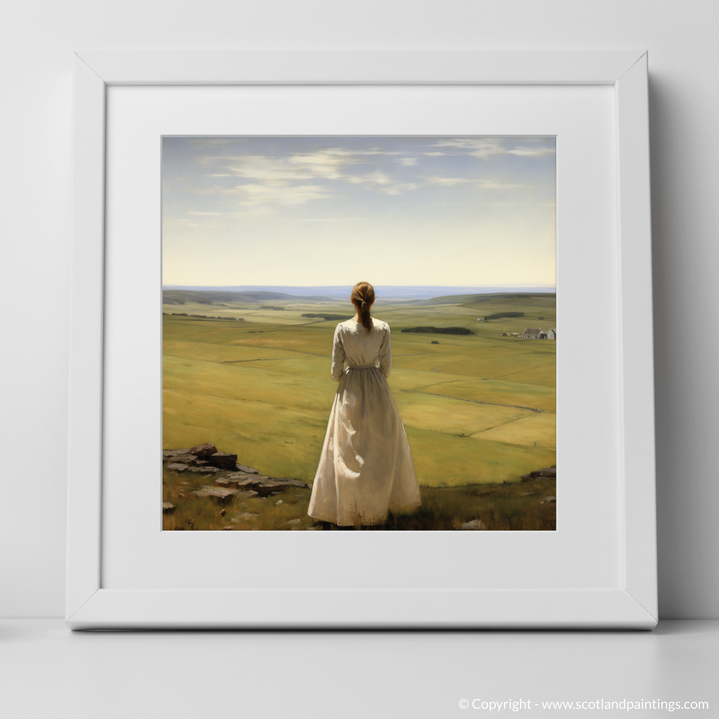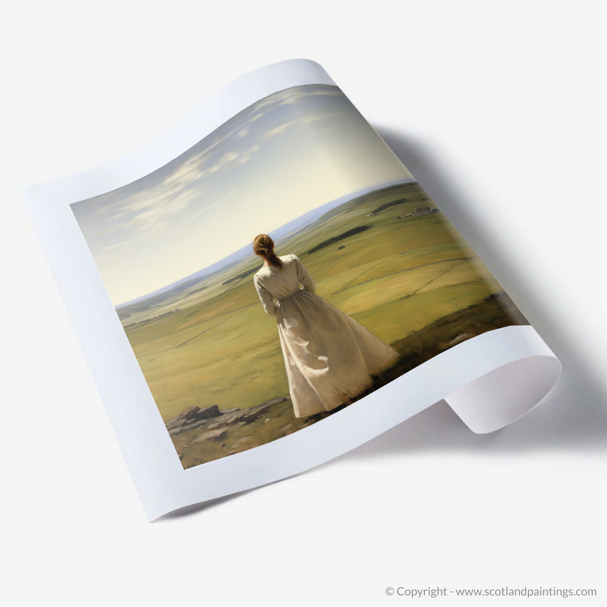 Captured within this evocative print, a solitary woman clad in a flowing white dress stands amidst the tranquillity of the Scottish Borders, her gaze lost in the vast expanse of rolling hills that unfurl from the vantage point of Scott's View. The pastoral elegance of the scene is rendered with meticulous detail, as the realism style brings to life the rustic charm of the Borders.