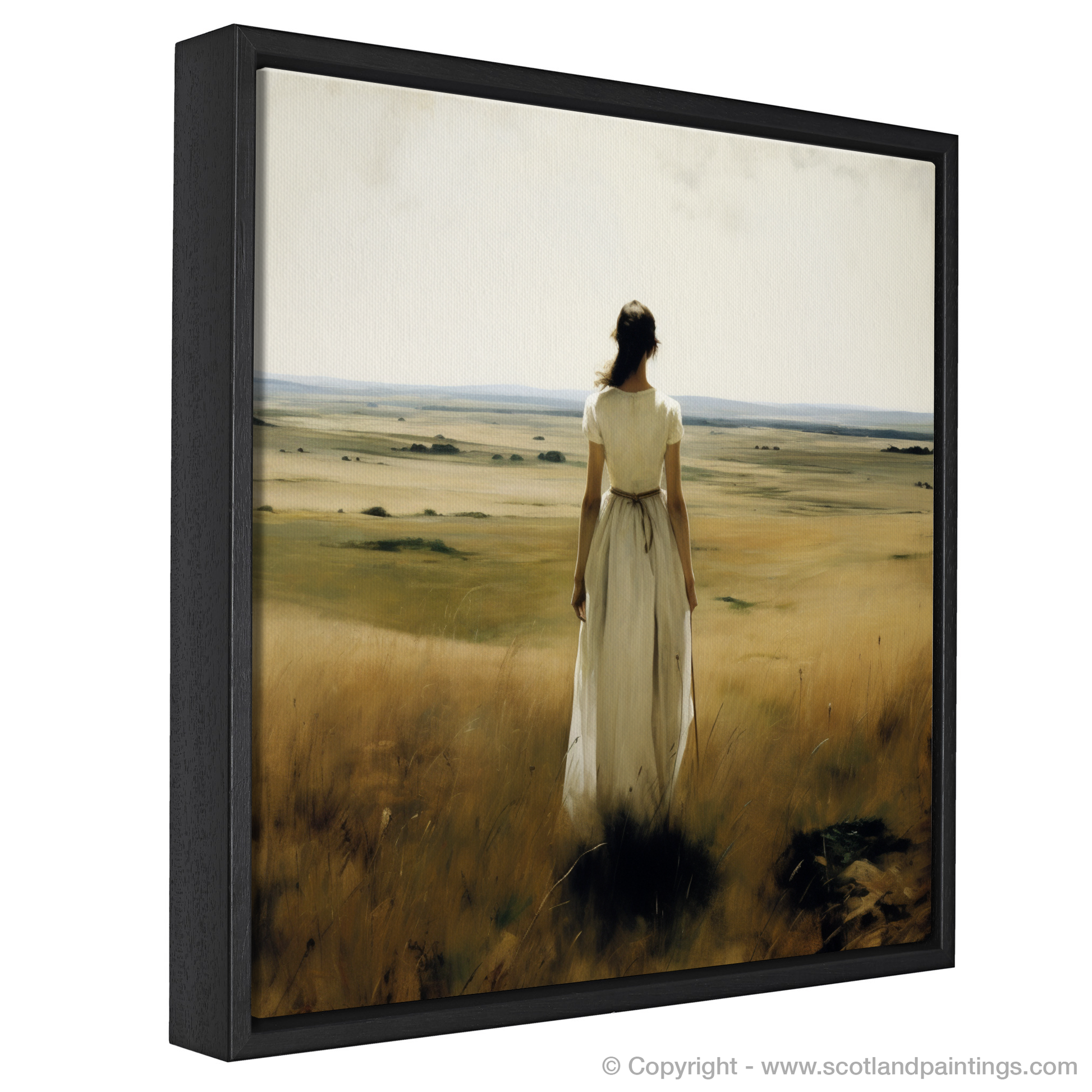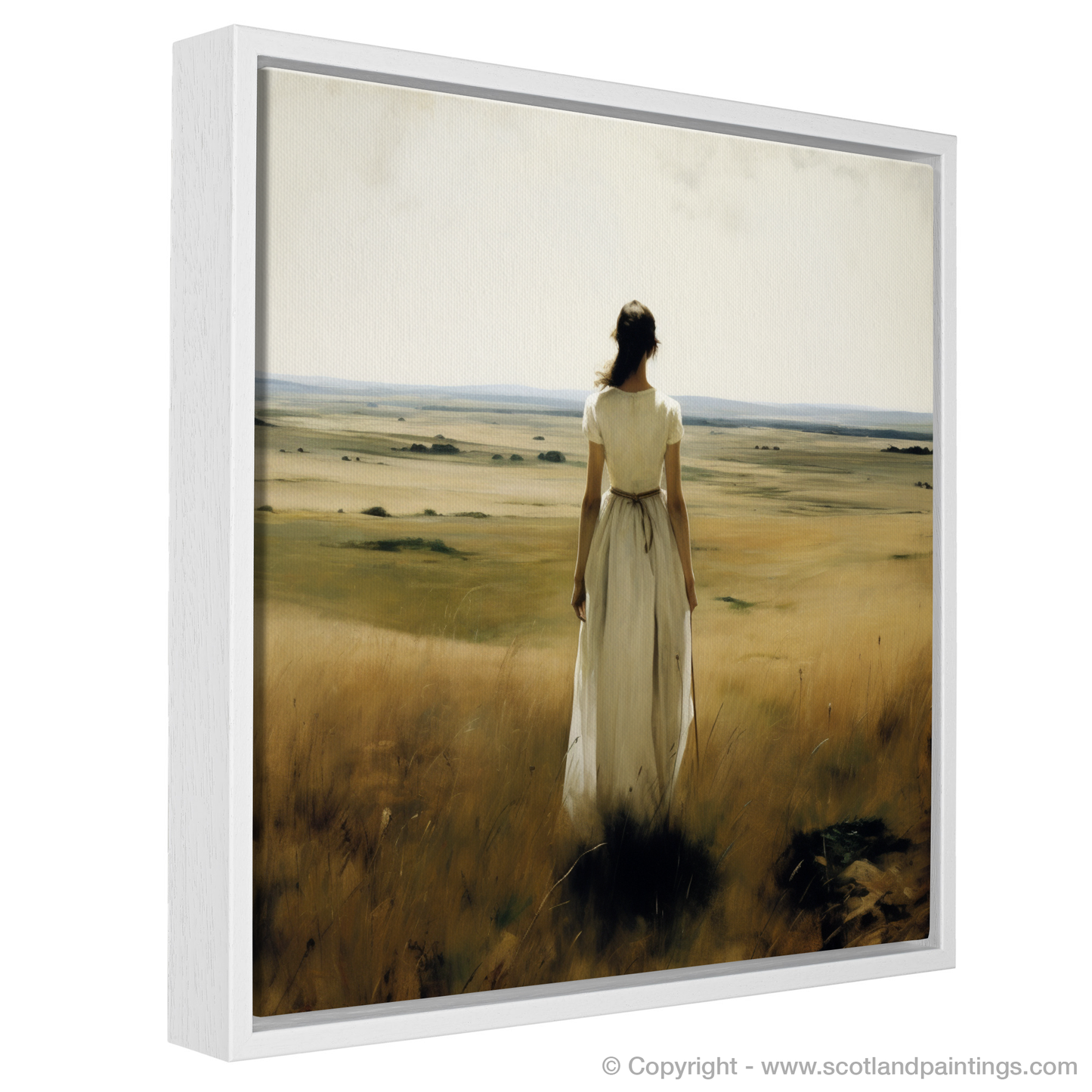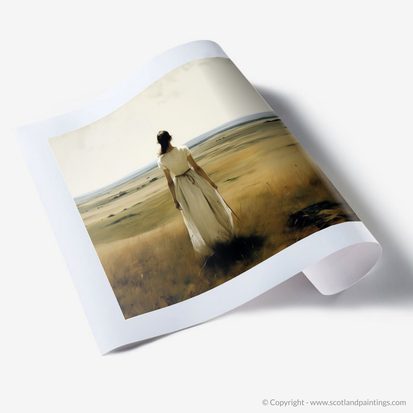 Immerse yourself in the evocative allure of a timeless landscape as a woman, poised in an ethereal white dress, becomes the focal point of this emotive print. With her back to the viewer, she gazes out over the sweeping expanse of the historic battlefield of Culloden, where once the air was thick with the clamour of battle, now lies serene under a tranquil sky.