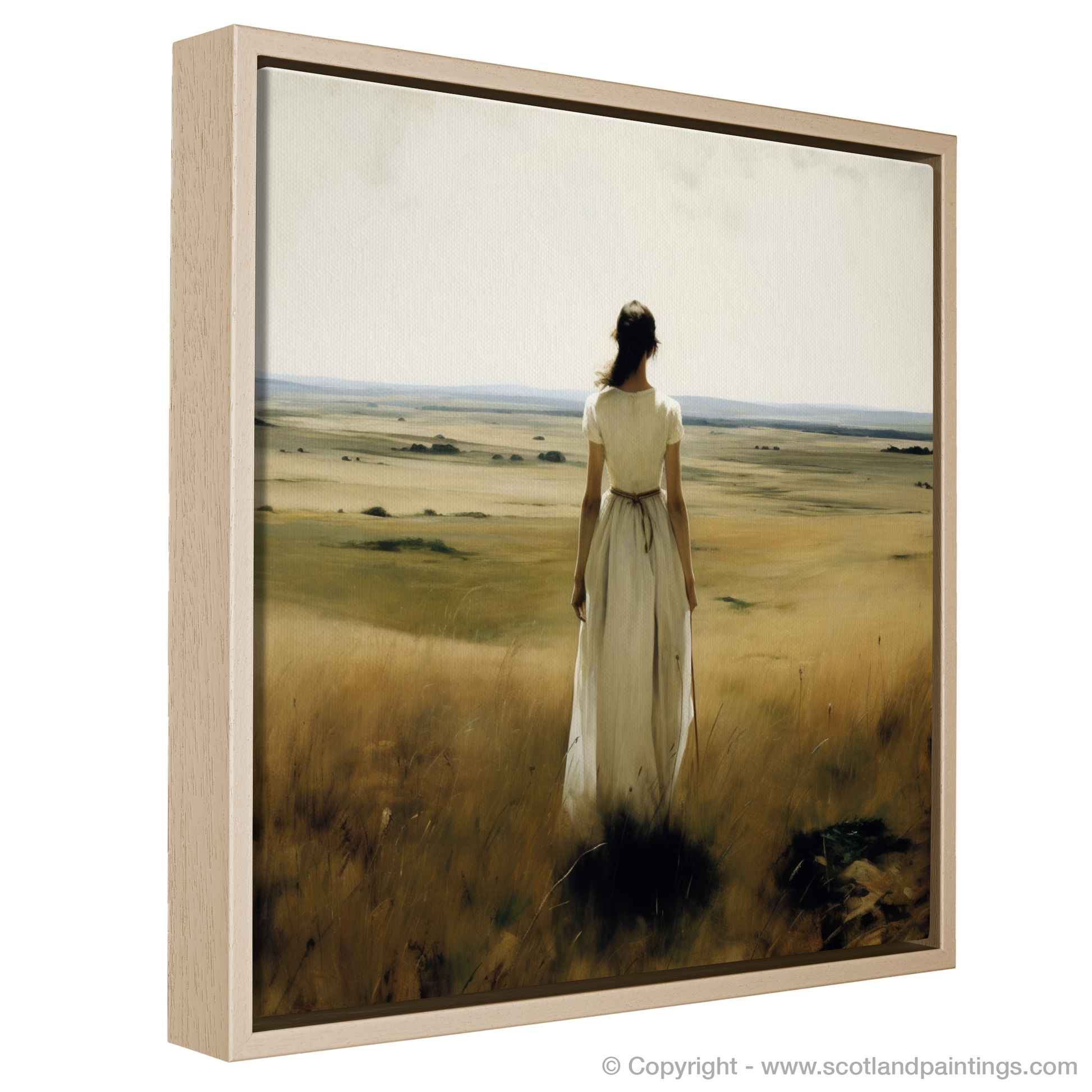The delicate folds of her dress are rendered meticulously, capturing the gentle flow of fabric, which has been kissed by the soft highland breeze. A subtle sash cinches the dress at the waist, adding the only hint of definition against the rolling, untouched meadows that extend into the vast horizon.