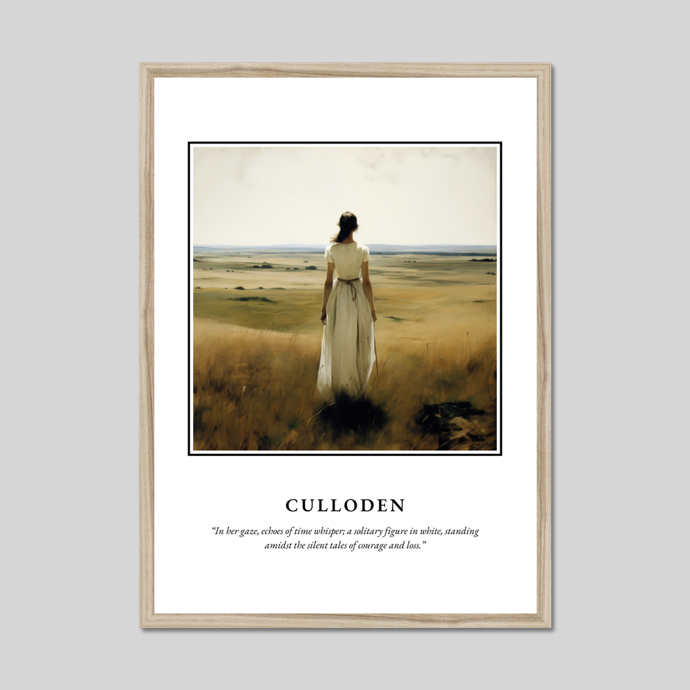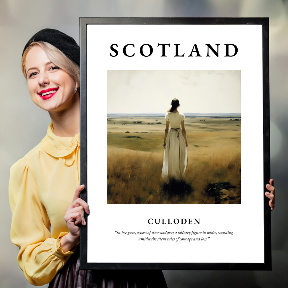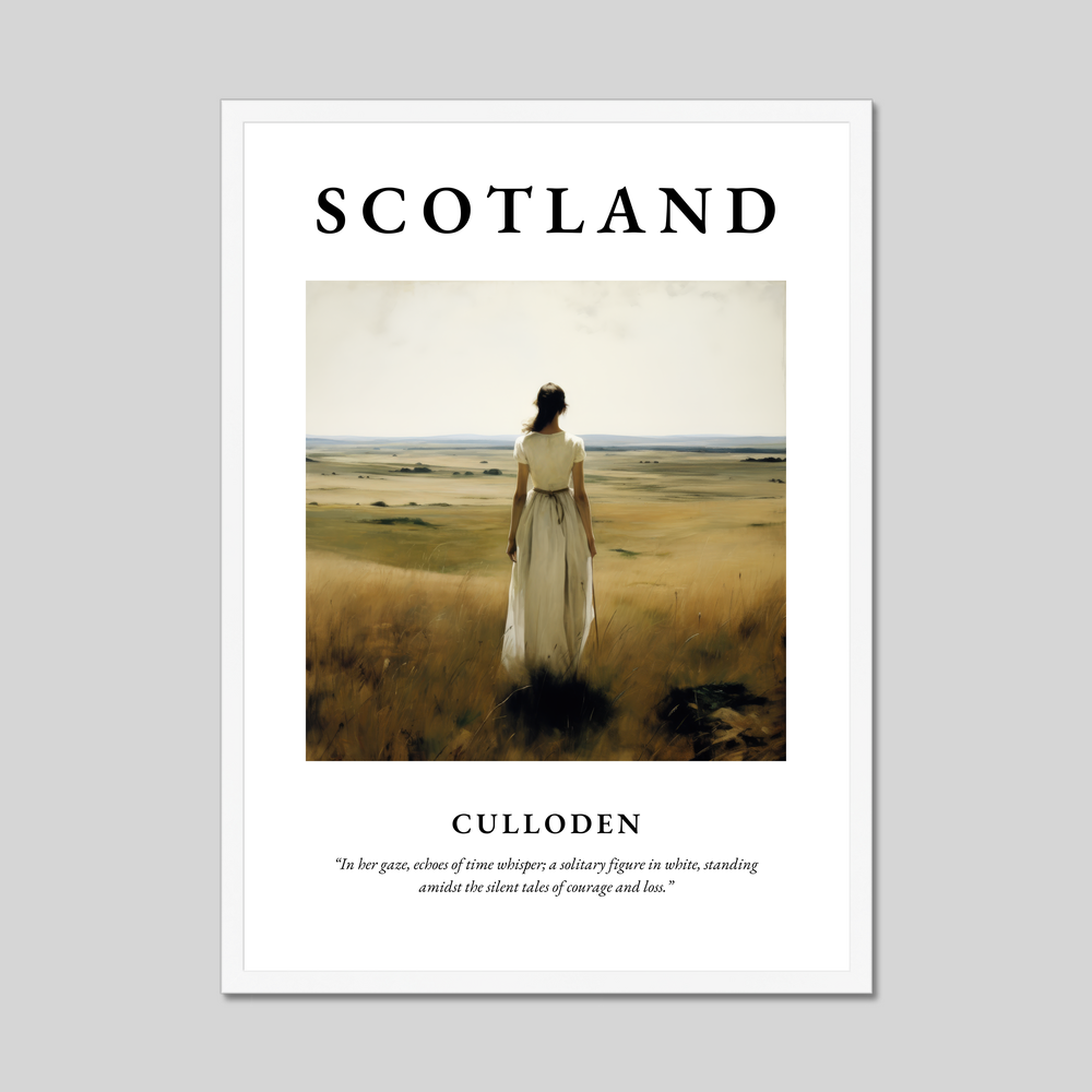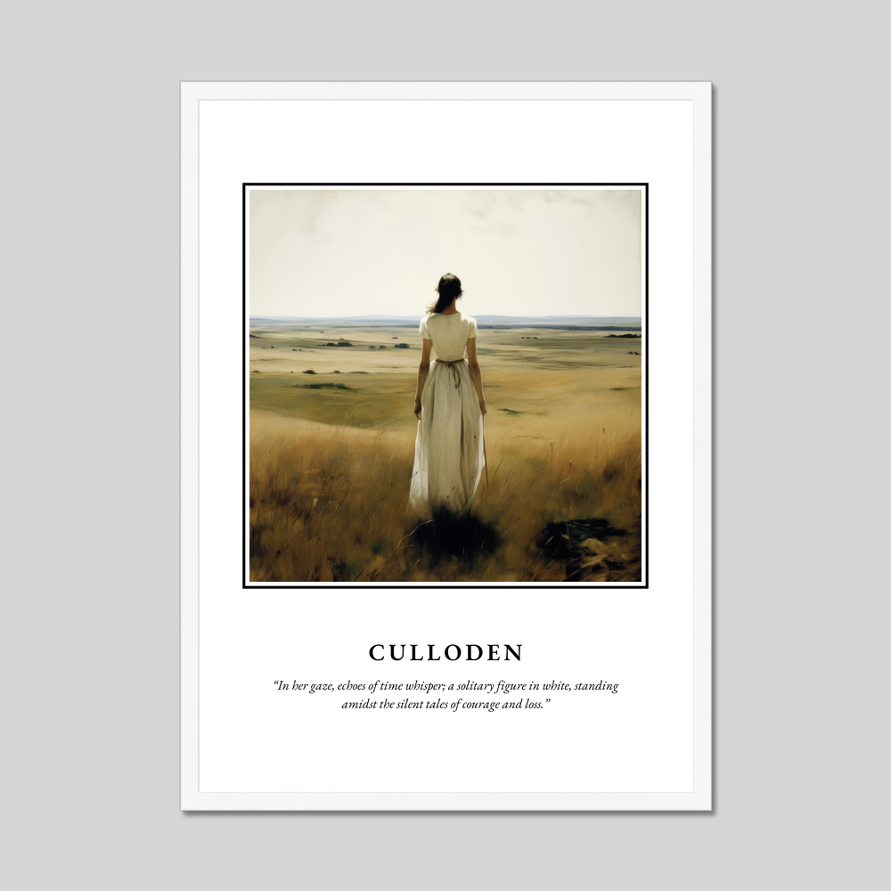 The detailed painting of Culloden presented in the realism style transports you to a moment frozen in time. A solitary figure in a white dress stands amidst the rolling plains, her gaze extending into the horizon as if listening to the whispers of history. Below this striking image lies the poignant quote: “In her gaze, echoes of time whisper; a solitary figure in white, standing amidst the silent tales of courage and loss.” This evokes a deep sense of connection to the rich and tumultuous past of Scotland’s battles and heartaches.
