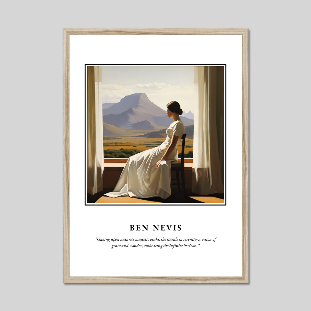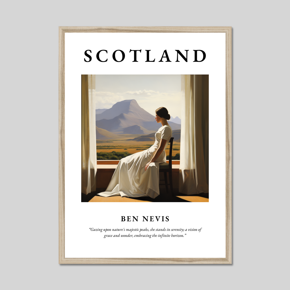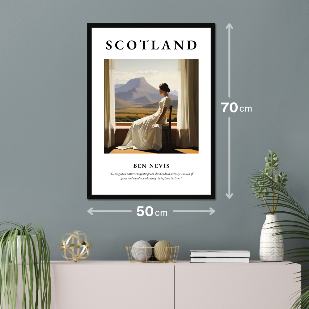 Embrace the grandeur of Scotland's natural beauty with this stunning framed poster print, measuring an impressive 50cm x 70cm. Perfectly capturing the spirit of the Highlands, this artwork features a breathtaking Realism-style painting of Ben Nevis, Scotland’s highest peak. Boasting bold lettering of “SCOTLAND” at the top, this poster seamlessly blends art and nature, evoking the tranquil majesty that the Scottish landscapes are renowned for. Beneath the painting, you'll find the poetic quote: “Gazing upon nature's majestic peaks, she stands in serenity; a vision of grace and wonder, embracing the infinite horizon,” which adds an extra layer of elegance and inspiration.