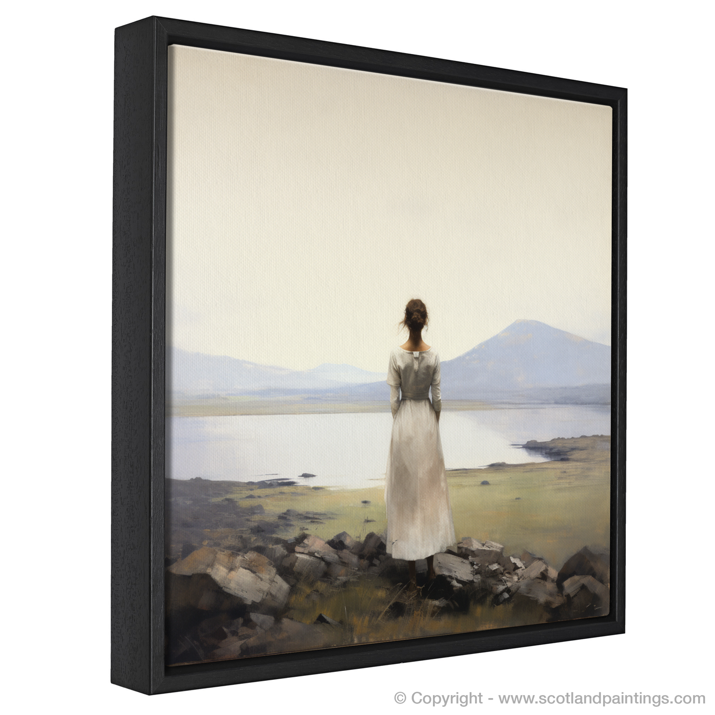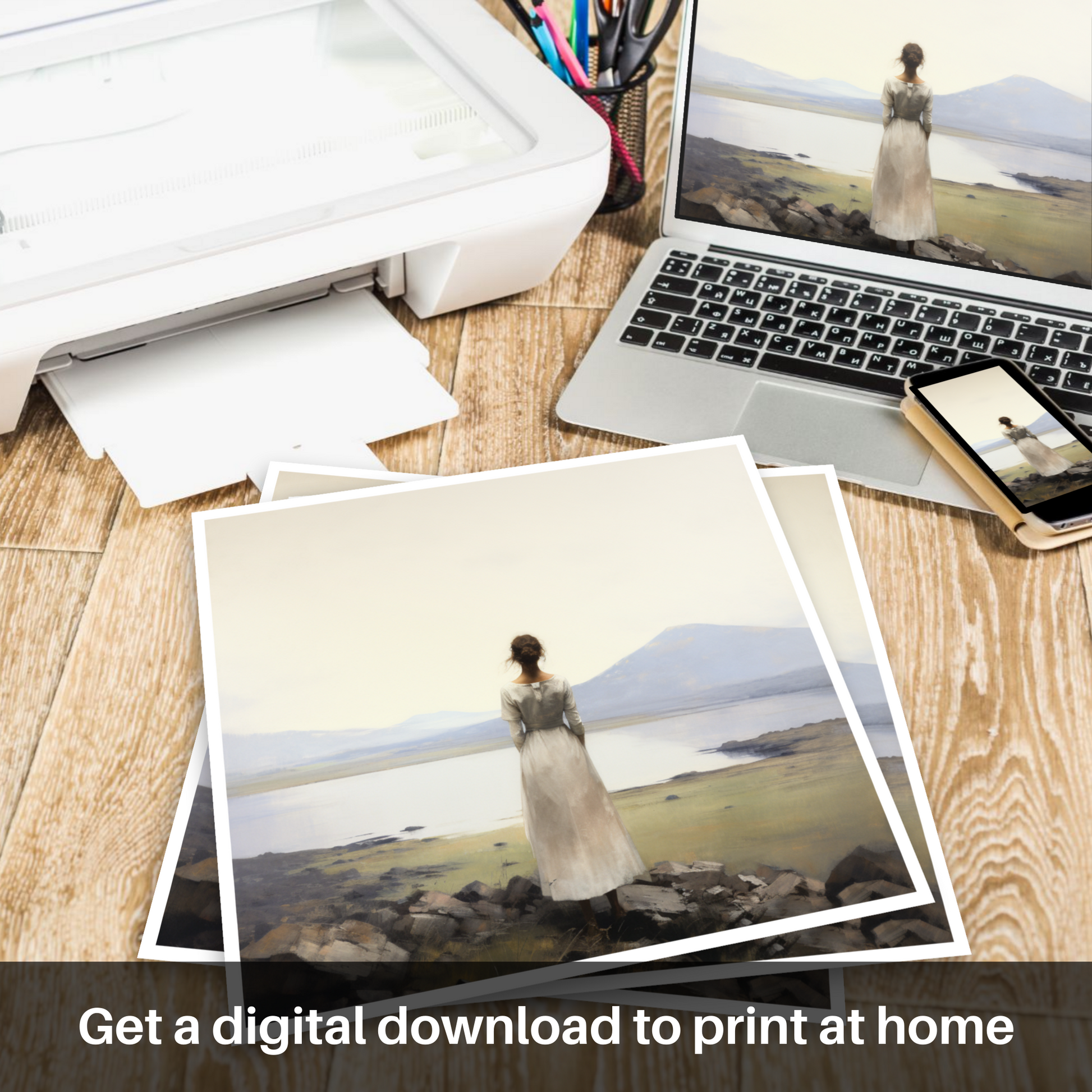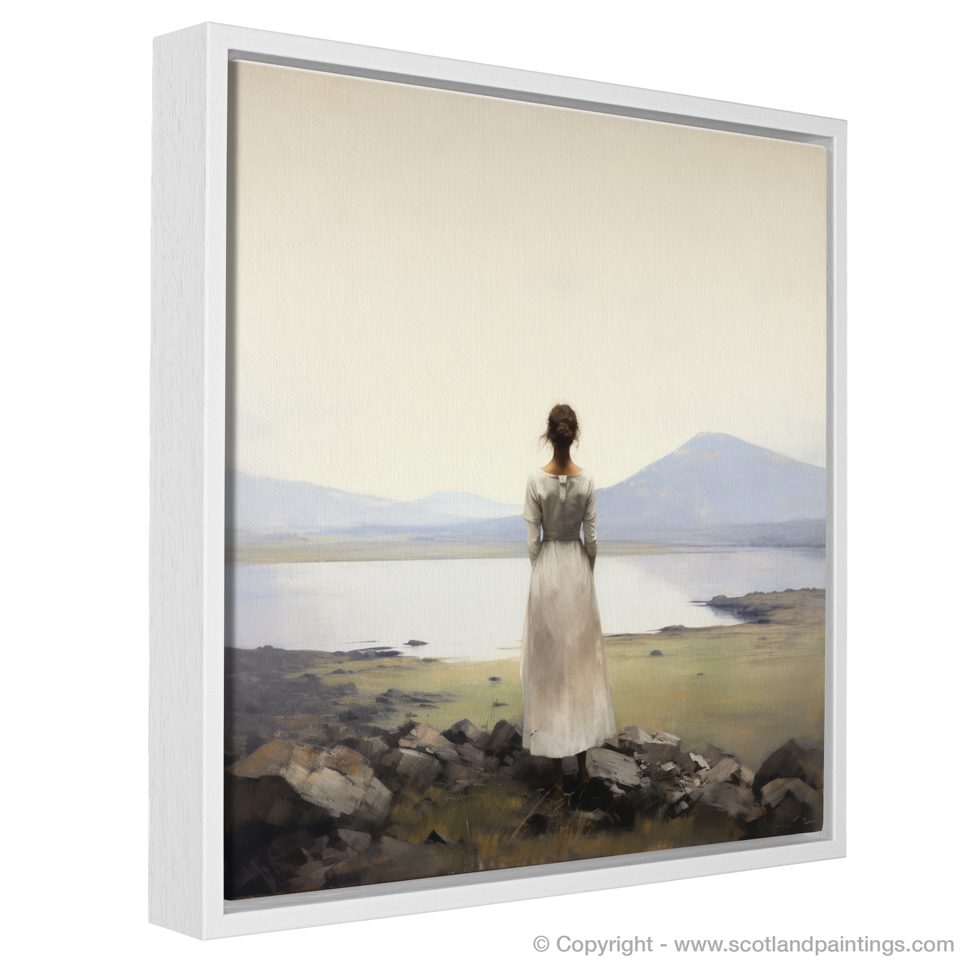 Captivate your senses with the tranquillity and enchanting beauty of the Scottish landscape as seen through the eyes of a contemplative figure in this exquisite print. A sole woman, garbed in a flowing white dress that gently brushes her calves, stands poised amidst a rocky foreground. The subtle, delicate fabric flutters slightly, suggesting a gentle breeze that adds life to this serene scene.