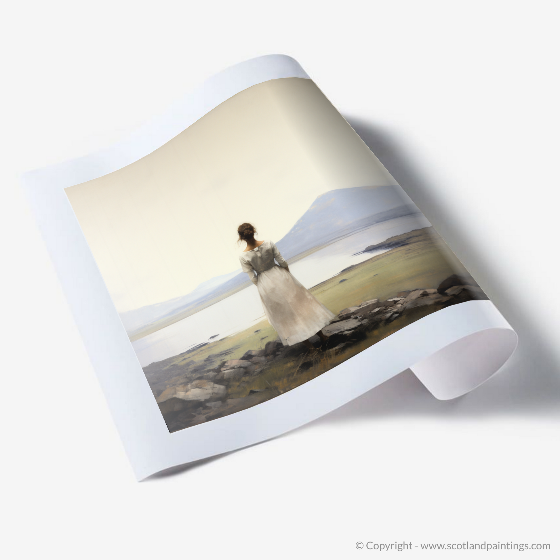 Her hair, gathered loosely at the nape of her neck, allows viewers to imagine the soft, whispered touch of the wind as she gazes out toward the mist-enshrouded Isle of Arran. The dress, with its understated elegance, features long sleeves and a modest neckline, which evoke a sense of timeless grace. The soft folds of the dress are rendered with meticulous care, indicating the artist's mastery over light and shadow in the creation of realistic textures.