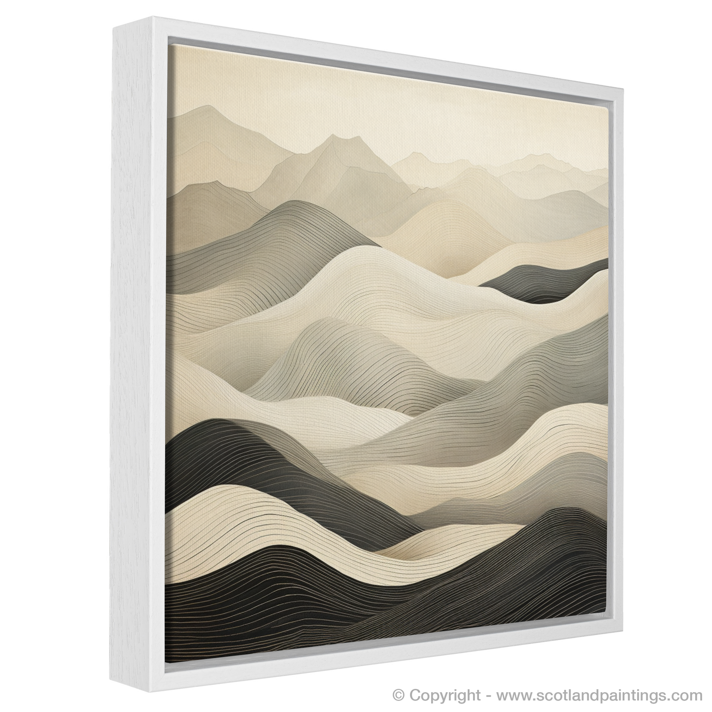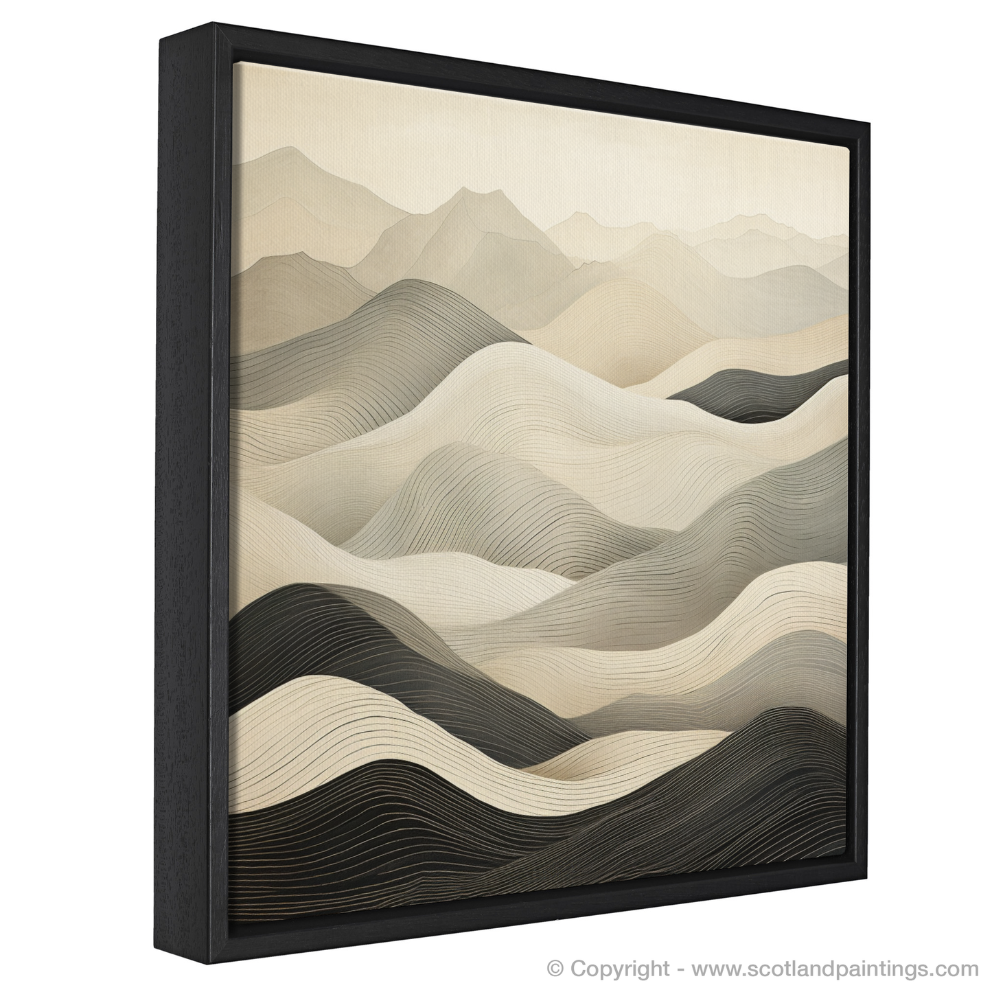 Swaths of cream and taupe intermingle with bolder tones of black, manifesting the peaks and valleys with a rhythmic allure that borders on the hypnotic. The nuanced gradation of colour adeptly mirrors the ethereal mists and changing lights that are so characteristic of the Highlands, thus offering an homage that is both mystic and grounded in the raw appeal of nature. Designed without the constraints of explicit forms, this piece encourages a personal voyage of discovery—viewers are beckoned to explore the abstract forms and find their own interpretations of the Scottish Mountains' celebrated topography.