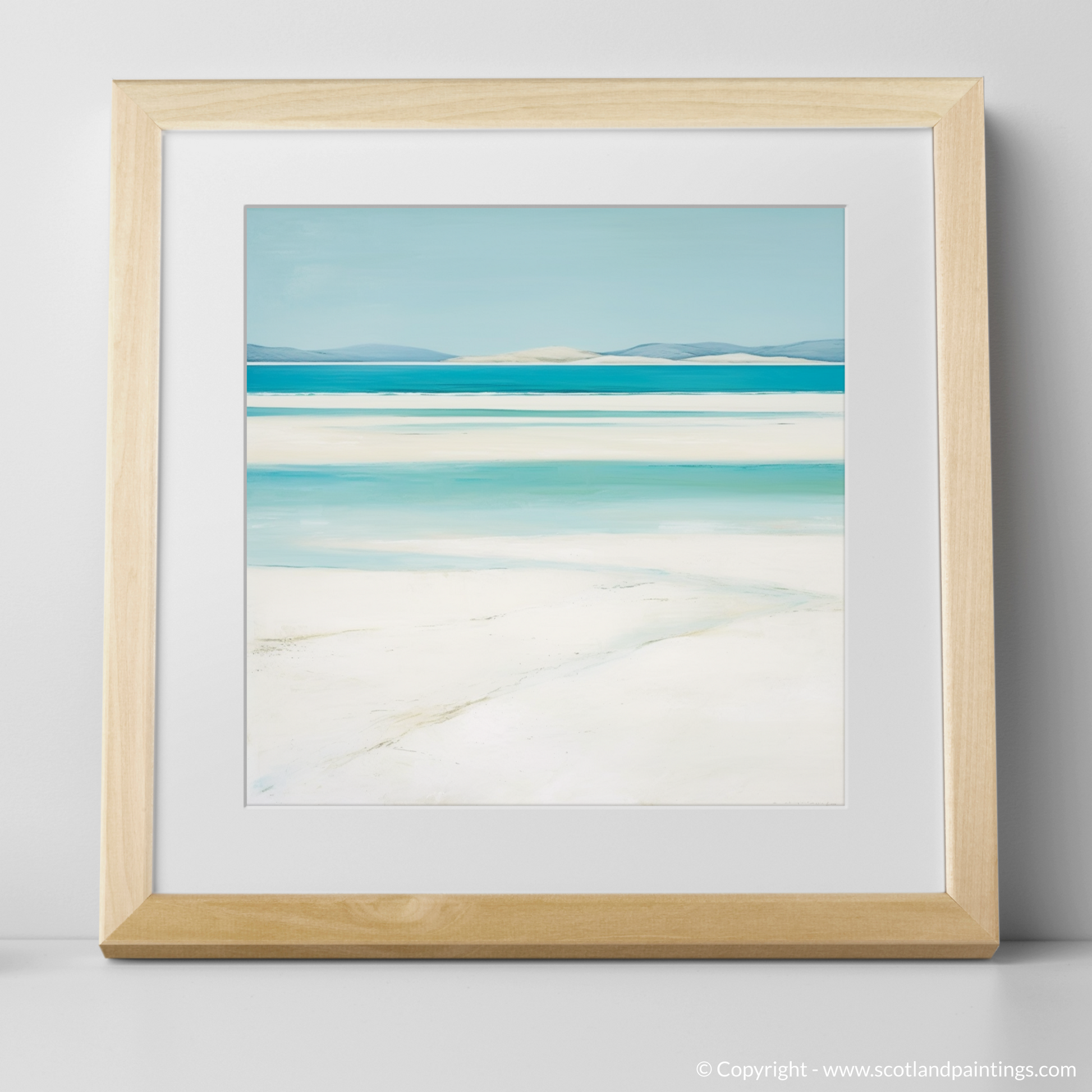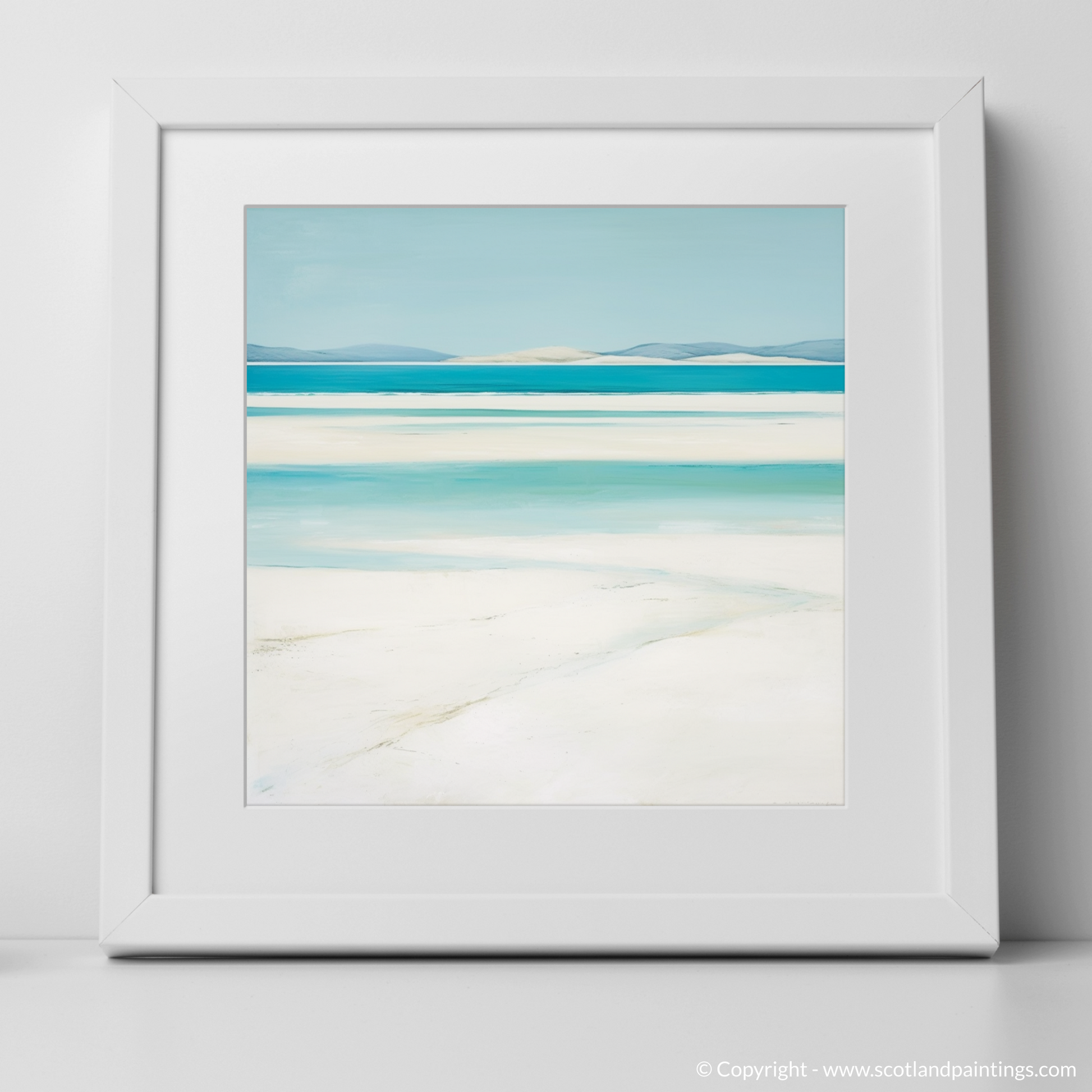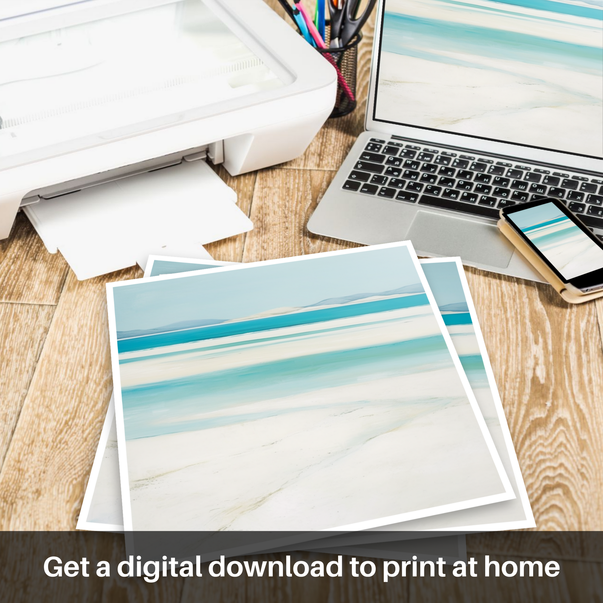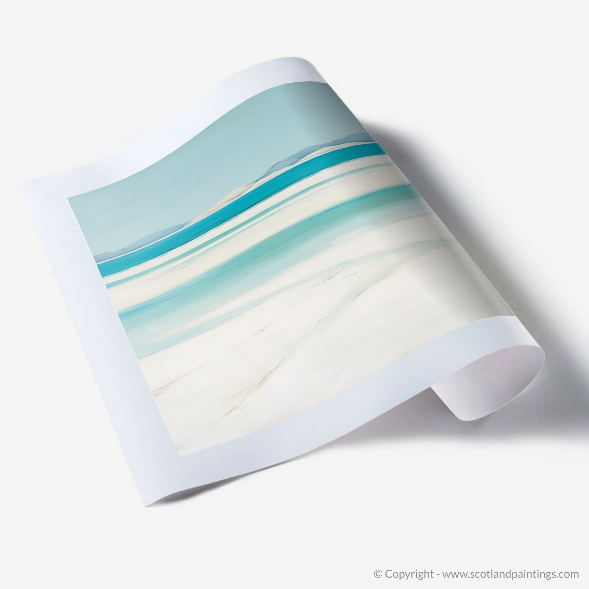 Immerse yourself in the serene beauty of Scotland's rugged coastline with this evocative abstract print, influenced by the pristine sands and tranquil waters of Traigh Mhor on the Isle of Barra. This exquisite piece showcases a harmonious blend of cool blues, turquoise, and a spectrum of creamy whites, reminiscent of the mesmerising interplay between the sky, sea, and shore.
