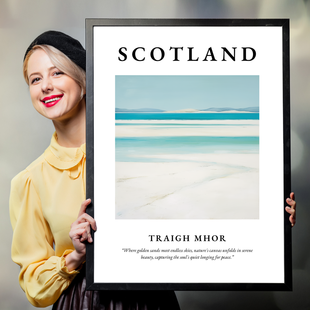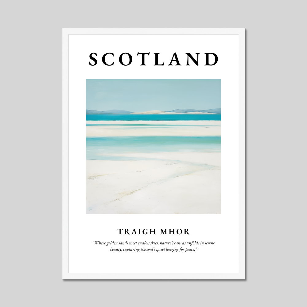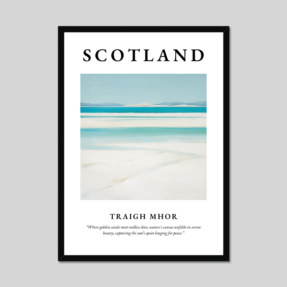 Adorned with the word “SCOTLAND” in bold letters at the top, the poster draws the eye immediately to Traigh Mhor’s tranquil landscape. Below, the quote “Where golden sands meet endless skies, nature's canvas unfolds in serene beauty, capturing the soul's quiet longing for peace” encapsulates the peaceful allure of the scene. Available in a choice of black, white, or natural wood-effect frame, it provides a versatile match for any decor.