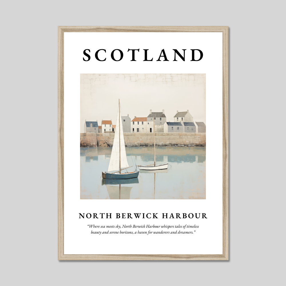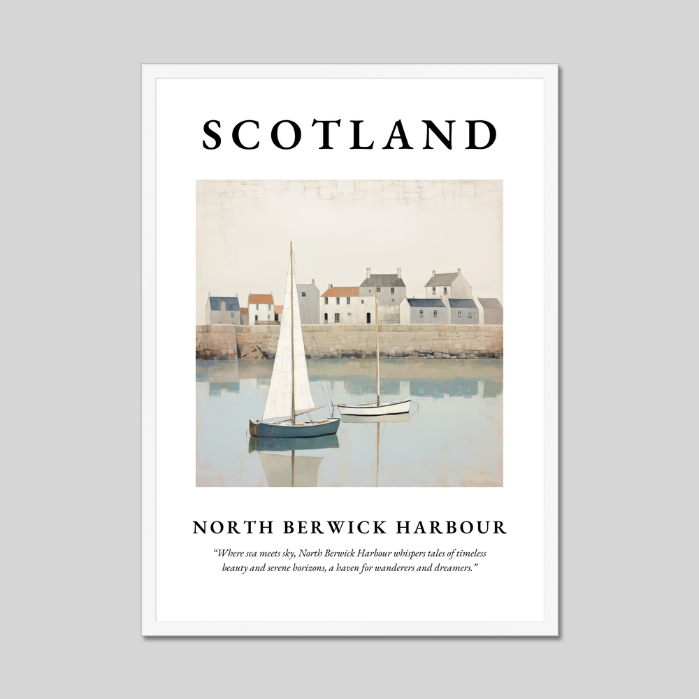With the word "SCOTLAND" emblazoned in bold letters, this piece immediately draws the eye. Below, the painting itself conveys a dreamlike quality, with ethereal hues that suggest the tranquil meeting of sea and sky. Two sailboats rest peacefully on the glassy water, their reflections merging seamlessly with the muted tones of the seaside homes. The scene is further enriched by the evocative quote: “Where sea meets sky, North Berwick Harbour whispers tales of timeless beauty and serene horizons, a haven for wanderers and dreamers.”