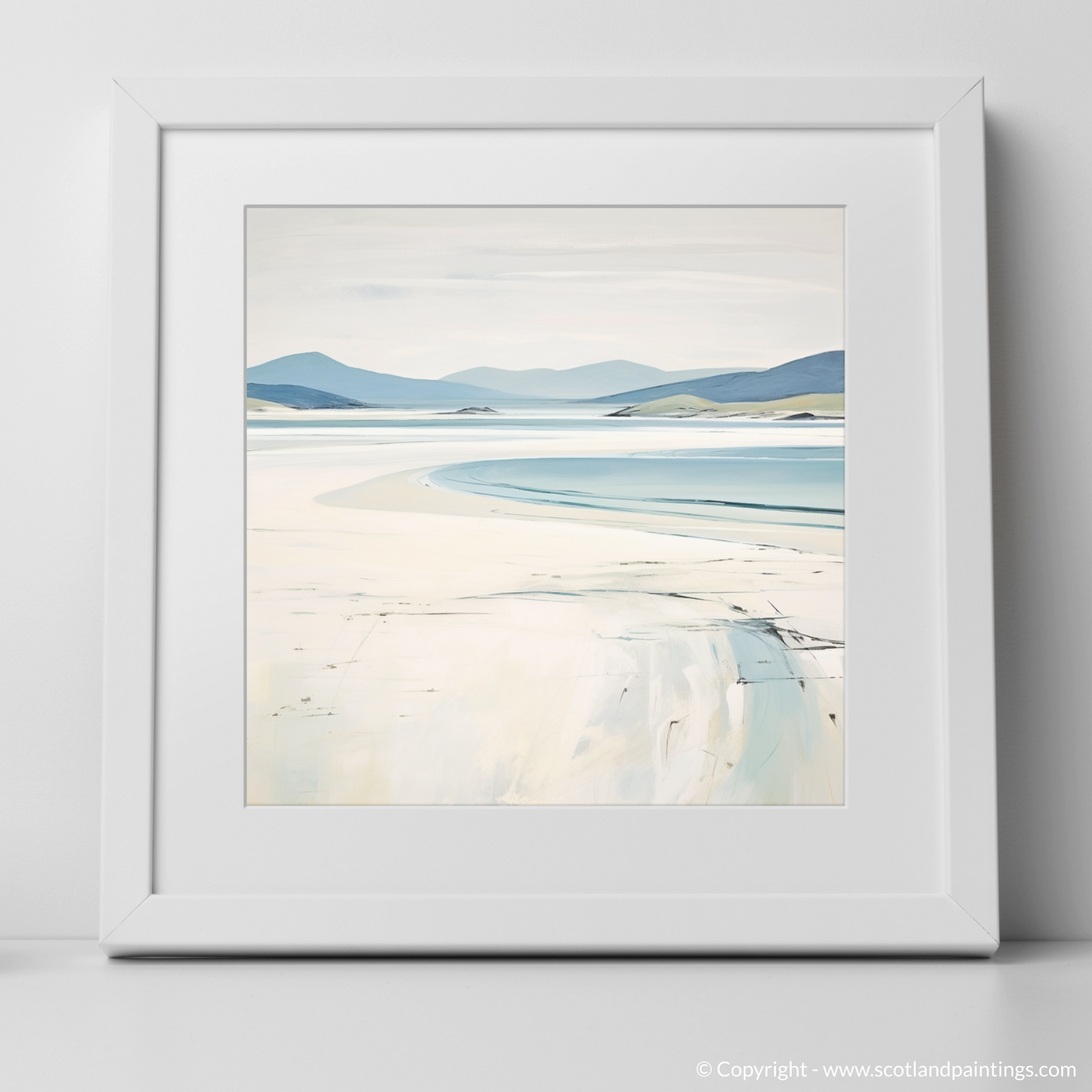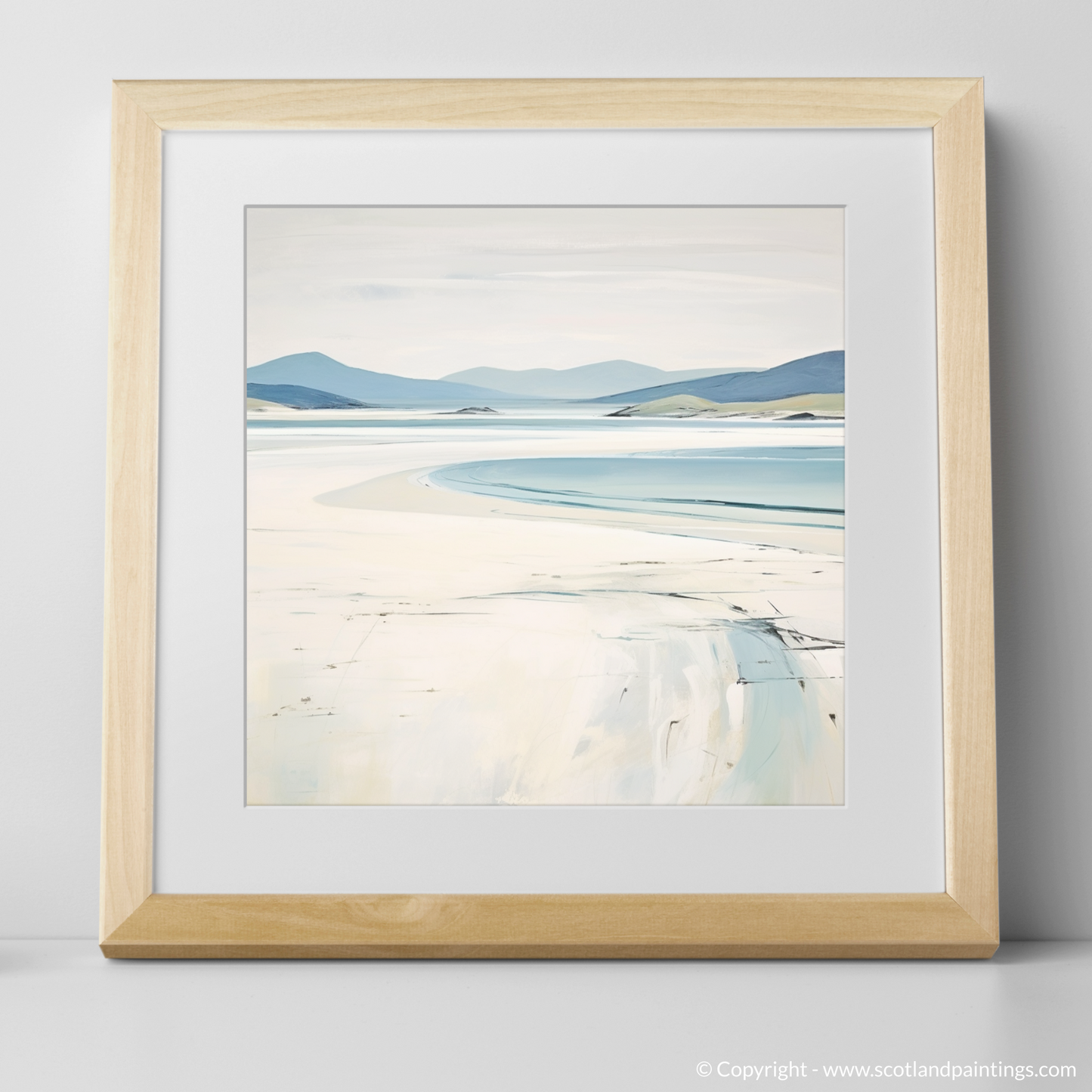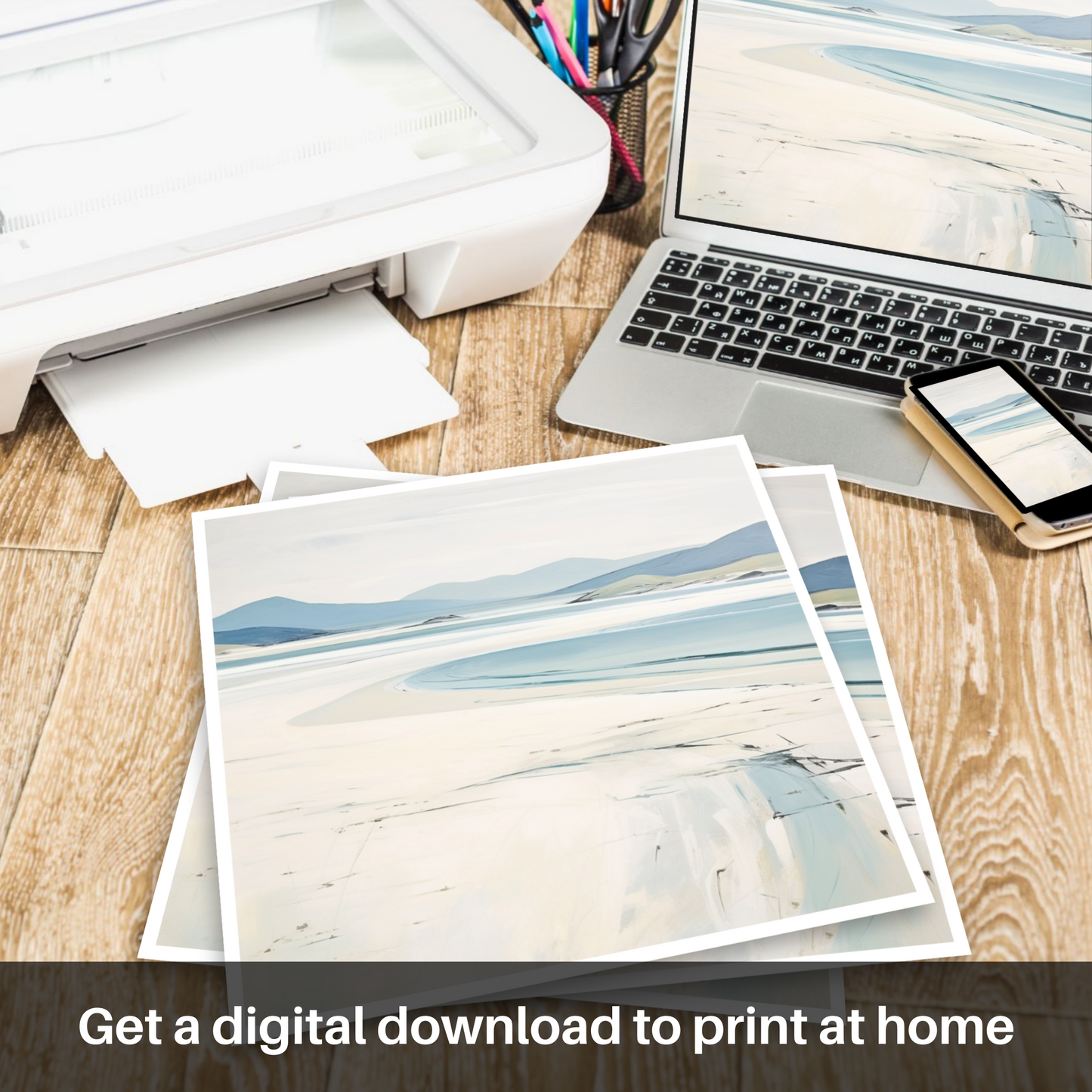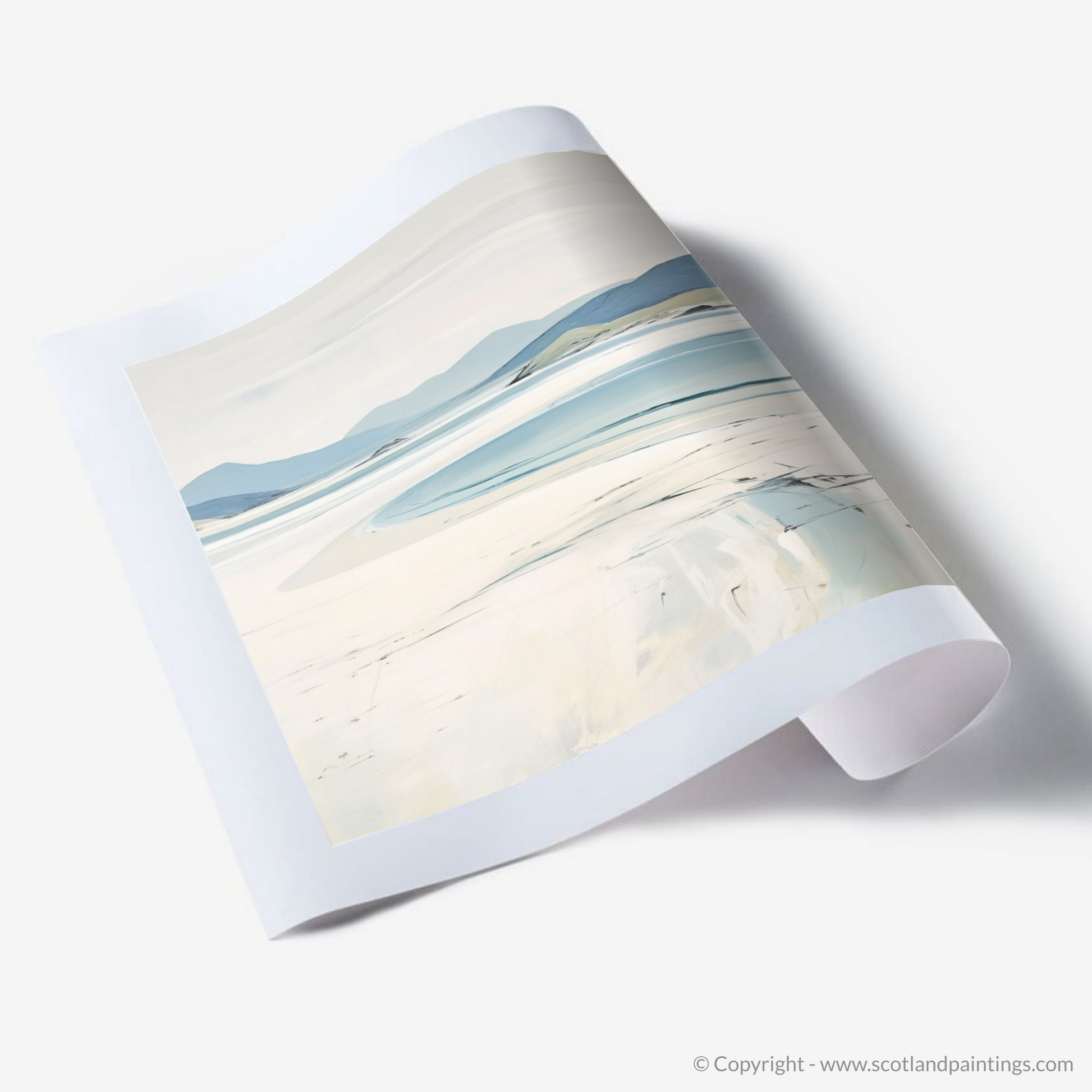 Immerse yourself in the serene atmosphere of the Scottish Isles with our abstract interpretation of Luskentyre Beach, Isle of Harris, a centrepiece belonging to our 'Scottish Beaches' collection. The canvas is a symphony of muted hues, where the subtlest shades of cream and white compose a tranquil horizon, seamlessly blending with whispers of soft blues and gentle greys that evoke the natural purity of this secluded paradise.