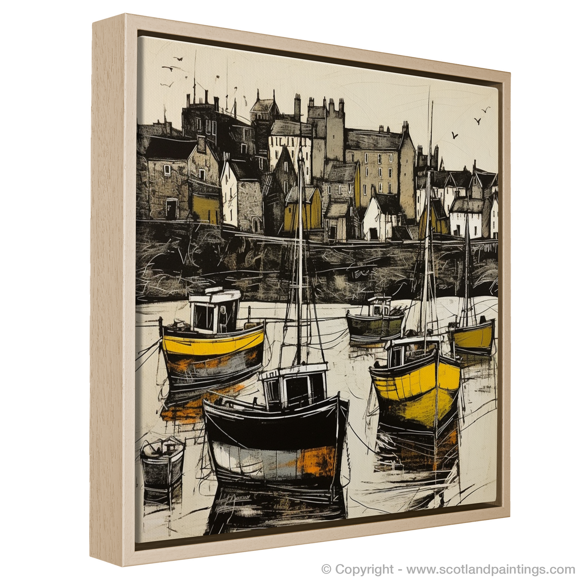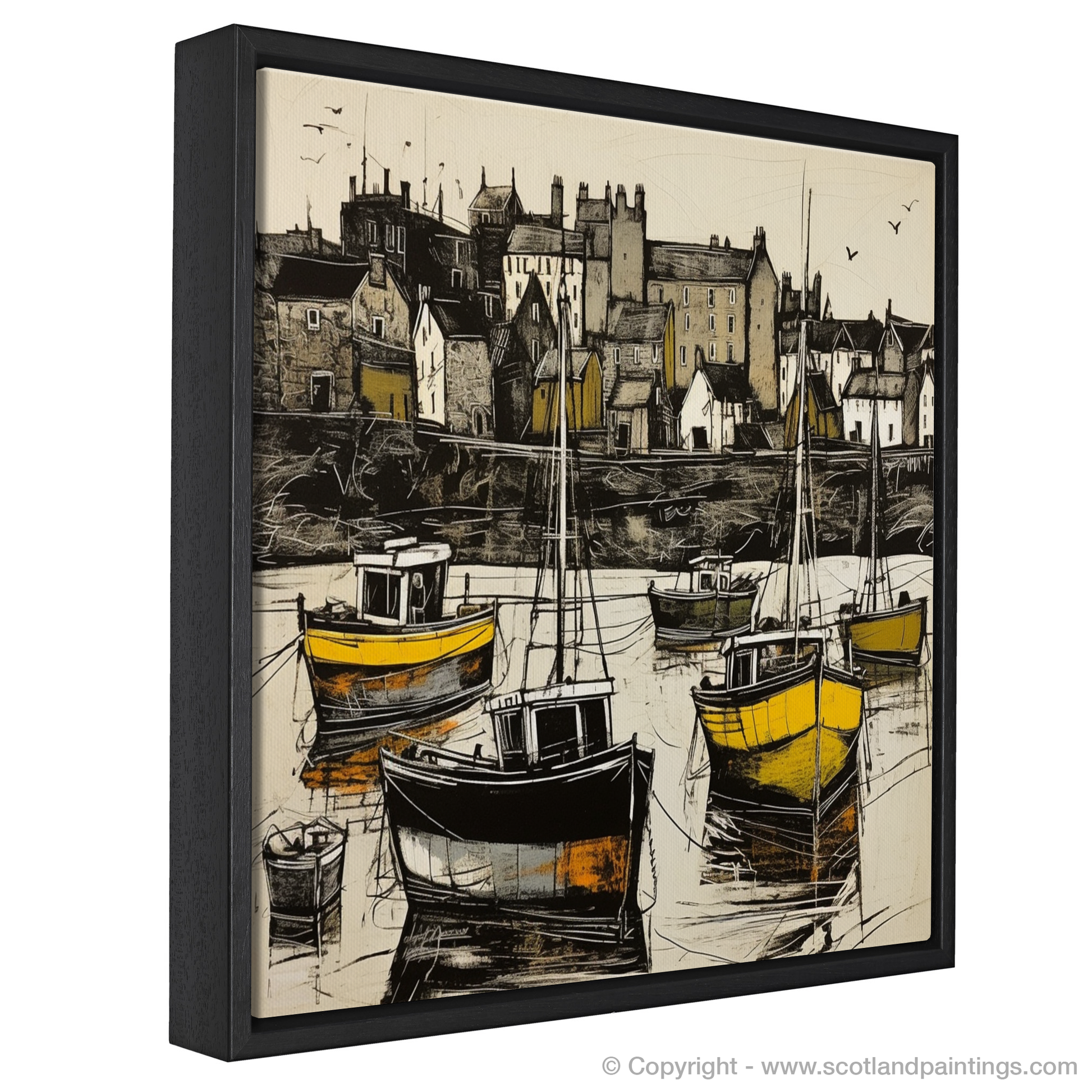 This striking piece captures the raw beauty and bustling activity of Castlebay Harbour, Island of Barra, through a palette that articulates the vivid essence of Scottish harbours. The composition is a dance of contrast and harmony, where bold, black lines define the shapes of traditional boats and their intricate rigging. Amidst these lines, pops of yellow and orange on the boats' hulls stand out against the monochromatic backdrop, exuding warmth and focal interest.