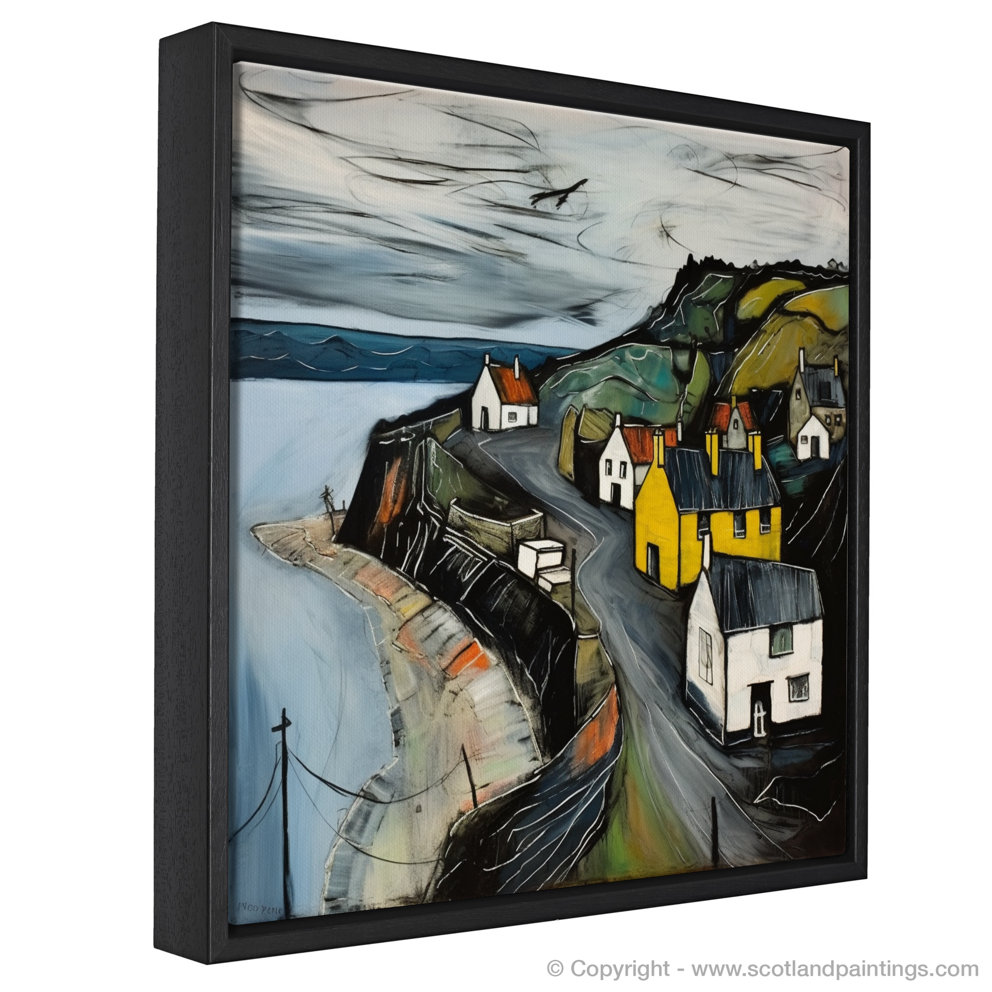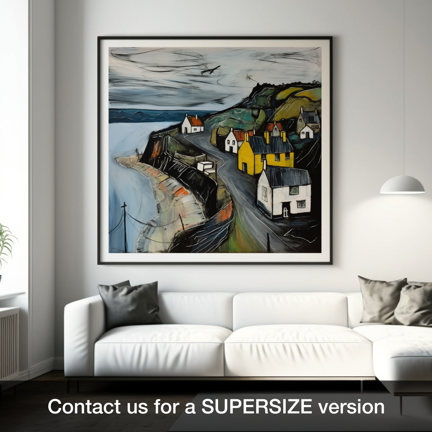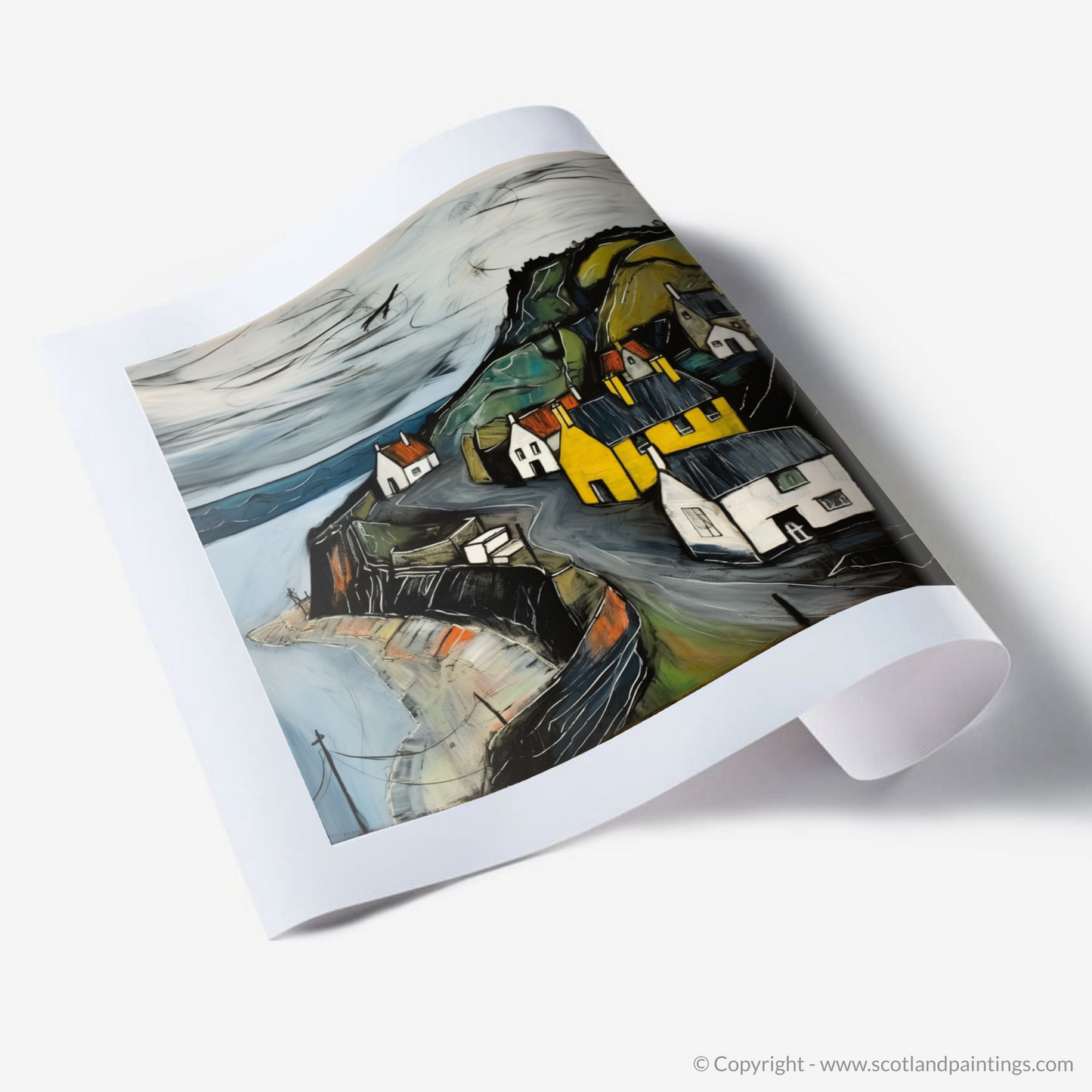 Imagine a windswept vista where the land and sky converge in a dance of colour and form, this illustrative expressionist print of Coldingham Bay is nothing short of emotionally stirring. Swirling skies, rendered in brooding hues of grey and blue, seem to whip over the coastal scene with an energetic urgency. Below, the calm expanse of the ocean provides a stark contrast to the tempest above.