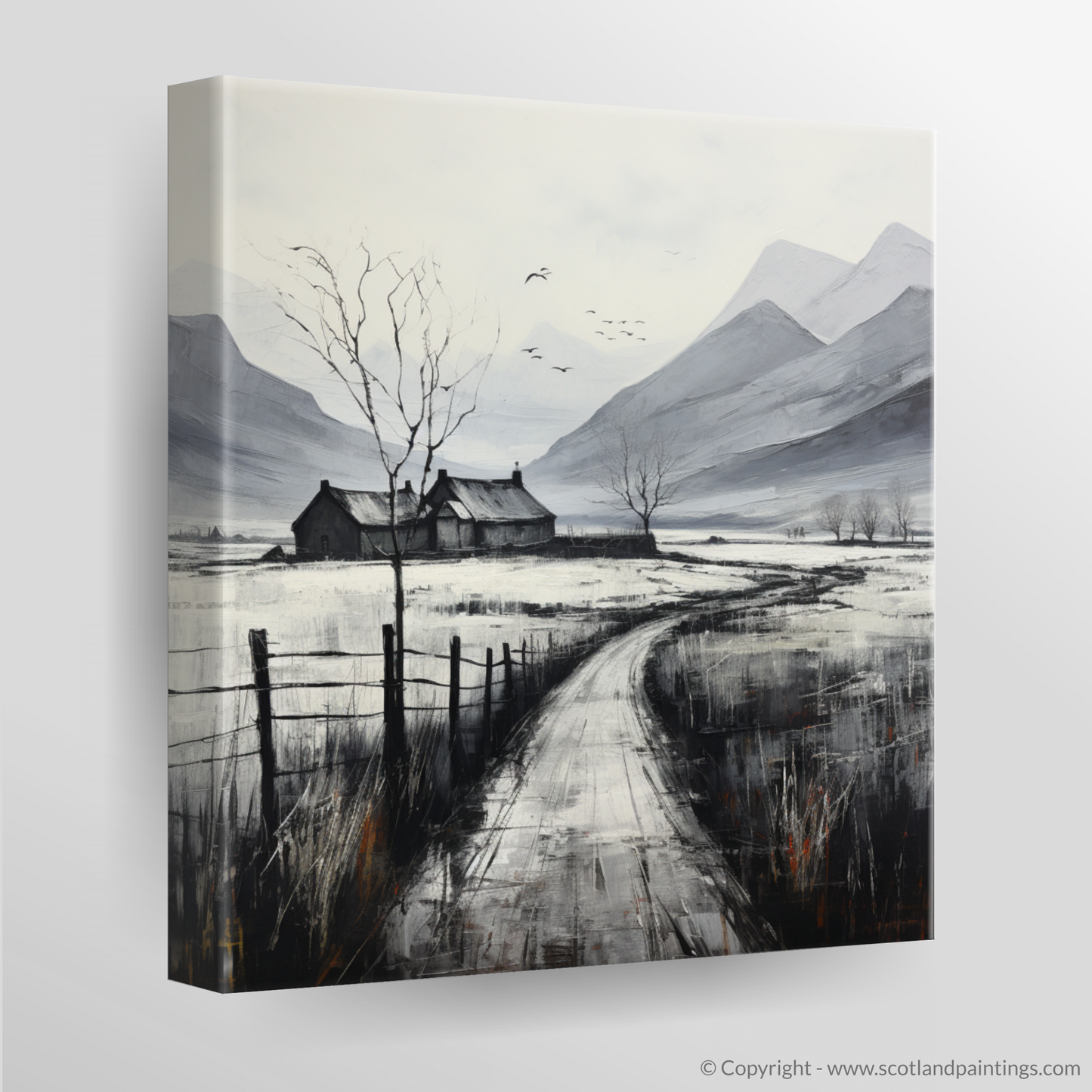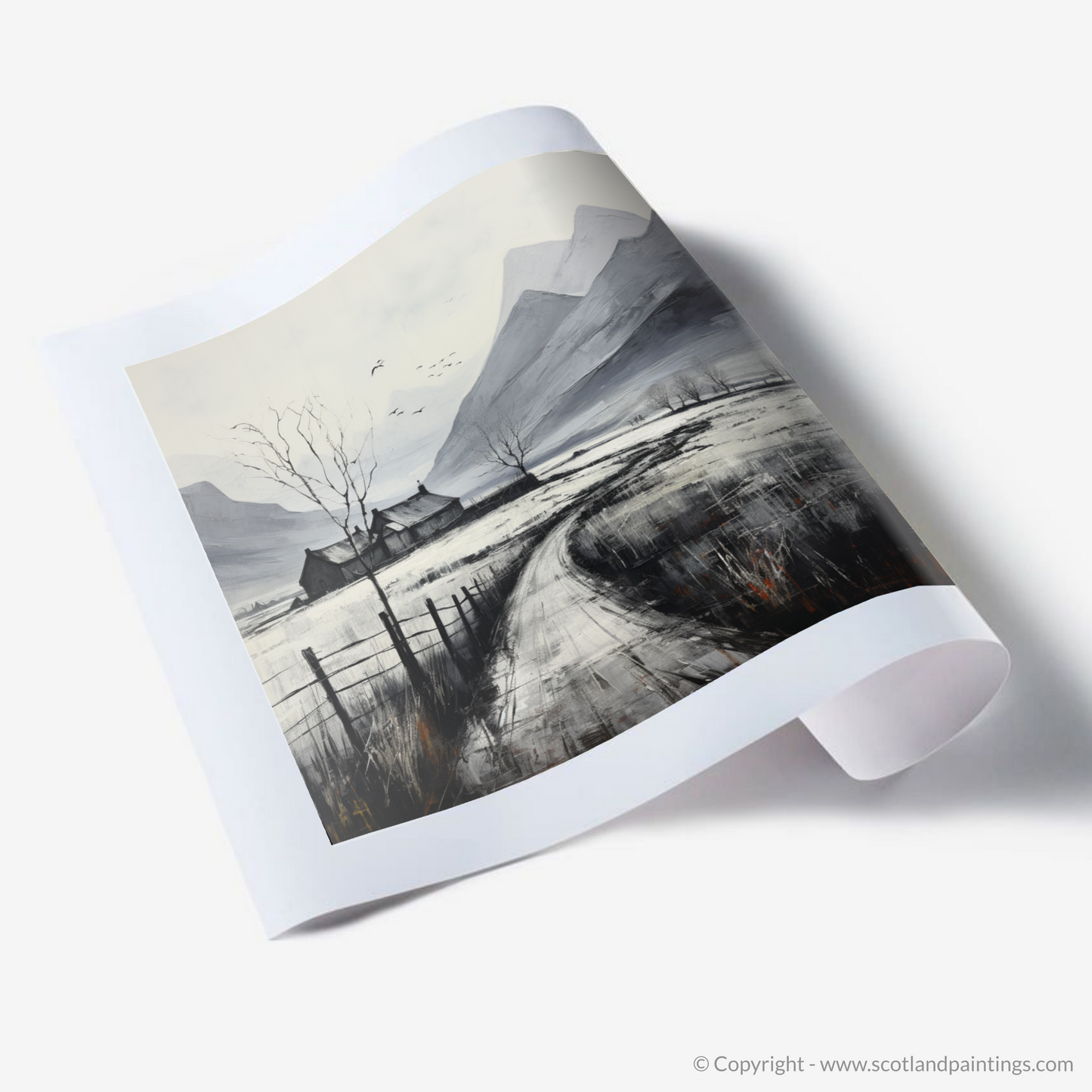 Bare trees, their branches etched into the sky, whisper tales of the changing seasons, while the monochrome palette is imbued with dramatic contrast, capturing the raw, often untameable mood of the glen. Pops of fiery hues peek through the otherwise chill spectrum, infusing the panorama with an undercurrent of life's persistent vigor against the stoic backdrop.