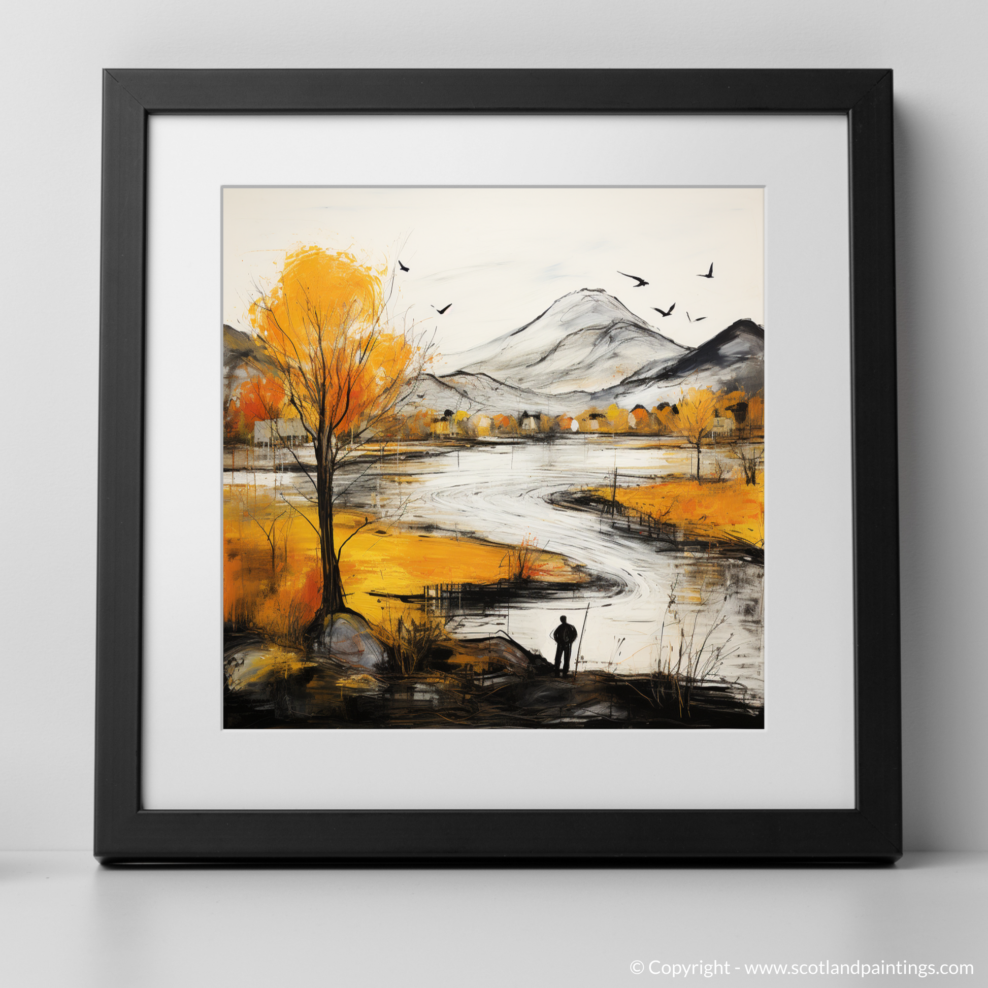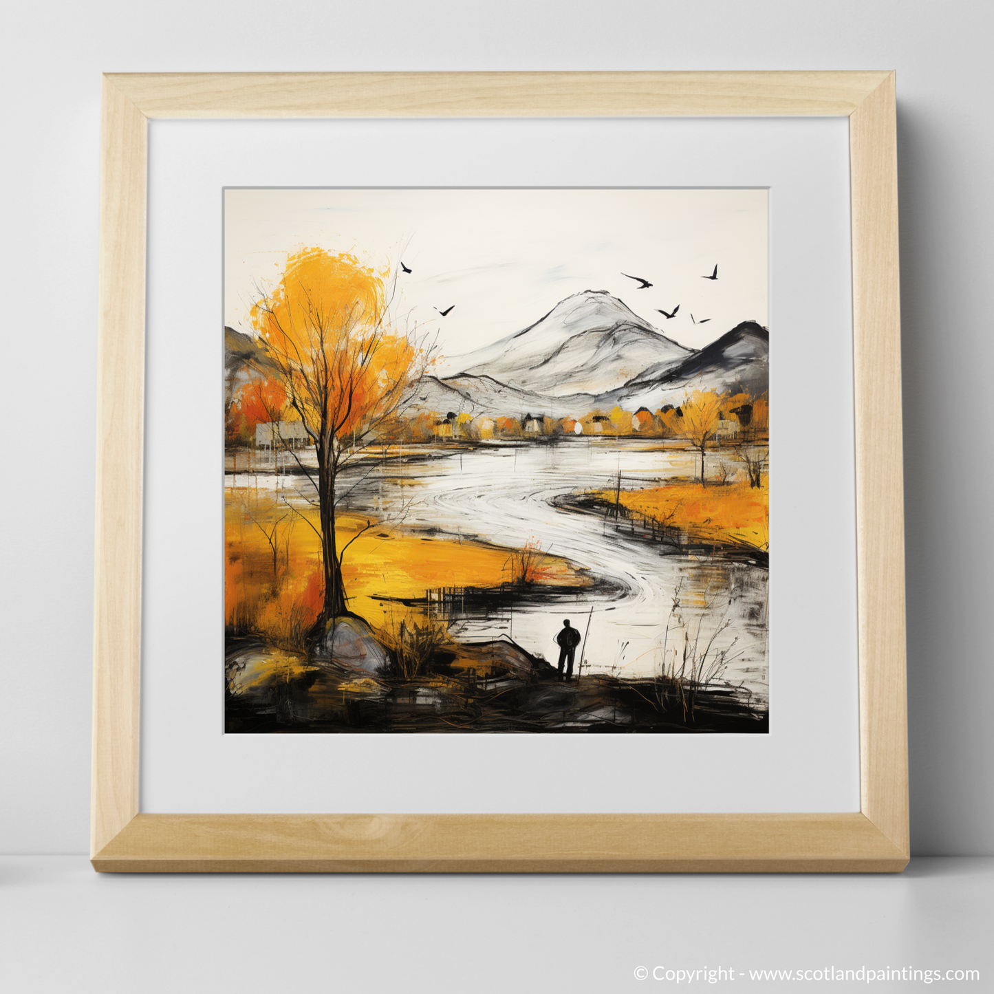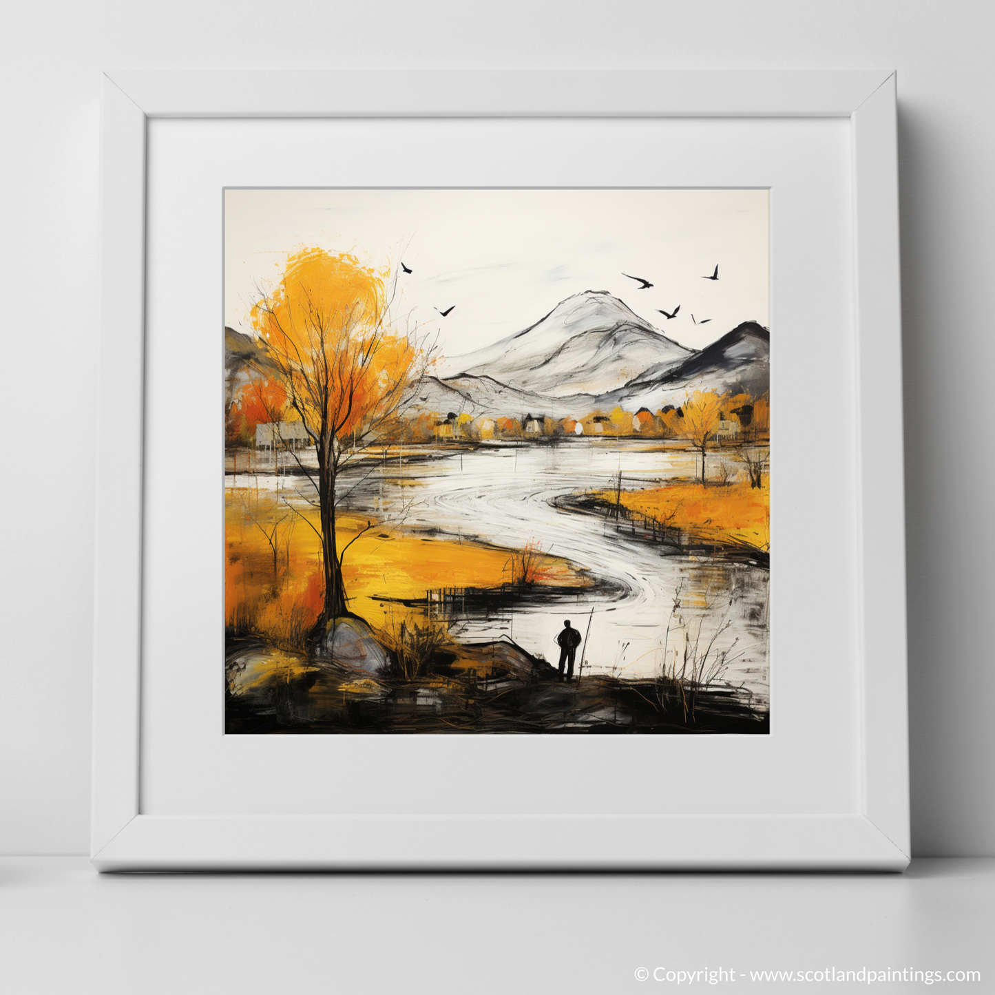 Immerse yourself in the ethereal allure of the Scottish landscape through this captivating print, a serene tribute to the timeless pursuit of fly fishing amidst the River Aline's enchanting tranquillity. The artwork beckons you to a world where vivid, expressive strokes of colour convey the rich hues of a sun-lit day, transitioning from amber-drenched trees to the gentle grey of distant, misty peaks.