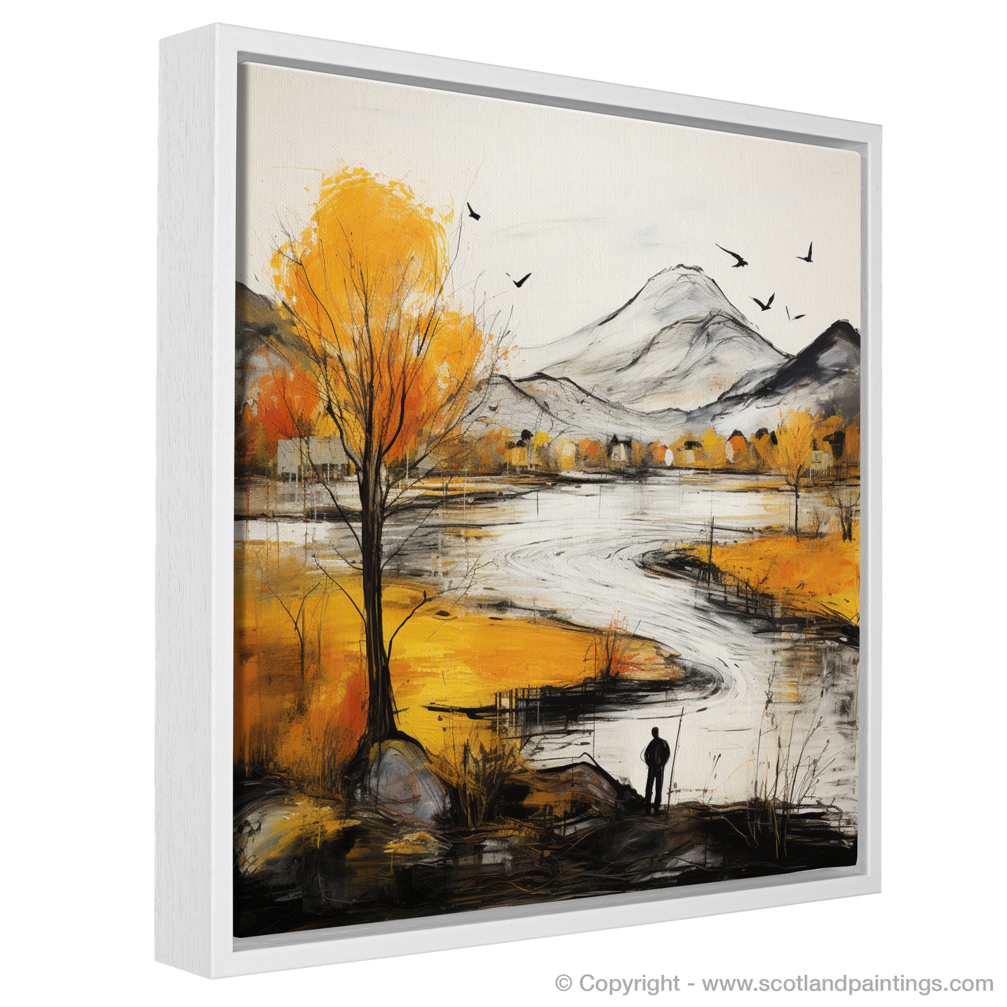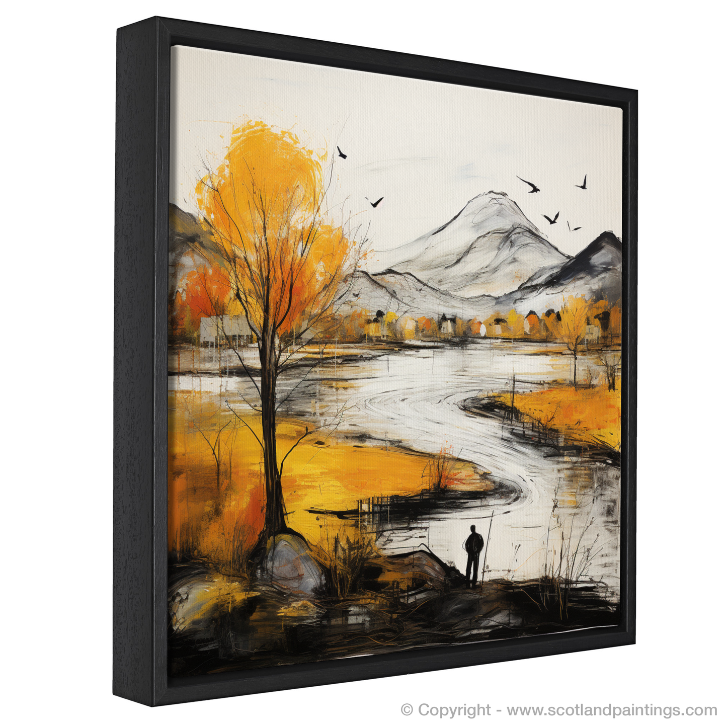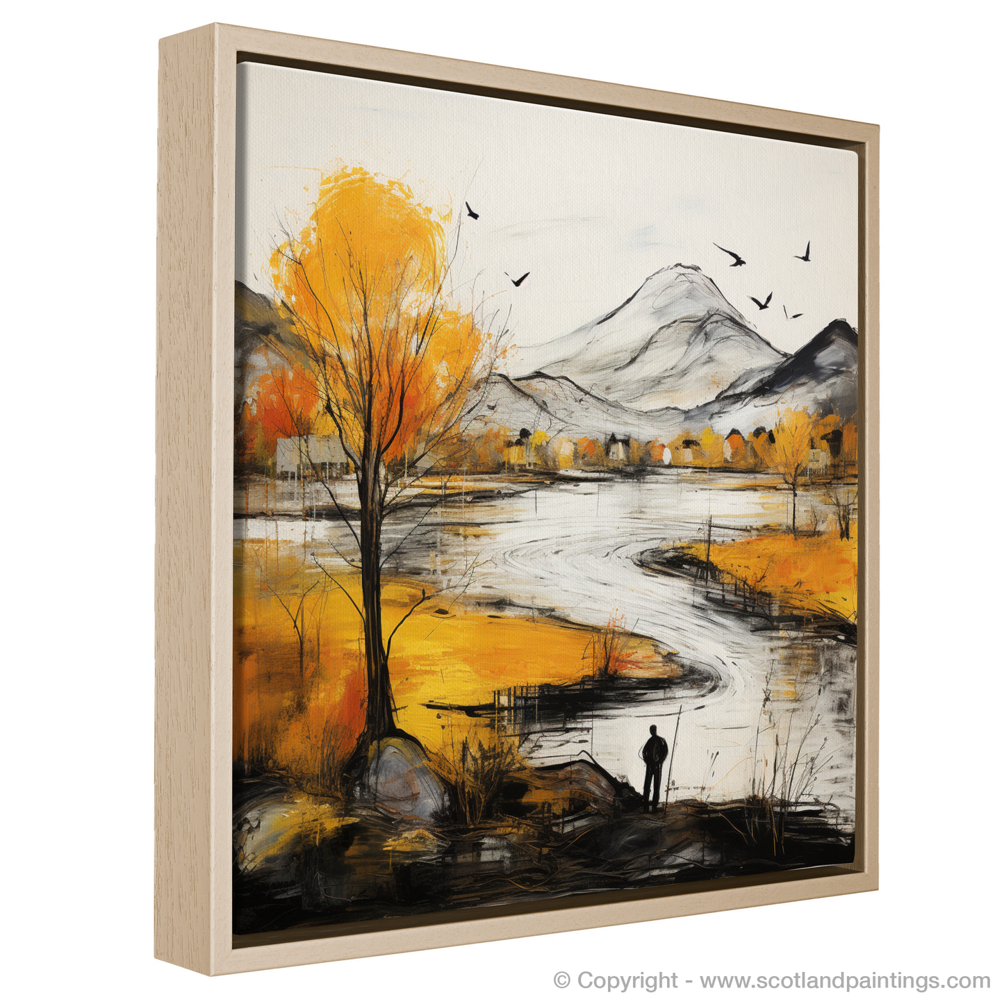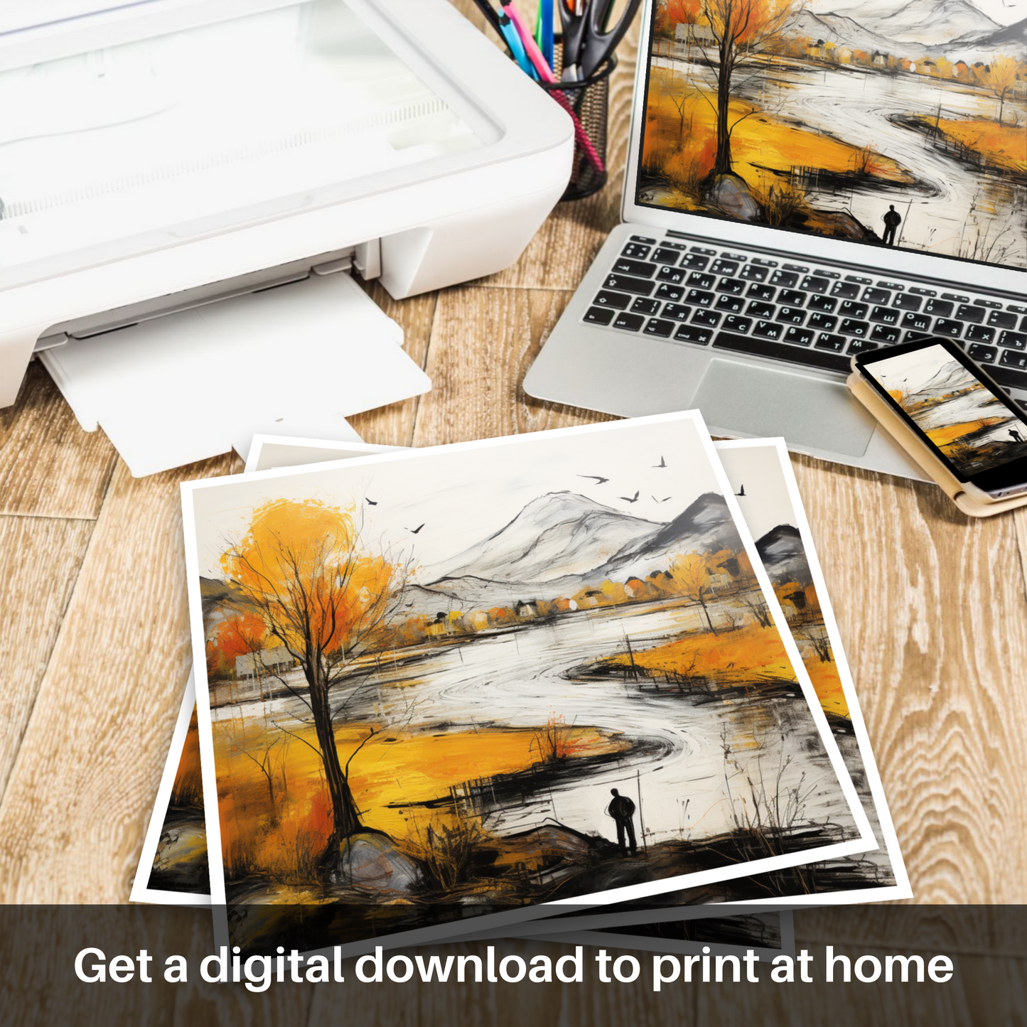 Immerse yourself in the ethereal allure of the Scottish landscape through this captivating print, a serene tribute to the timeless pursuit of fly fishing amidst the River Aline's enchanting tranquillity. The artwork beckons you to a world where vivid, expressive strokes of colour convey the rich hues of a sun-lit day, transitioning from amber-drenched trees to the gentle grey of distant, misty peaks.