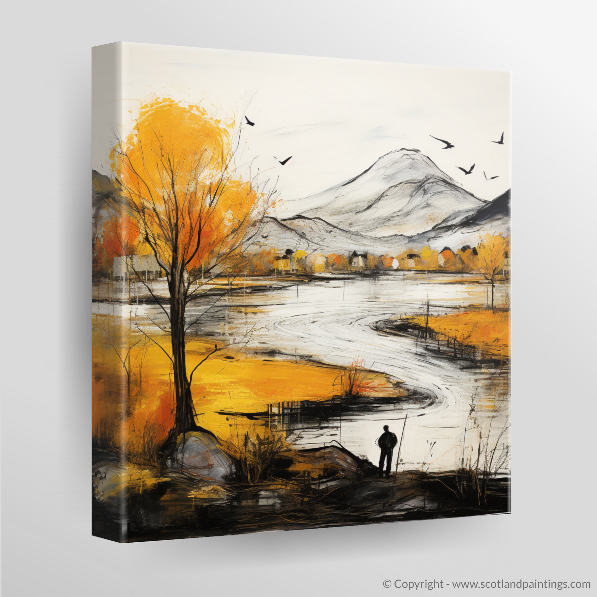 Detailed brushwork enhances the visual texture, emulating the river's shimmering surface and the varied terrain along its banks. Strokes of white and black add dynamic energy to the waterway, suggesting the constant motion of life beneath its surface. Silhouetted birds in flight add a sense of freedom and movement, perfectly encapsulating the essence of the peaceful solitude one finds in the Scottish great outdoors.
