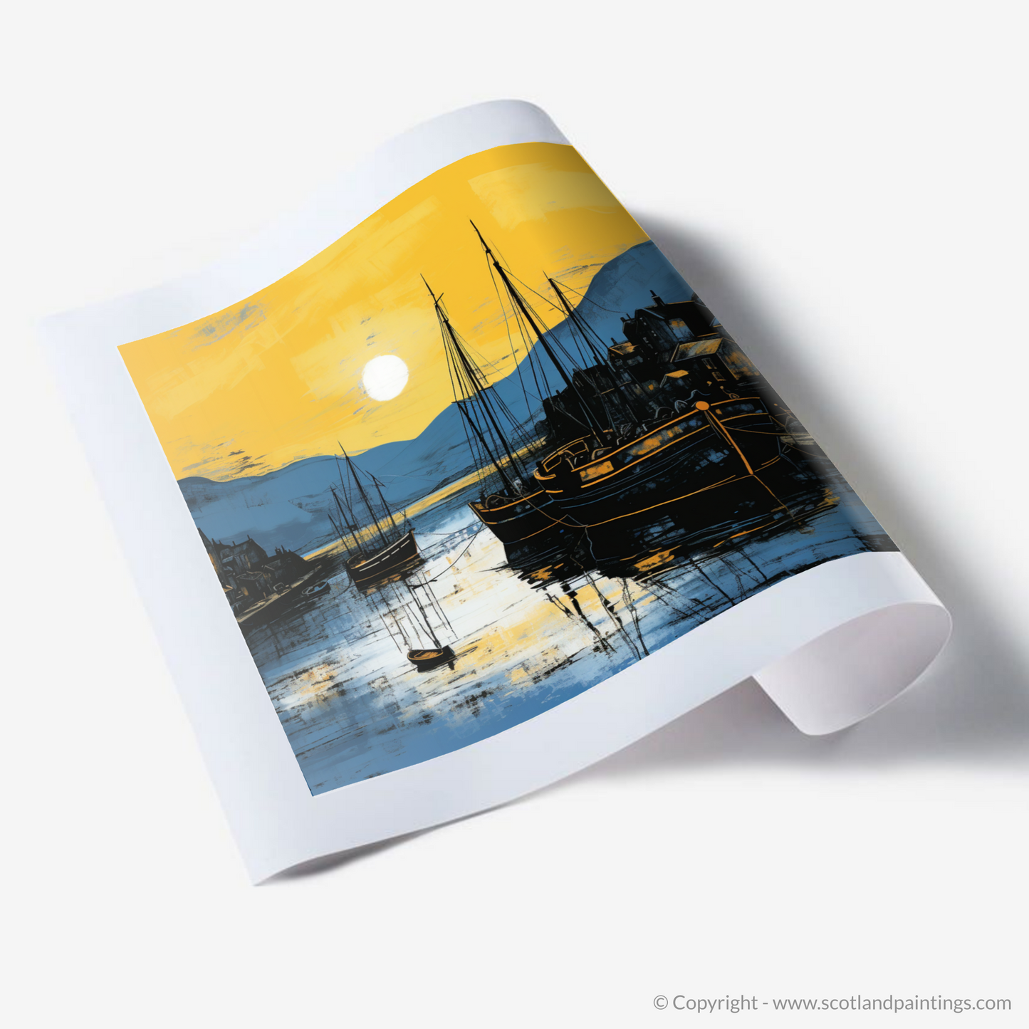Bathed in the golden hues of a setting sun, the harbour at Craobh Haven comes alive on this exquisite print, a part of our cherished 'Scottish Harbours' collection. Vivid yellow and amber tones cast a warm glow over the serene waters, capturing the harbour in a magical moment of stillness as dusk settles over the landscape.