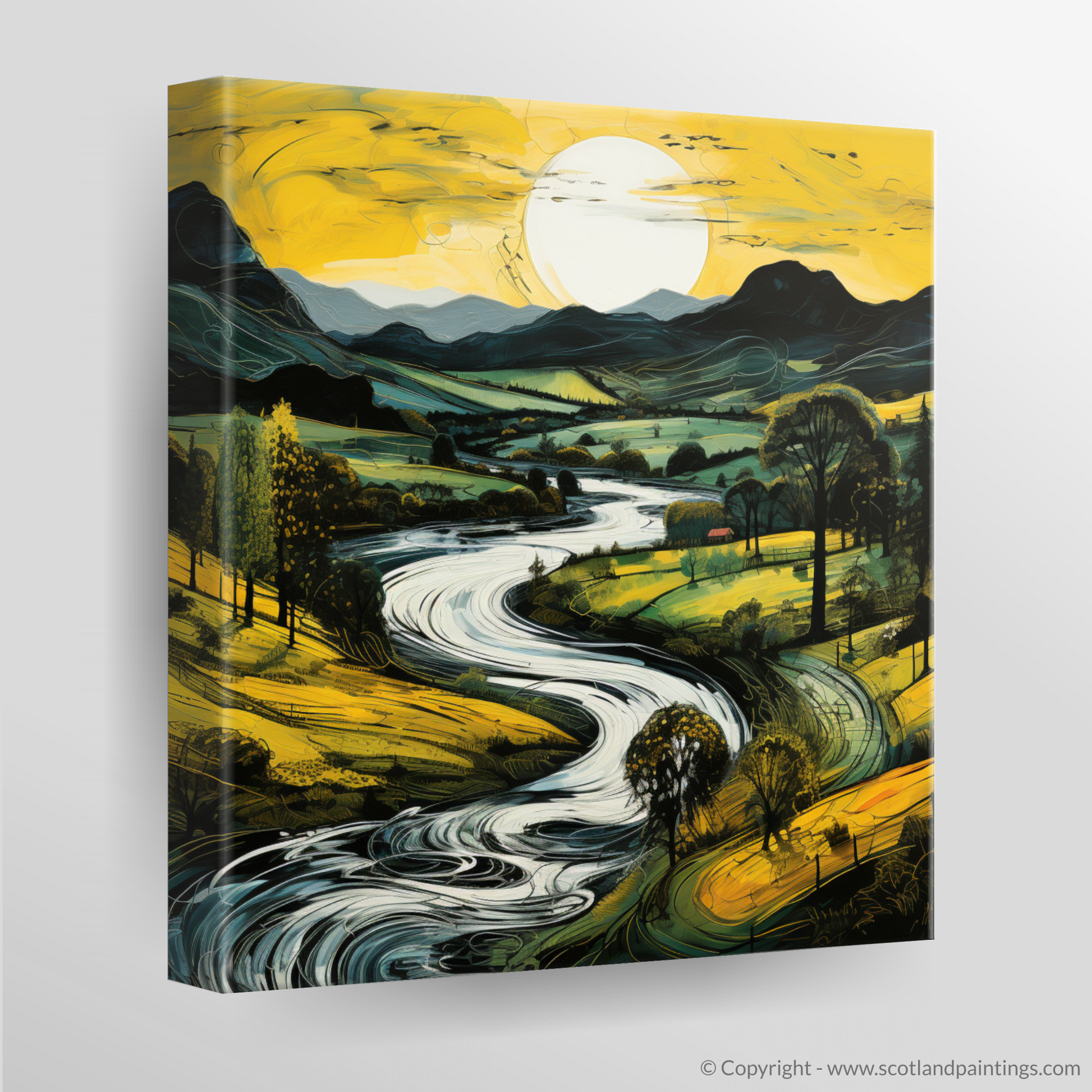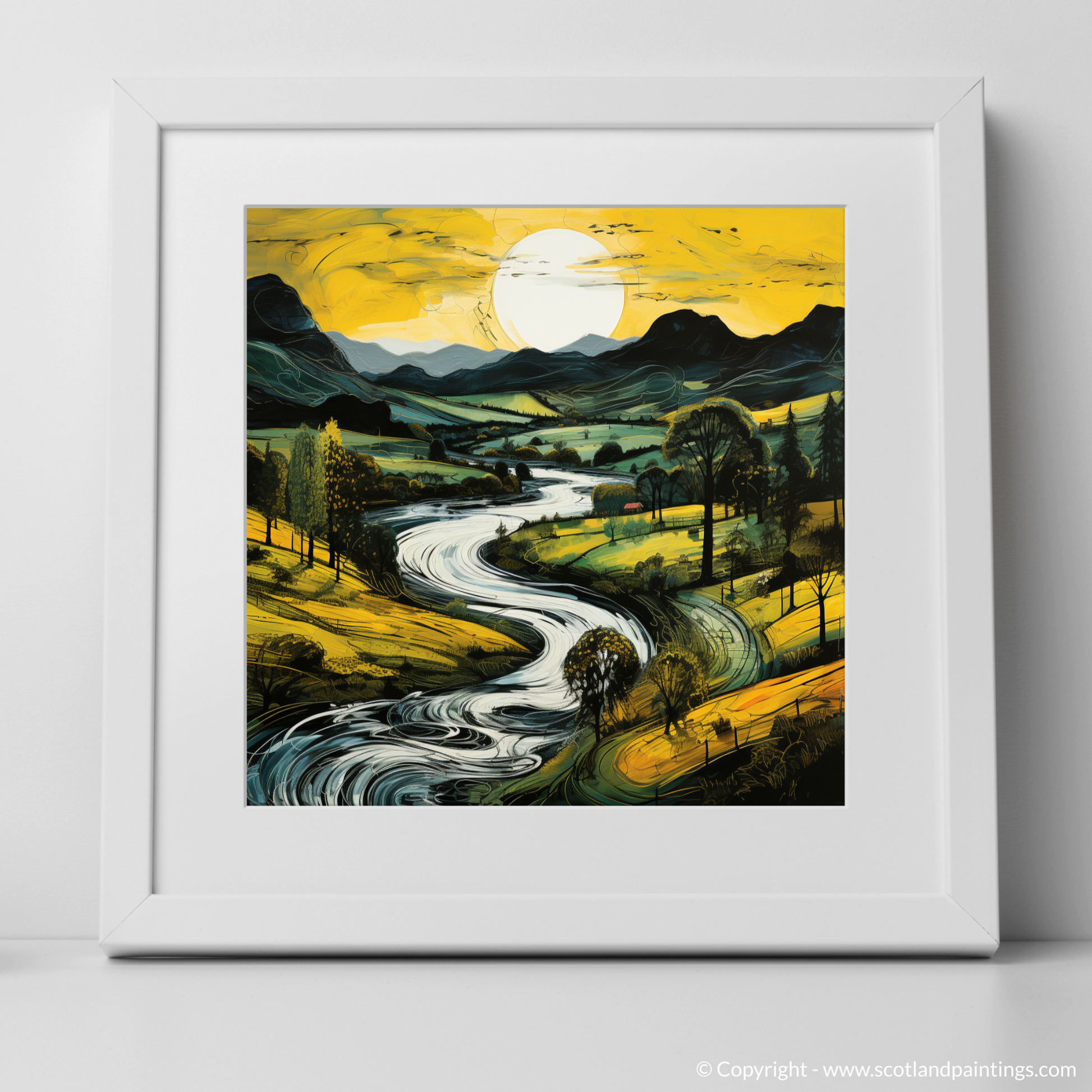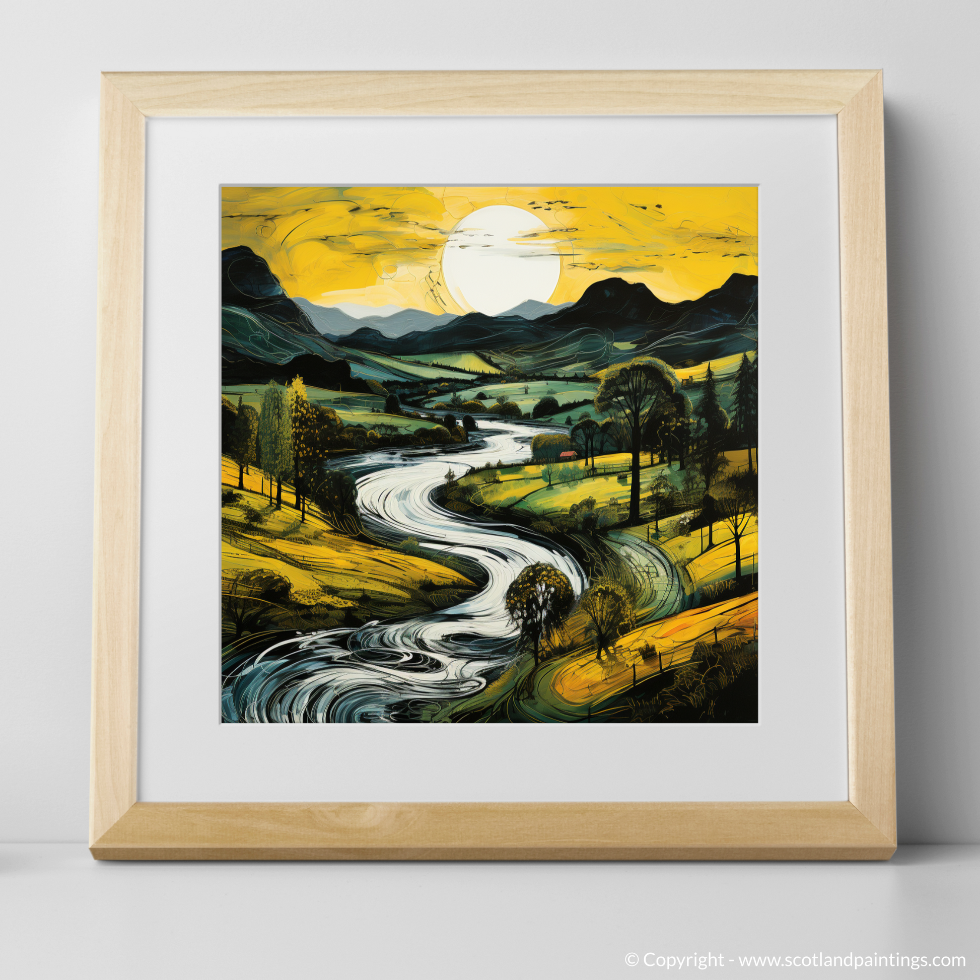 Flowing effortlessly, the river courses past clusters of trees, their canopies a dark silhouette against the painted evening light. Each stroke of colour contributes to a scene that is alive with movement, as if the gentle breeze that caresses the valley has been captured in the meandering lines and swirls of the water's surface. Darker mountain forms rise majestically in the background, their peaks etched against the soft light, a symphony of tranquil blues and purples that recount the majesty of the Scottish highlands.