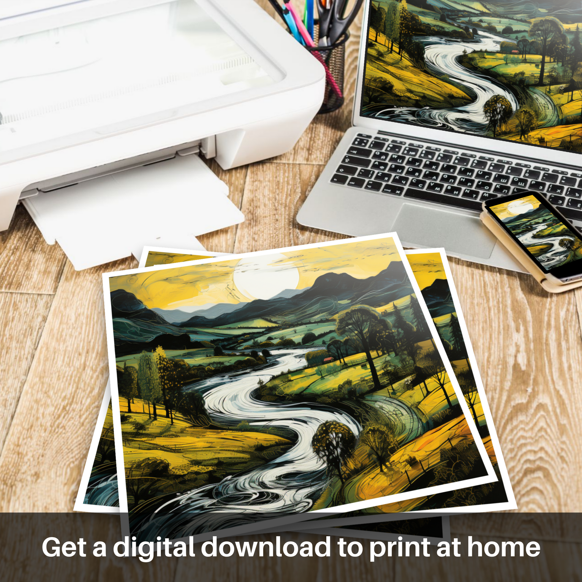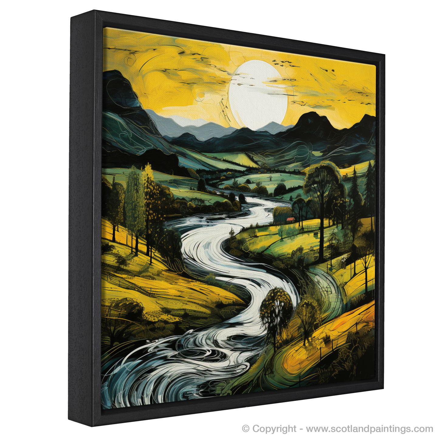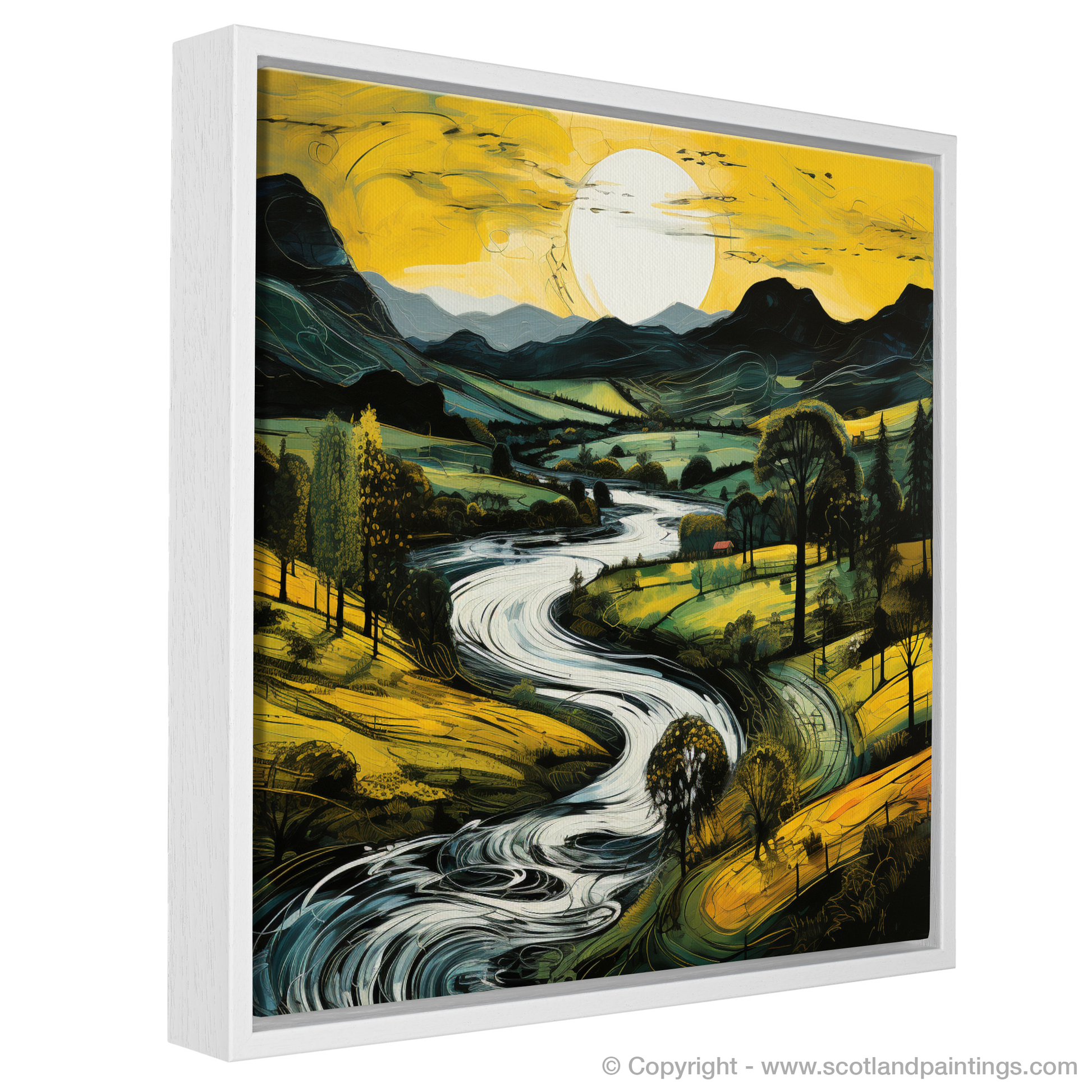 Flowing effortlessly, the river courses past clusters of trees, their canopies a dark silhouette against the painted evening light. Each stroke of colour contributes to a scene that is alive with movement, as if the gentle breeze that caresses the valley has been captured in the meandering lines and swirls of the water's surface. Darker mountain forms rise majestically in the background, their peaks etched against the soft light, a symphony of tranquil blues and purples that recount the majesty of the Scottish highlands.