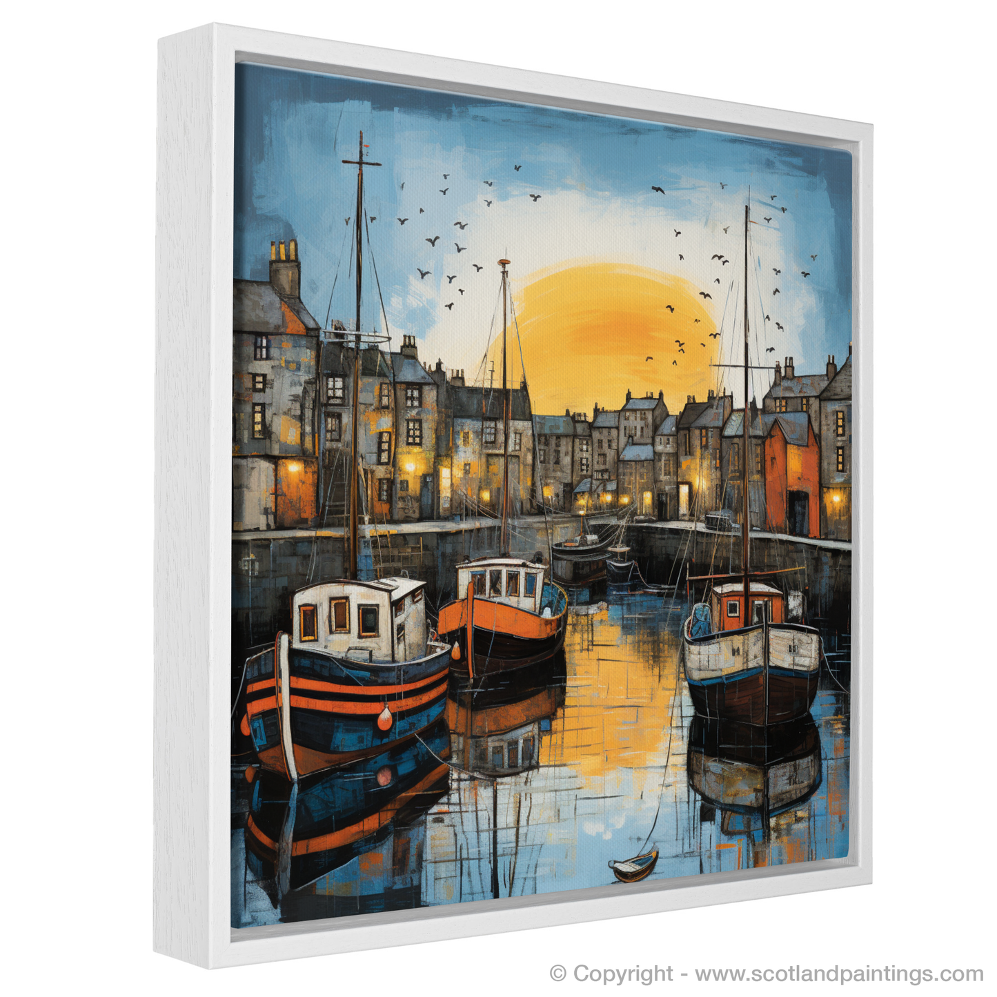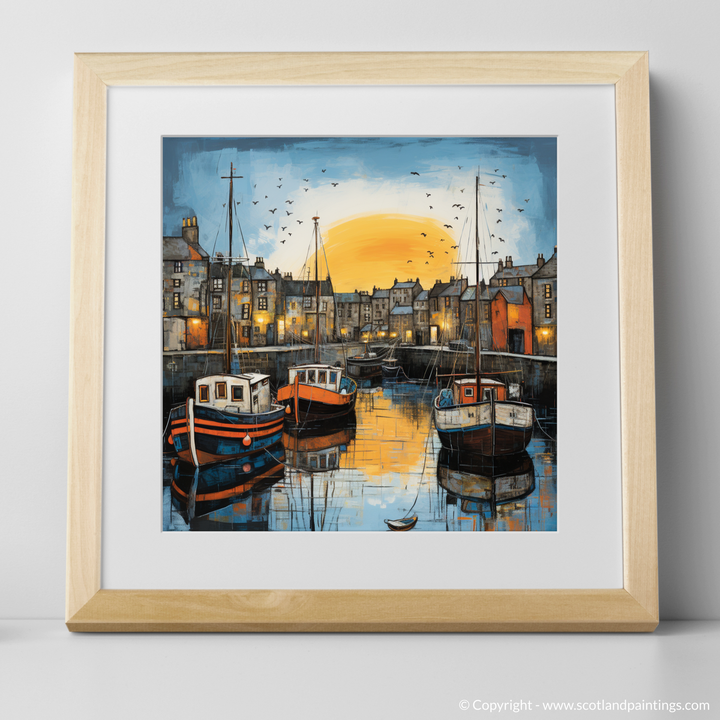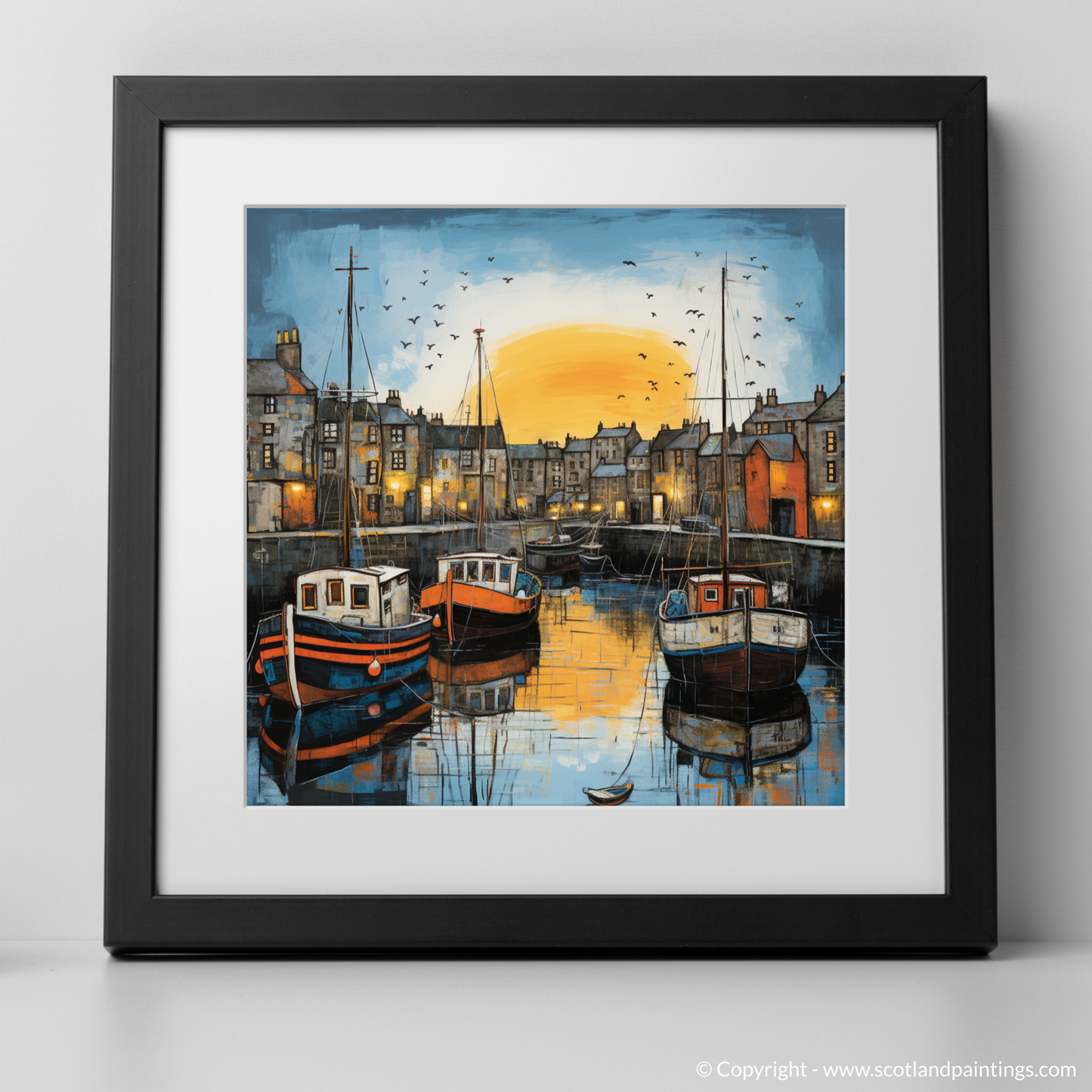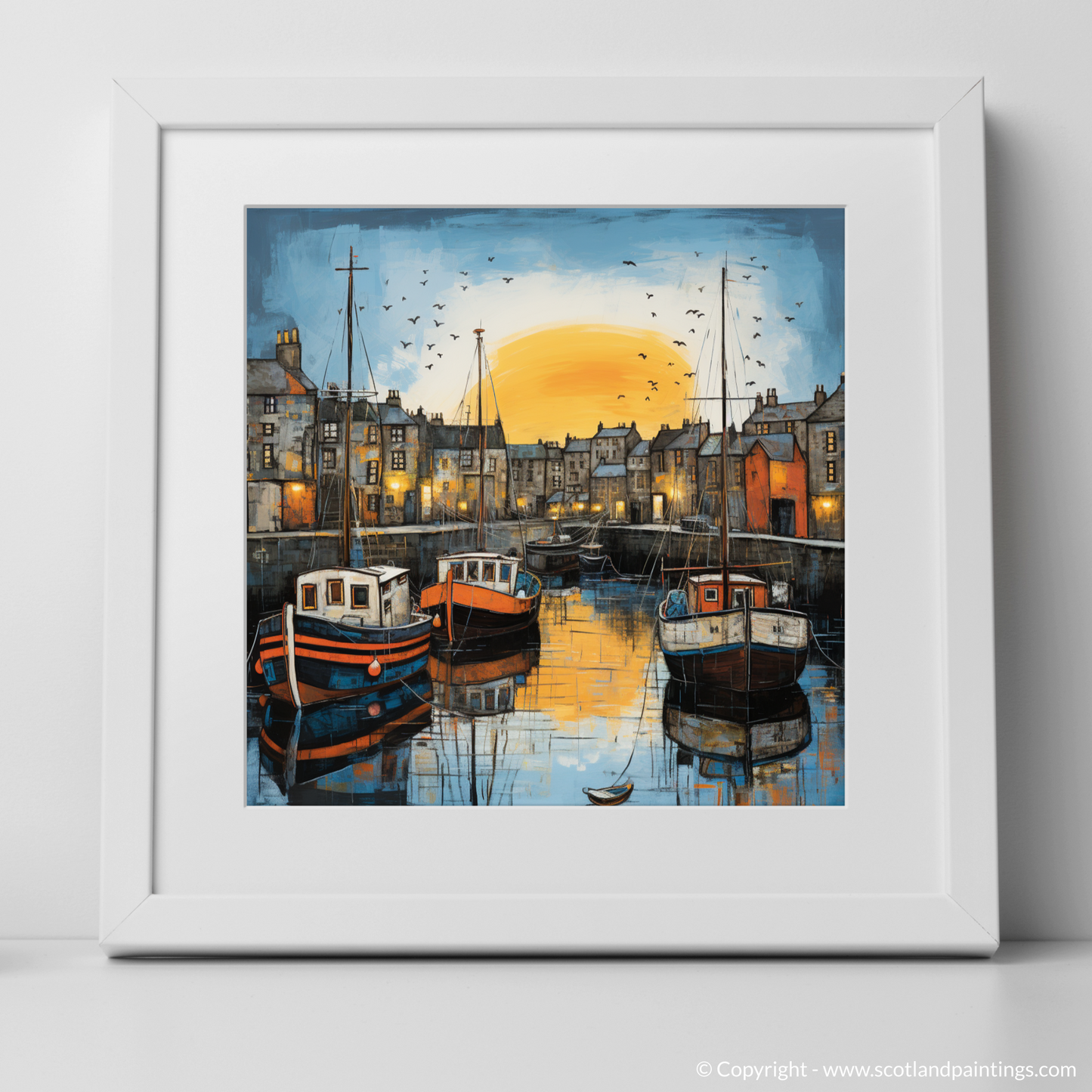 Capturing the serene beauty of Findochty Harbour at the magical hour of dusk, this evocative print is a celebration of colour and mood. The scene unfolds with vivid charm as the setting sun casts its mellow glow across both the sky and the water, blanketing the scene in a warm golden hue that contrasts with the deepening blues of the twilight sky.