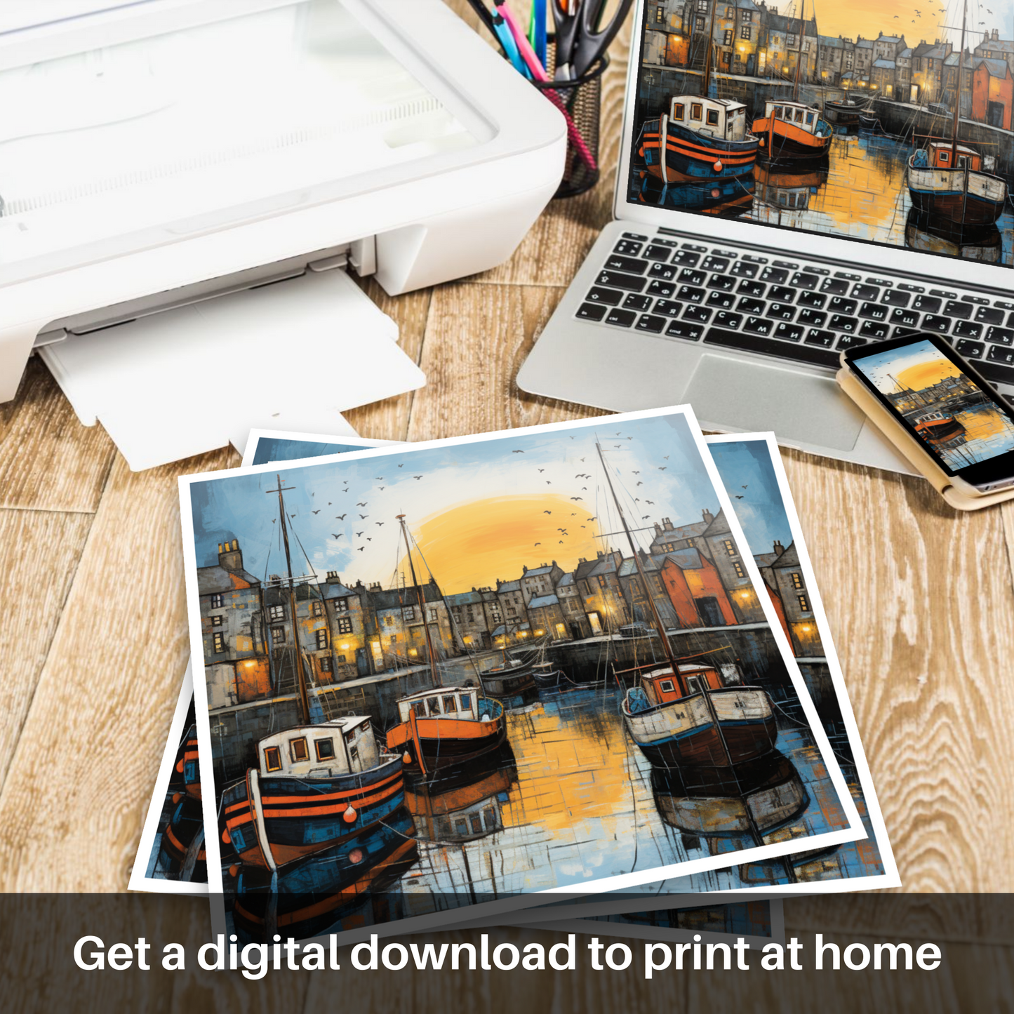 This print is a cornerstone in our 'Scottish Harbours' collection, offering a visual escape to the enchanting shores of Scotland—right from the comfort of your own home. Whether you are drawn to marine landscapes, appreciate the unique interpretation of expressionist art, or simply love to collect evocative scenes, this illustration promises to be a stunning addition to any collection.