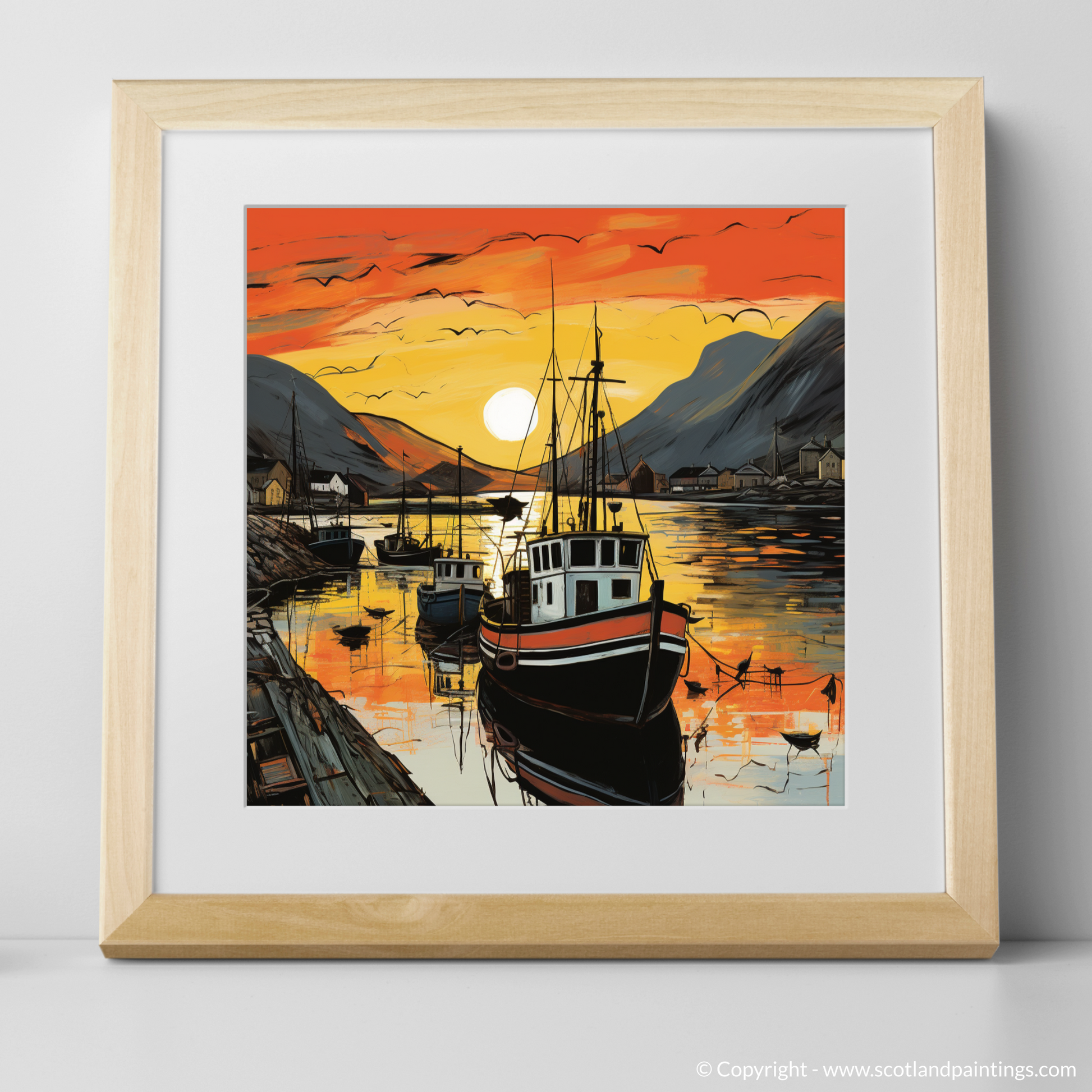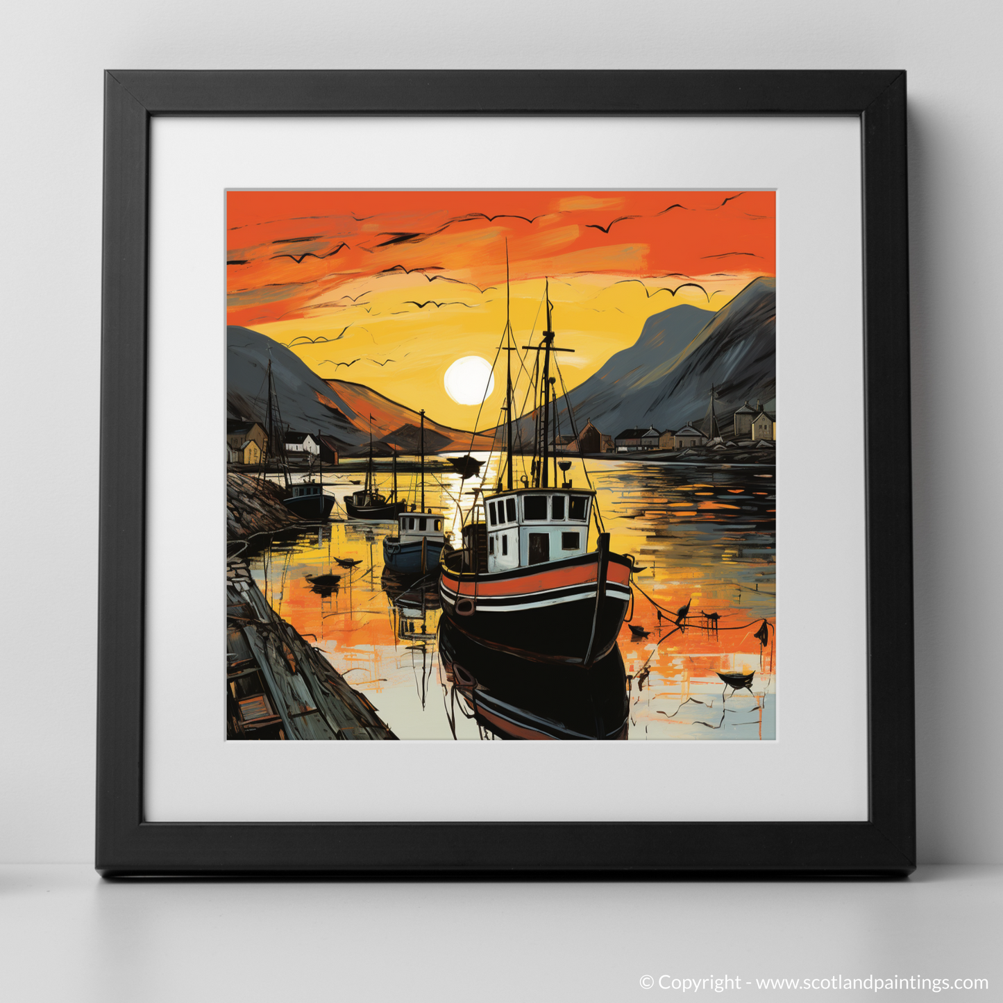Artistic splashes and bold brushstrokes inject the atmosphere with a palpable energy, allowing the viewer to feel the cadence of the harbour’s life and the quietude of sunset. This fascinating play of light and shadow, coupled with the vivid expressionist technique, makes this print a captivating addition to any space that cherishes the unique blend of Scottish maritime tradition and vibrant visual artistry. Discover the allure of the Scottish coast through this stirring visual narrative that speaks to the heart of harbour life at the twilight's embrace.