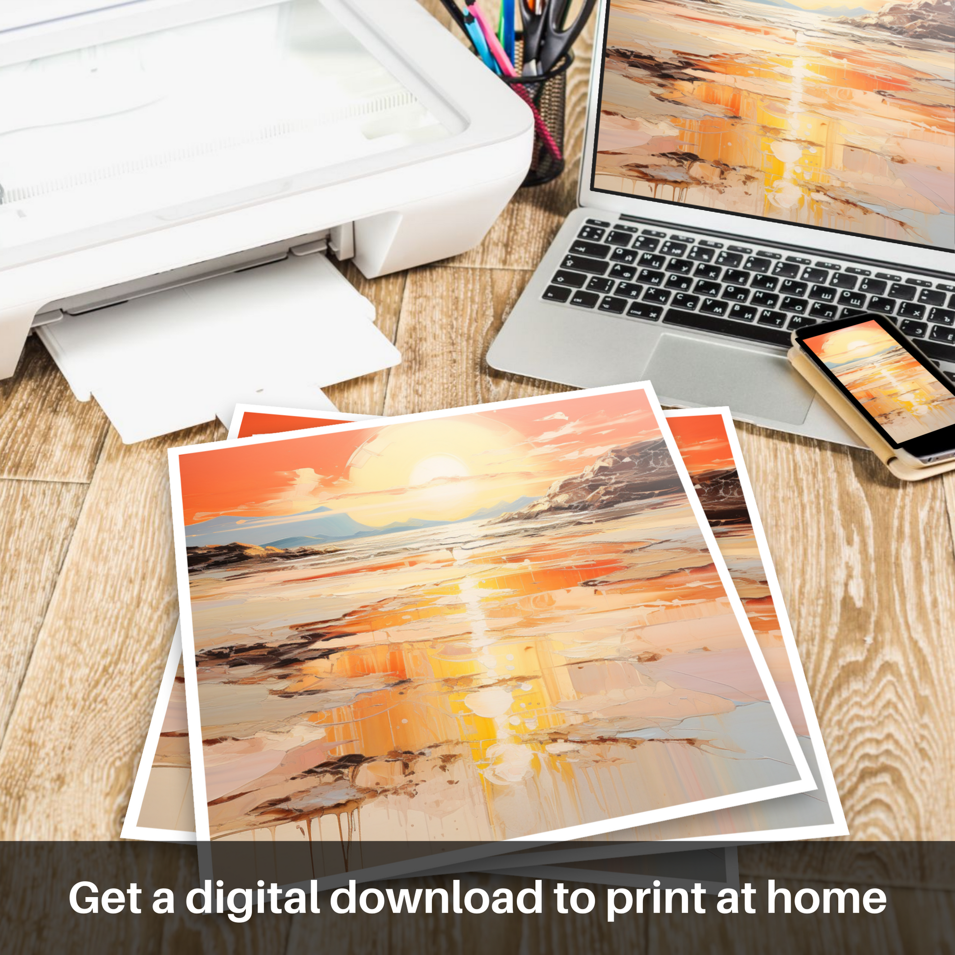 The artwork revels in a symphony of warm, sun-kissed hues; swathes of tangerine, amber, and coral dance across the canvas, mingling with wisps of ivory to create a sky that reflects its splendour onto the tranquil sea below. The descending sun is a glowing orb, generously spilling its light across the waters, transforming them into a mirrored palette of gold and copper, speckled with highlights of brilliant white where the sun kisses the waves.