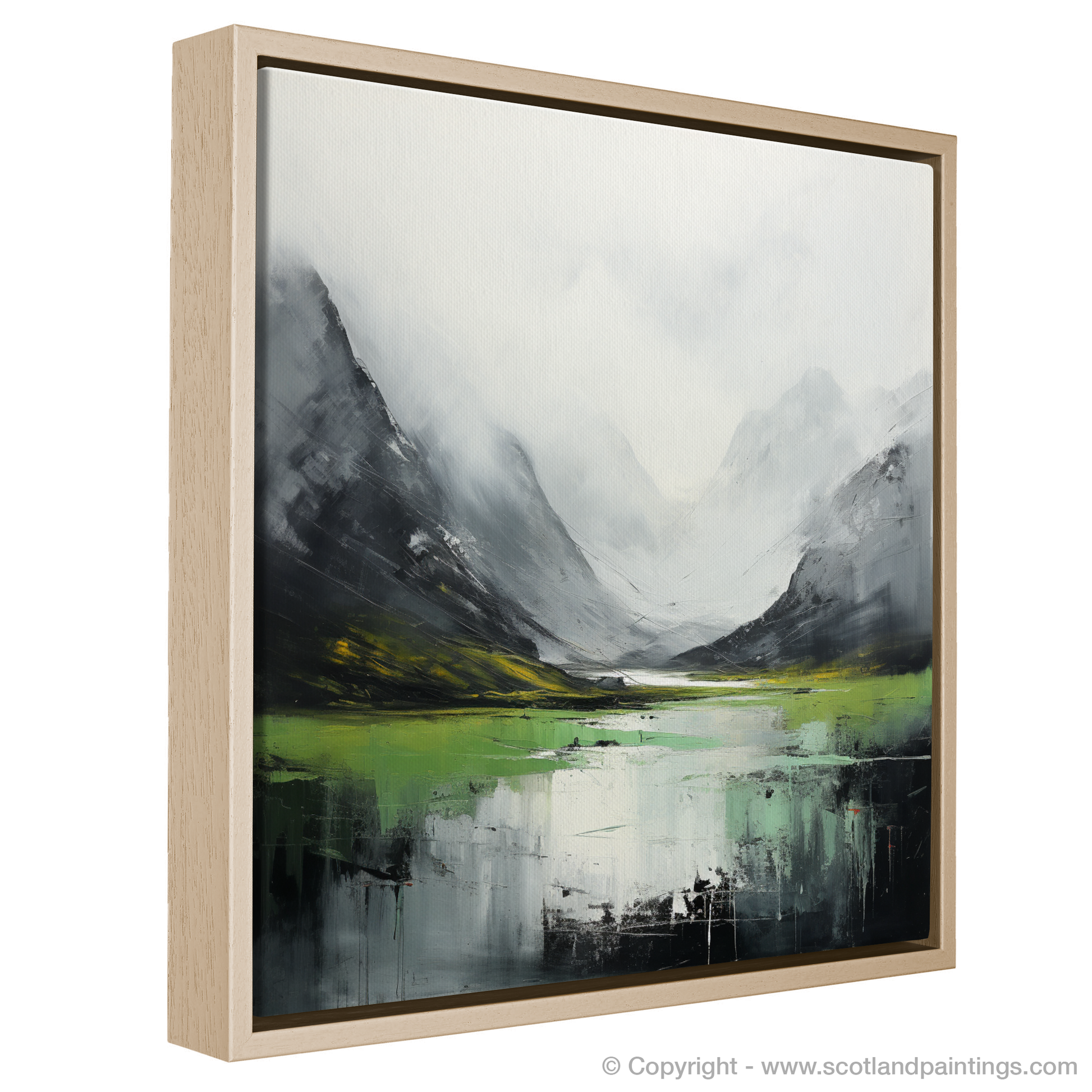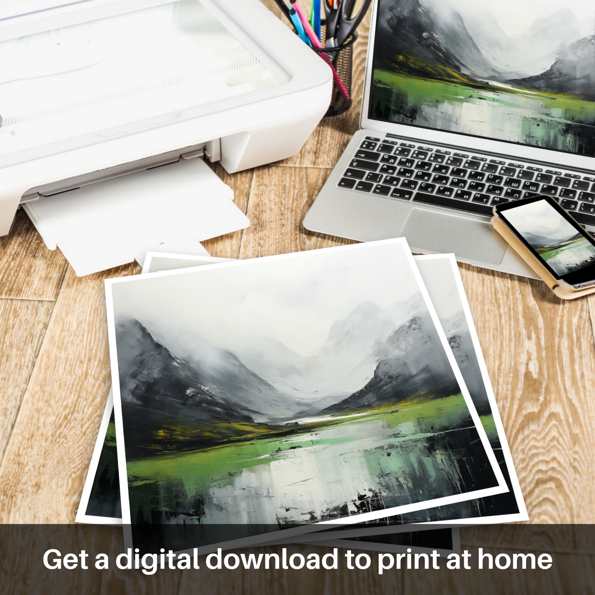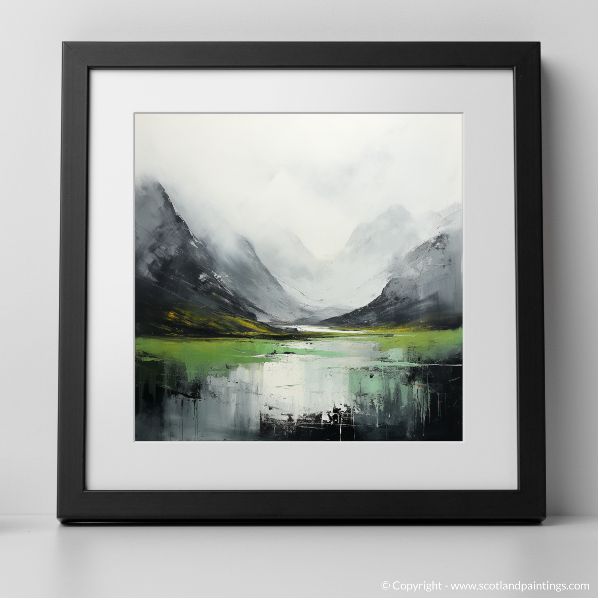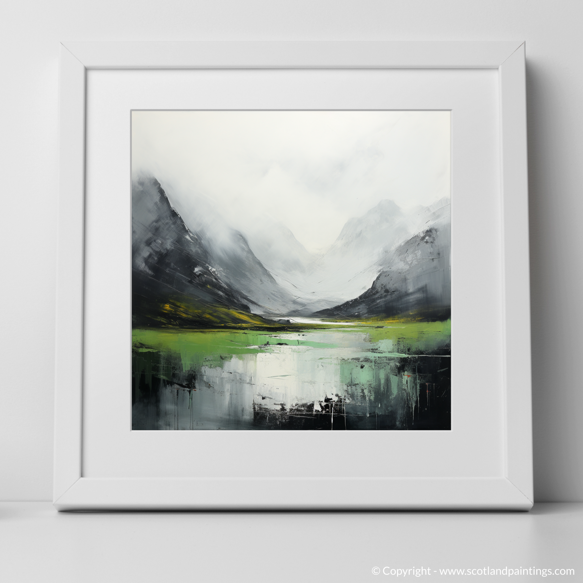 Drawing from the enigmatic heart of the Scottish Highlands, this evocative print captures the awe-inspiring essence of Glen Coe. Broad, sweeping strokes and a muted palette suggest the rugged silhouettes of towering mountains shrouded in a gossamer veil of mist and mystery. This abstract interpretation brings to life the stark contrasts where light, landscape, and weather collide.