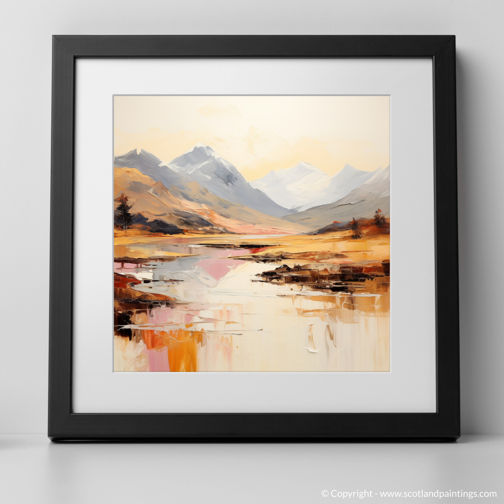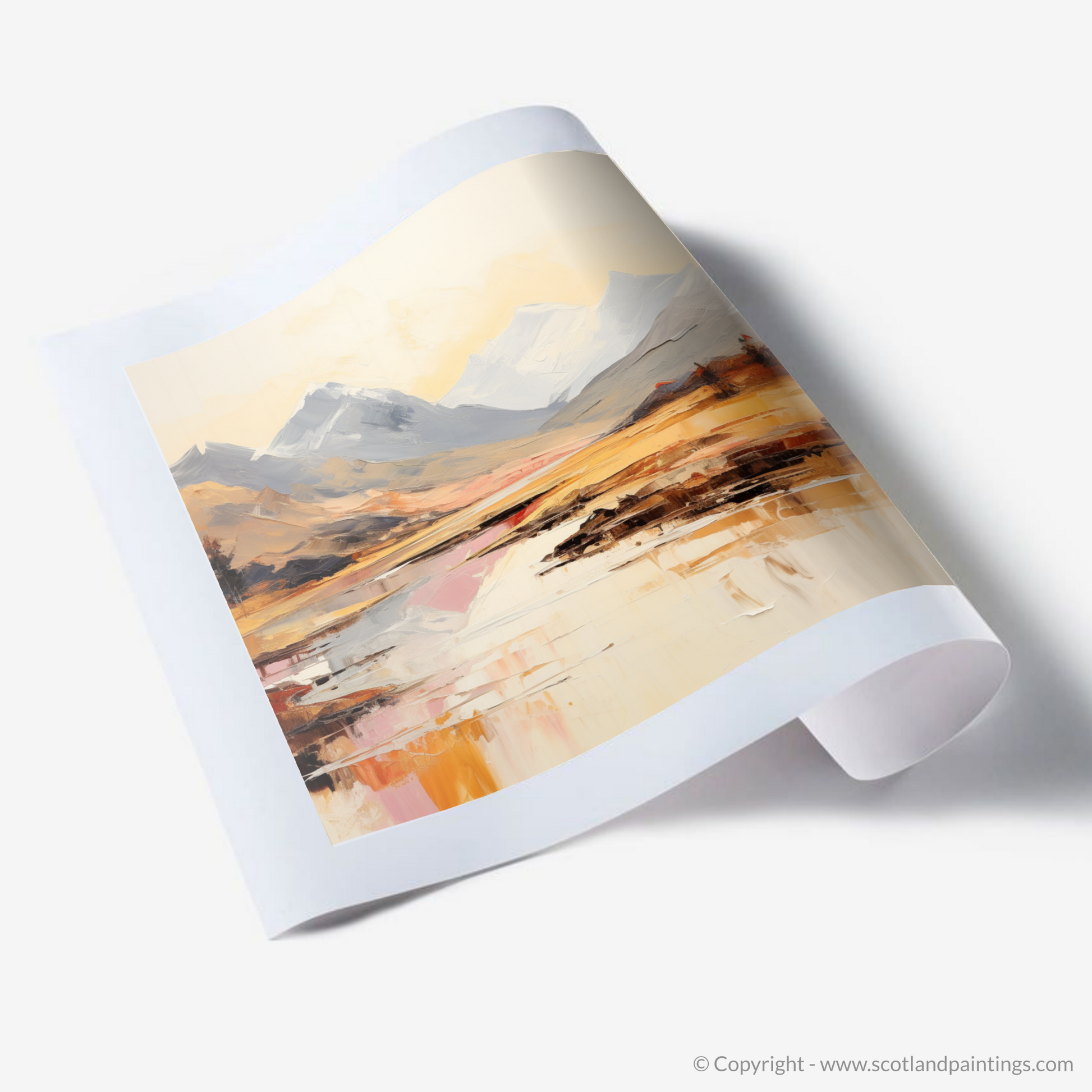 As dawn breaks over the Highland's most majestic landscape, this abstract vision of Glen Coe encapsulates the untamed beauty of Scotland's natural splendour. Swathes of warm amber, burnt sienna, and soft peach hues catch the early light, casting a serene glow across the heather-laden valleys and craggy hilltops. The crisp outlines of the mountains emerge in the background in shades of slate grey and pale azure, their peaks etched against the sky with a boldness that commands attention.