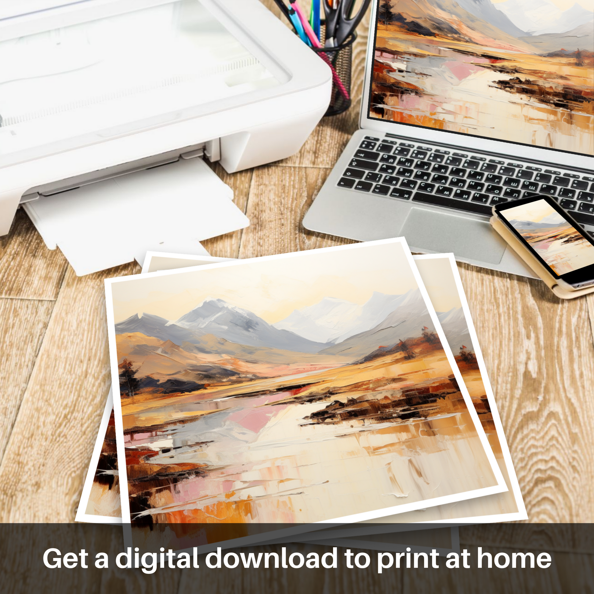 This piece serves as a stunning tribute to the raw and rugged wilderness of the Scottish Glens. Let your imagination wander through the distilled essence of Glen Coe, brought to life with expressive brushwork that blurs the line between reality and impression. Ideal for those who find solace in the great outdoors, this print will imbue any space with the tranquillity and arresting beauty of the Highlands.