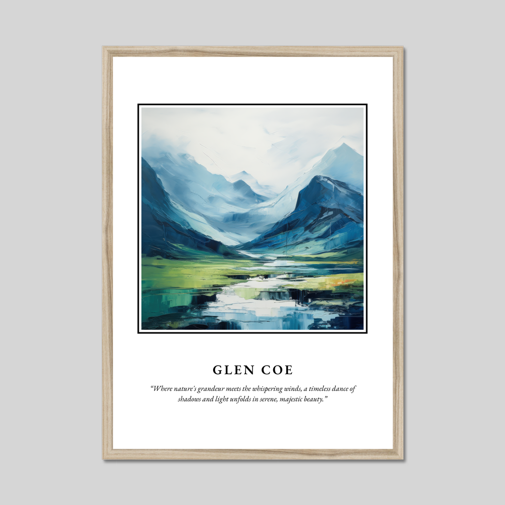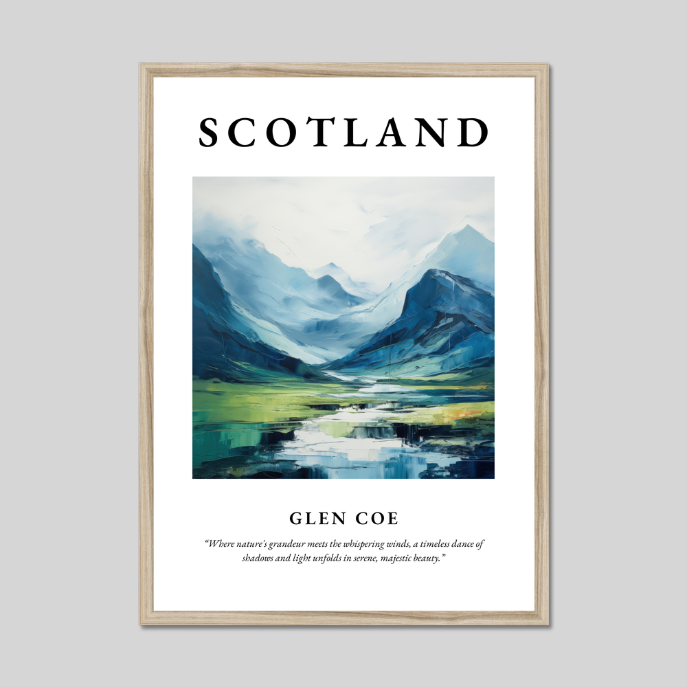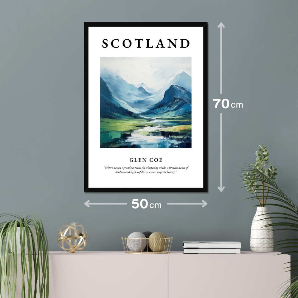 Transform your living space with the stunning splendor of our framed poster print, an exquisite homage to Glen Coe, Scotland. Measuring an impressive 50cm x 70cm, this eye-catching piece commands attention, making it the perfect statement for a large wall area without breaking the bank. Available in your choice of black, white, or natural wood-effect frames, it offers versatility to complement any decor.