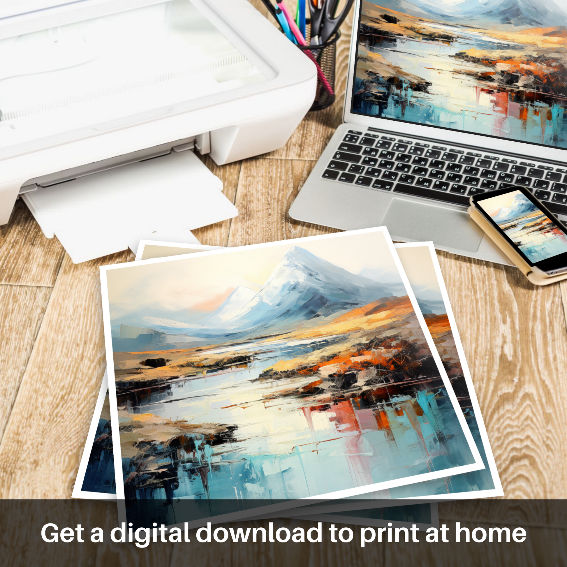 Immerse yourself in the rugged majesty of the Scottish Highlands with this evocative abstract print, capturing the formidable essence of Buachaille Etive Mòr. Bold, expressive brushstrokes build upon one another to shape the view, where ethereal blue hues intertwine with fiery oranges and earthy tones, suggestive of the changing colours of the mountainous terrain from dawn to dusk.