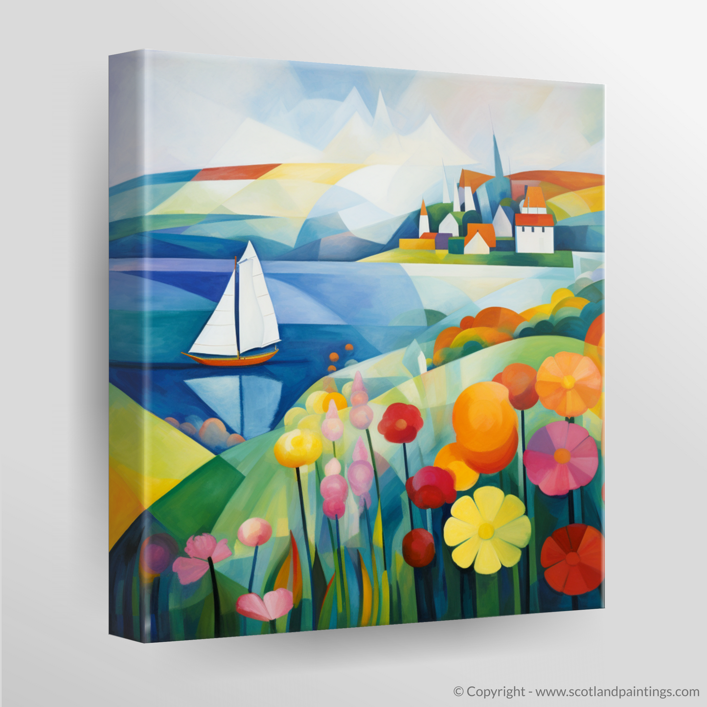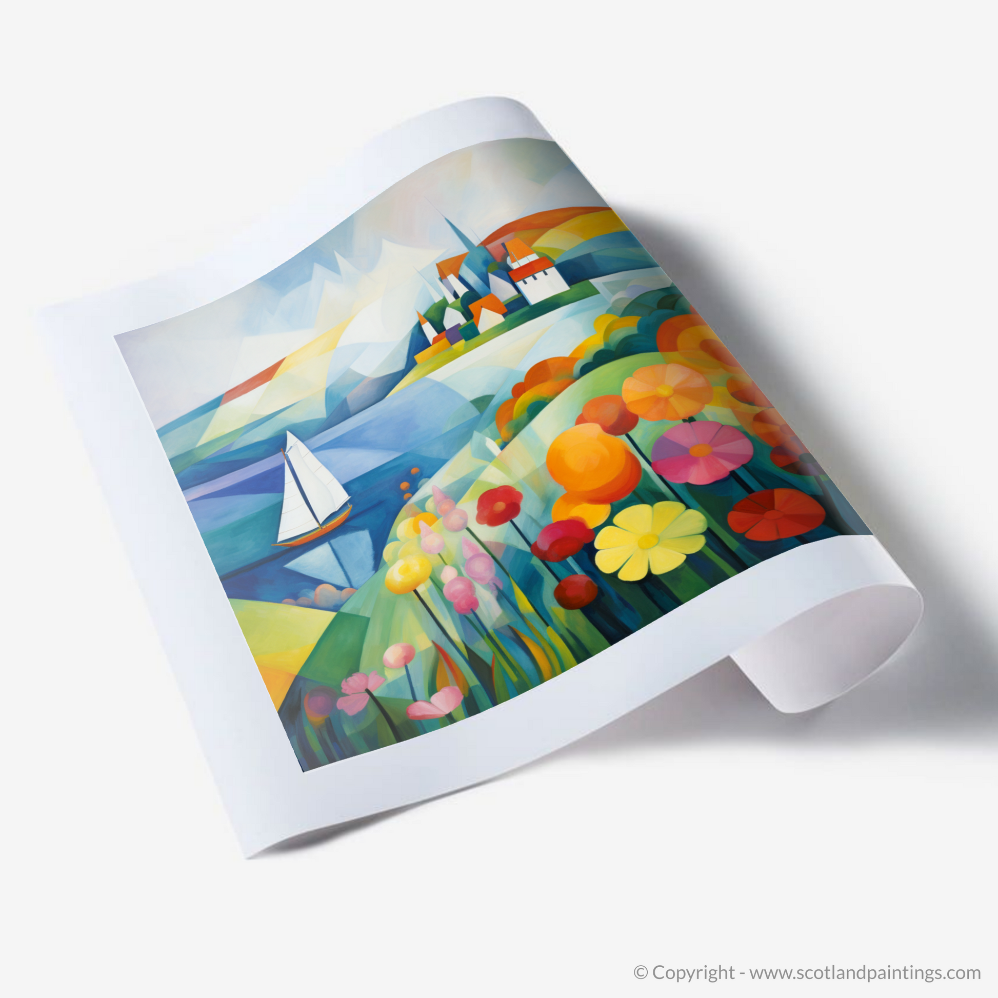 In the foreground, a lush tapestry of flora bursts with an array of radiant colours. Stylised blossoms in shades of scarlet, peach, buttery yellow, and soft pink sway on slender stems, evoking a sense of windswept movement across the picturesque landscape. These effervescent hues embody the vitality and spirit of Gigha's natural flora.