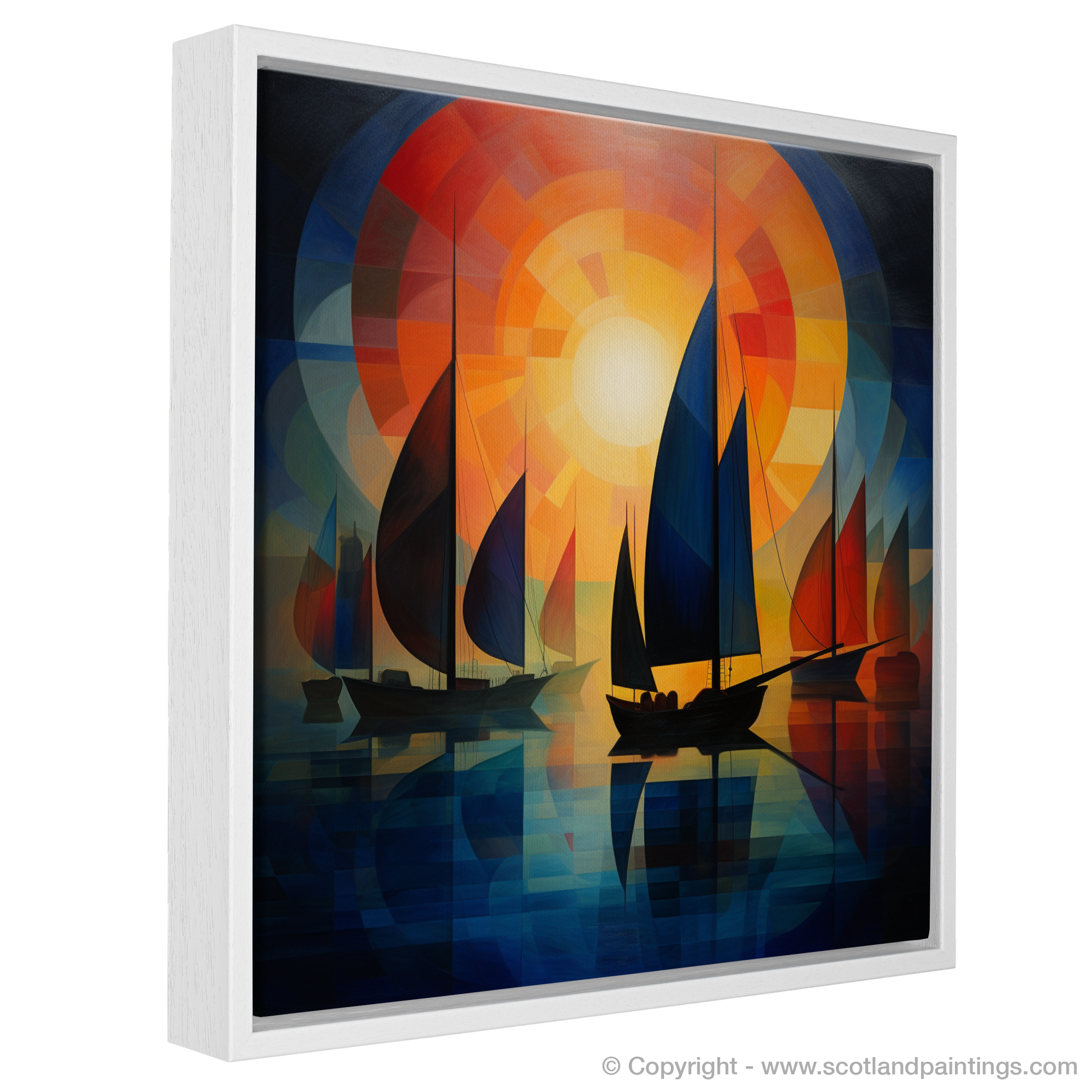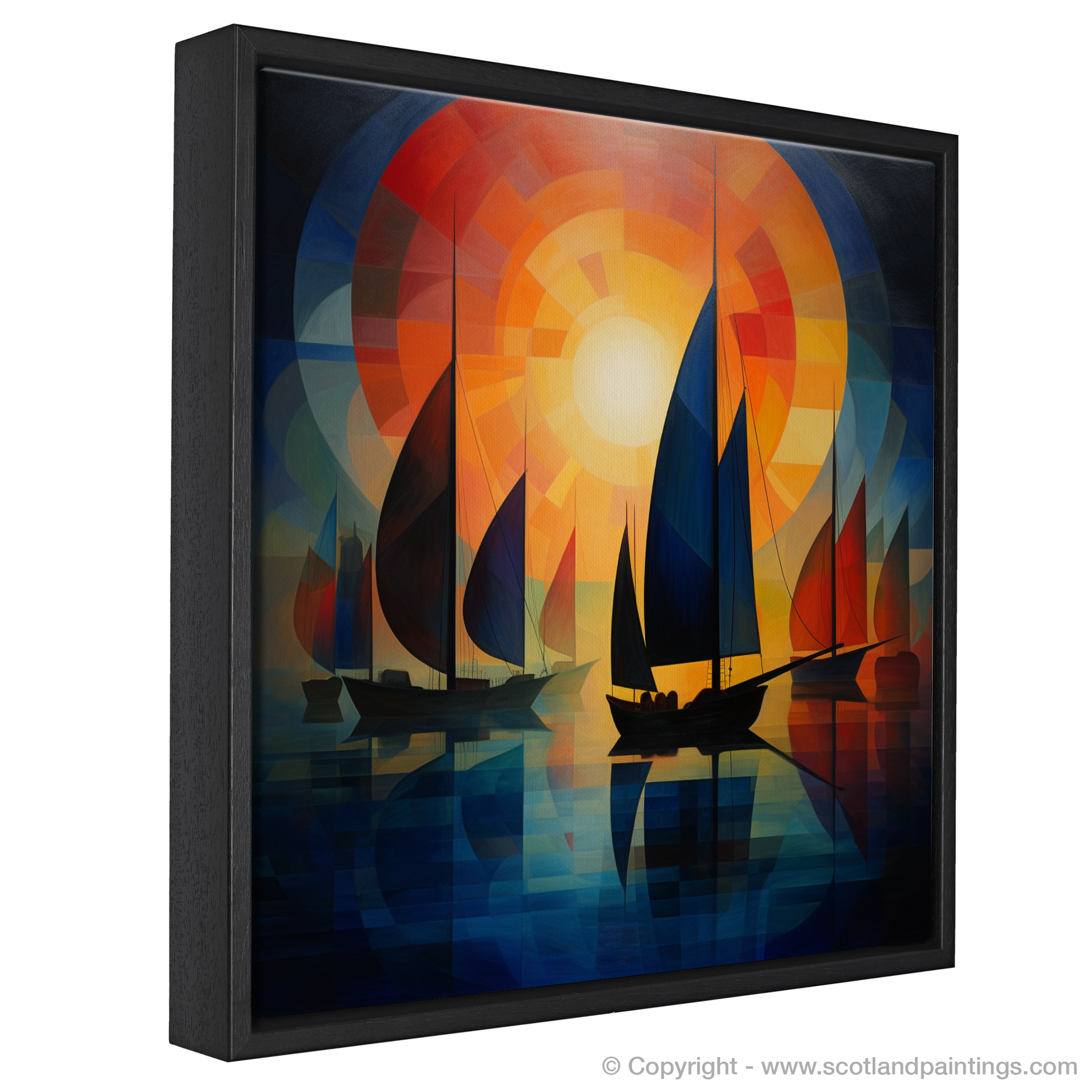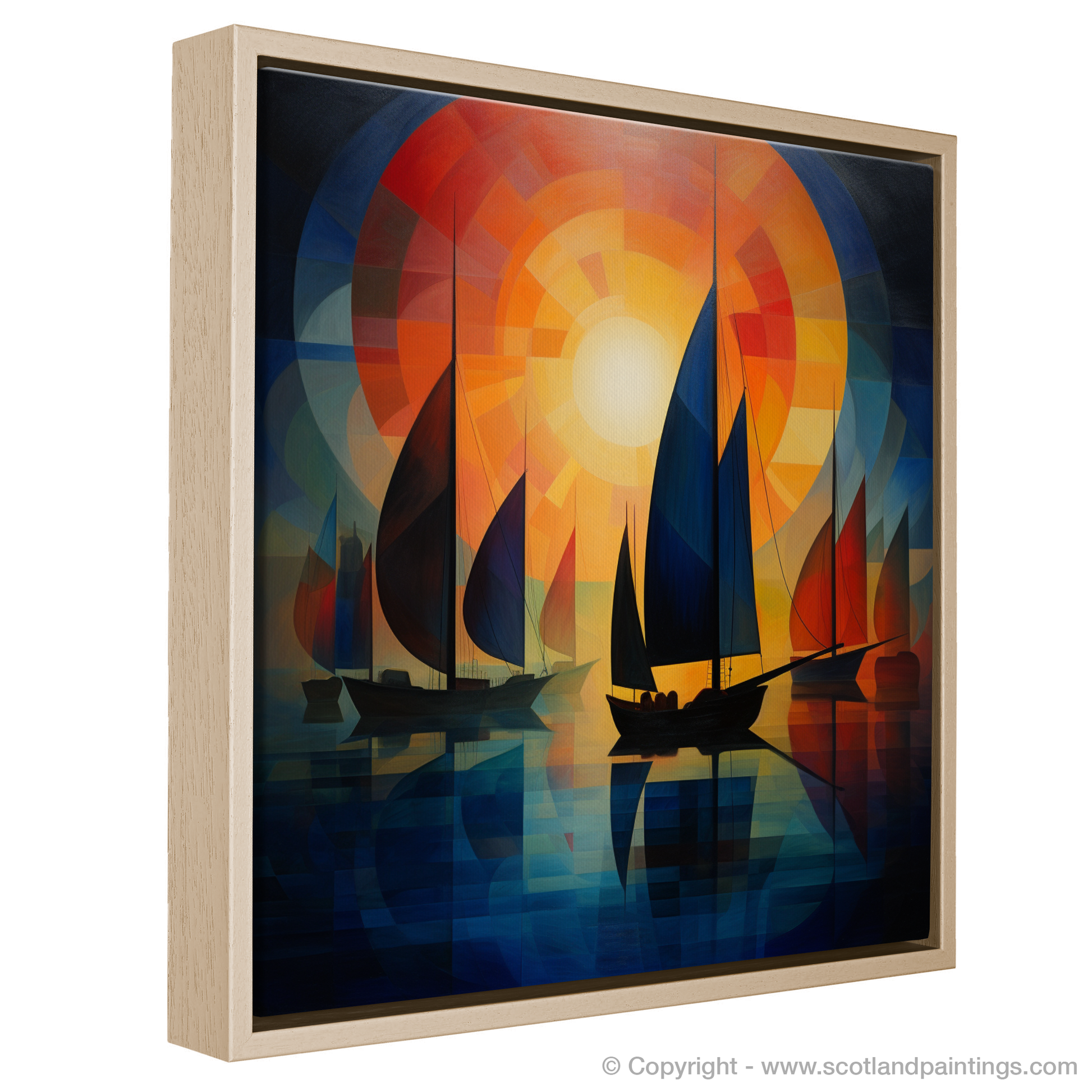 The pulsating rays of the descending sun radiate across the sky, their reflection shimmering on the tranquil waters below. Boats, varying in shape and size, stand out against the illuminated backdrop; their sails are a mosaic of rich, contrasting colours, reminiscent of stained glass. These geometric forms hint at the movement of the gentle sea breeze, giving the image a sense of motion.