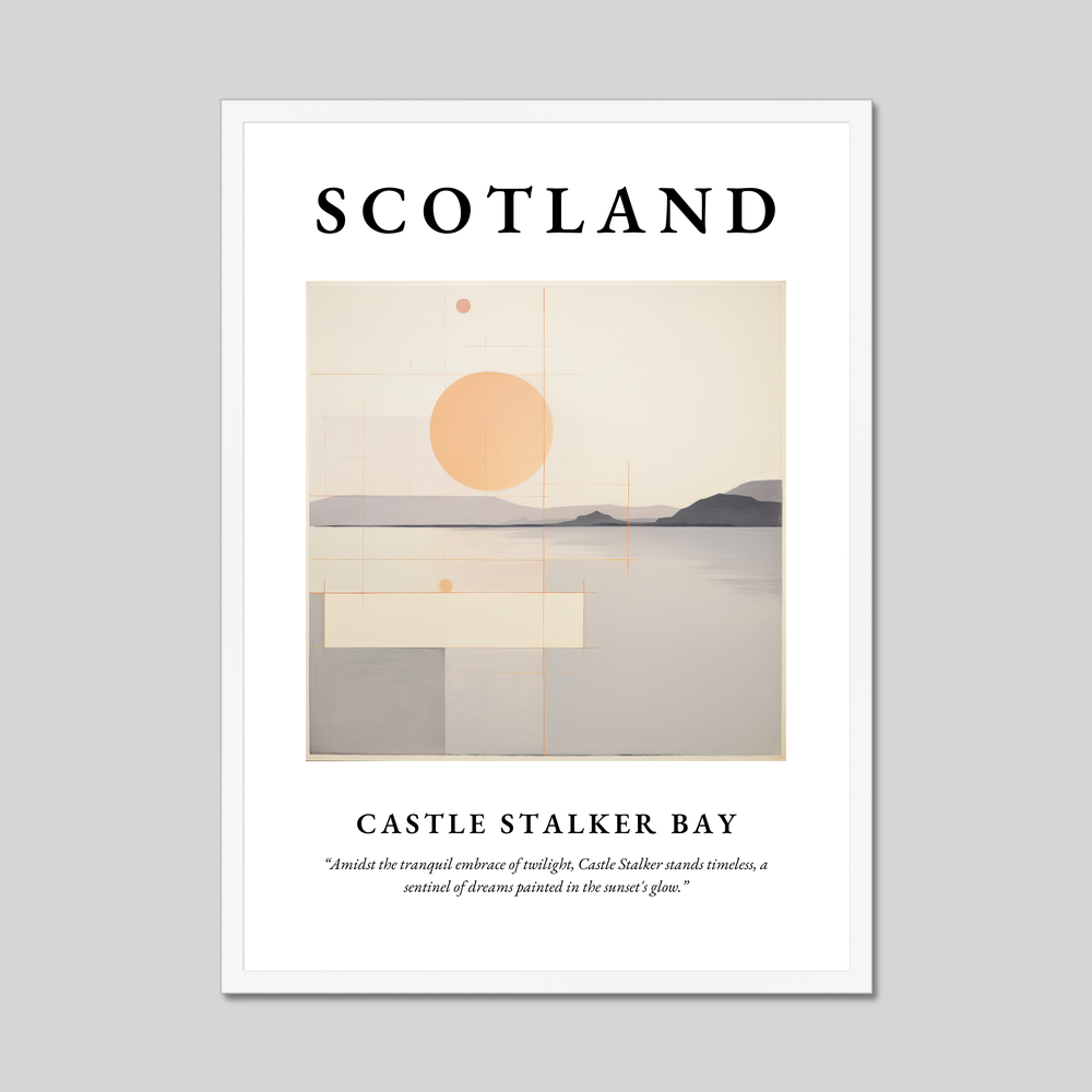 The word “SCOTLAND” proudly crowns the composition, drawing the viewer's attention to the heart of the poster – the mesmerising depiction of Castle Stalker Bay. The painting captures the subtle nuances of twilight, with soft hues and geometric lines that reflect the ethereal beauty of a sun setting beyond distant mountains. Beneath the artwork, the evocative quote “Amidst the tranquil embrace of twilight, Castle Stalker stands timeless, a sentinel of dreams painted in the sunset's glow.” invites contemplation and adds a poetic touch.