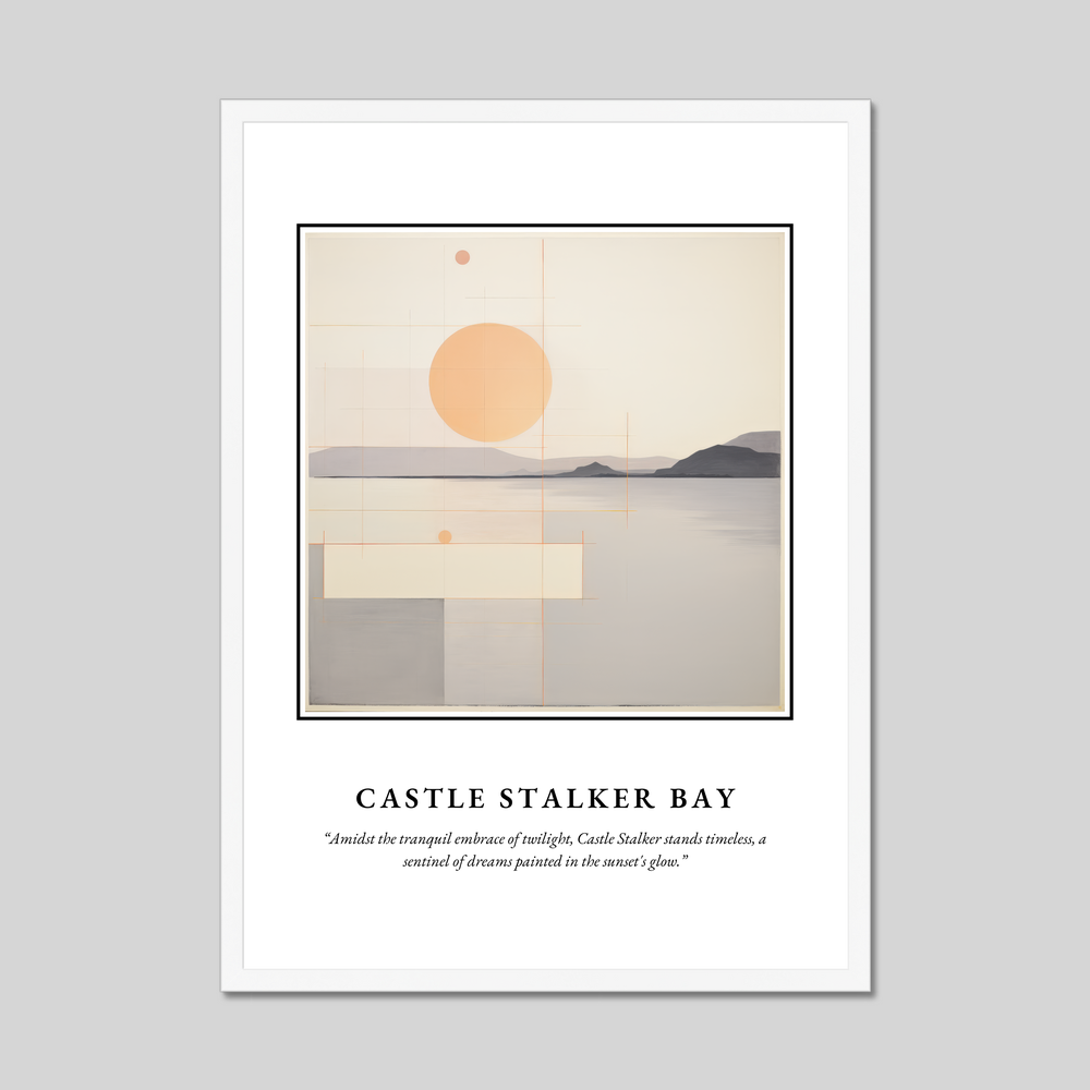 The minimalism of the artwork beautifully mirrors the serene vistas of Castle Stalker Bay, distilling its essence into a composition that is both contemporary and timeless. Whether you have walked the paths of its idyllic shores or dream of visiting, this poster print brings the soul of Scotland into your space, a gateway to memories and dreams.
