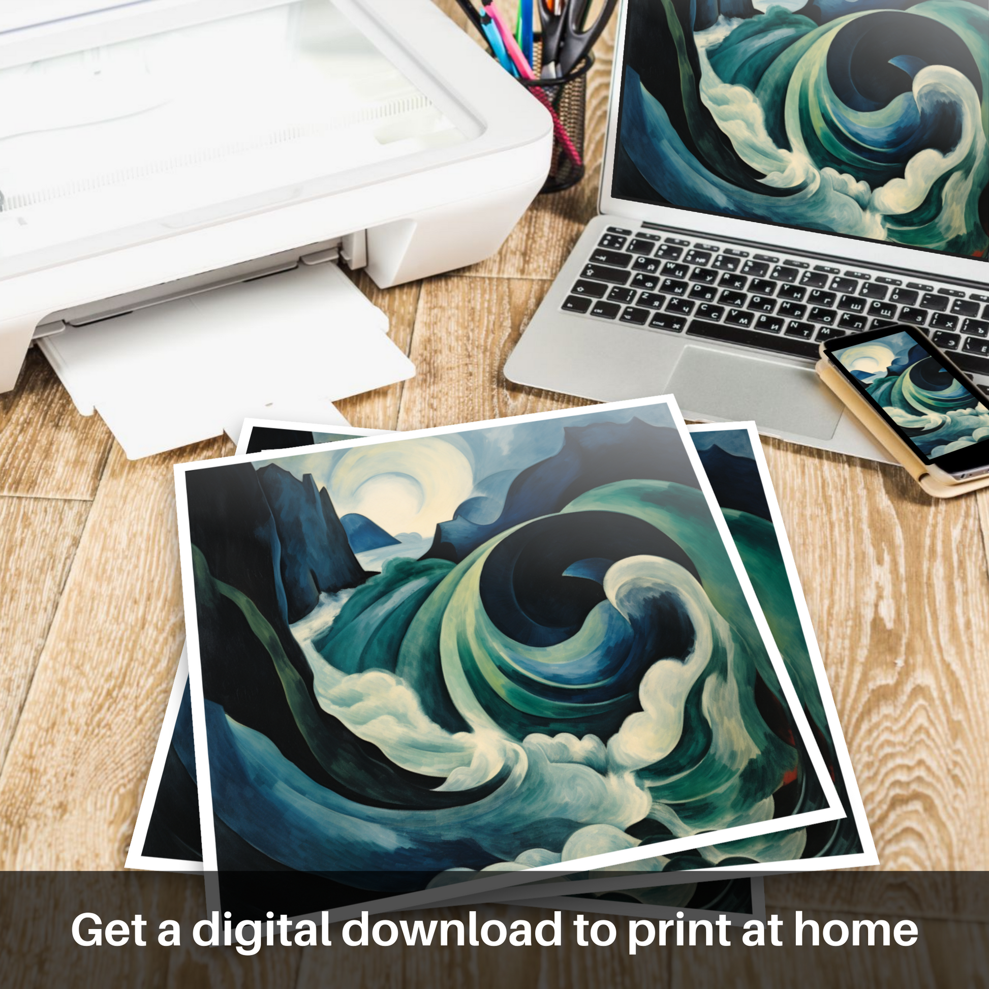 In the midst of this vivid tempest of colour, the print offers moments of serenity in the soothing curves of white foam, providing a striking contrast to the powerful waves. The movement in the artwork leads one's eyes to the horizon, where the soft glow of a pale sun dips at the edge of jagged cliff silhouettes, enticing the viewer with the harmonious balance between light and shadow.