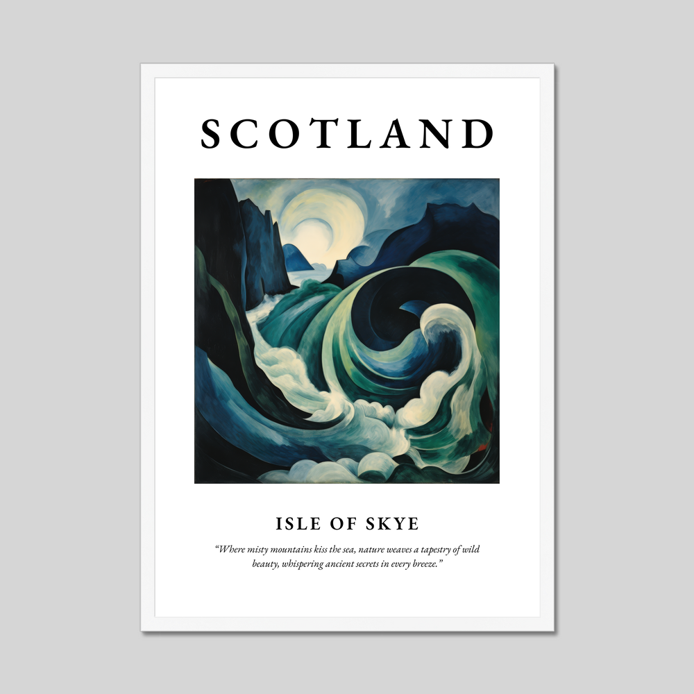 The poster unfolds with the proud declaration of "SCOTLAND" in bold lettering, setting the stage for a breathtaking abstract painting. This evocative artwork masterfully captures the Isle of Skye's wild beauty, where swirling waves and towering cliffs dance in an abstract blend of vibrant blues and greens. Beneath this masterpiece, the poetic quote, “Where misty mountains kiss the sea, nature weaves a tapestry of wild beauty, whispering ancient secrets in every breeze,” perfectly encapsulates the mystical essence of the landscape.