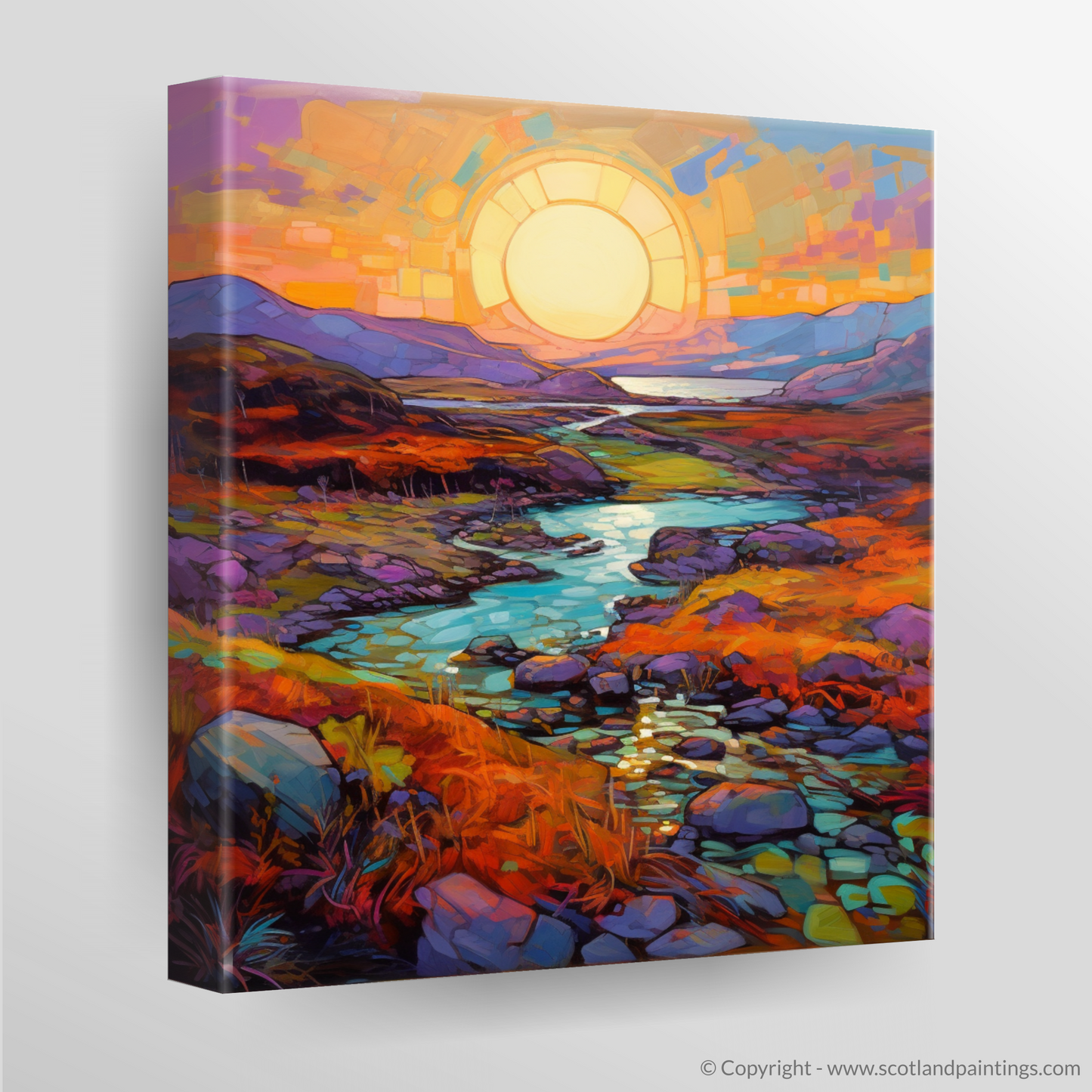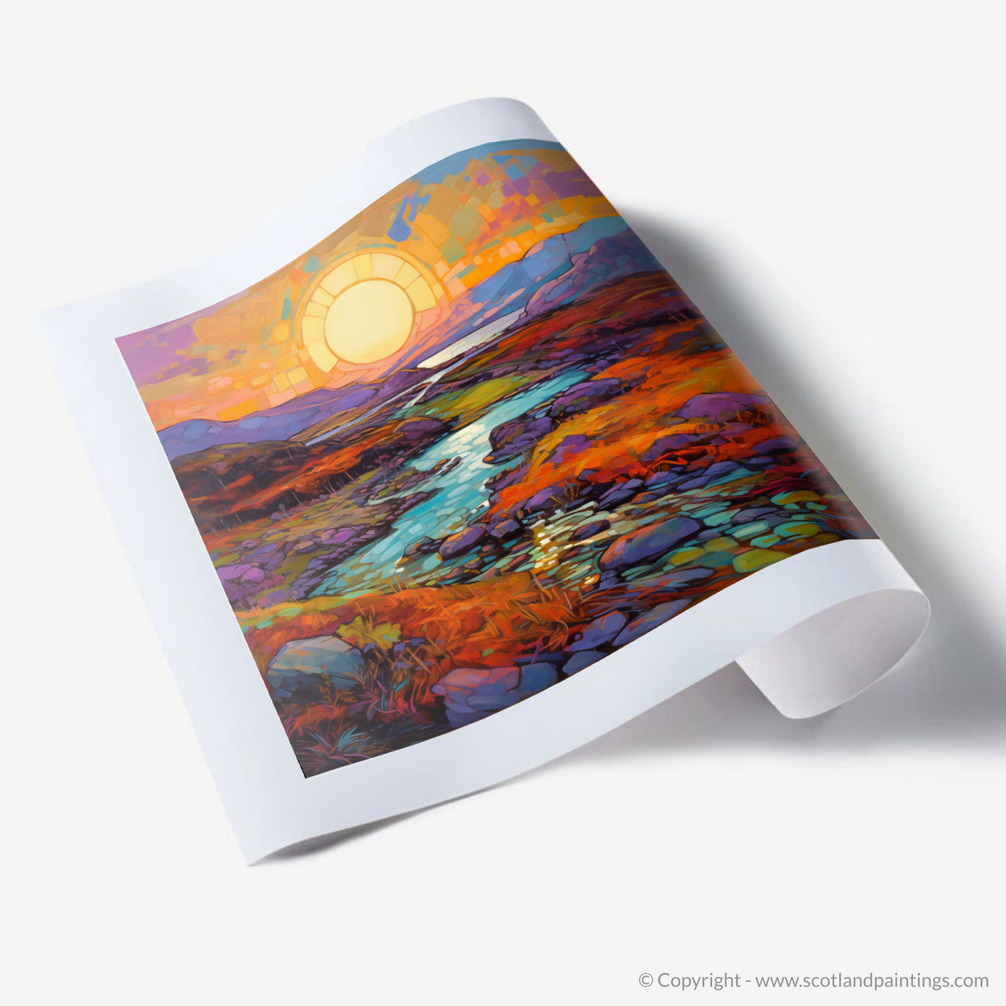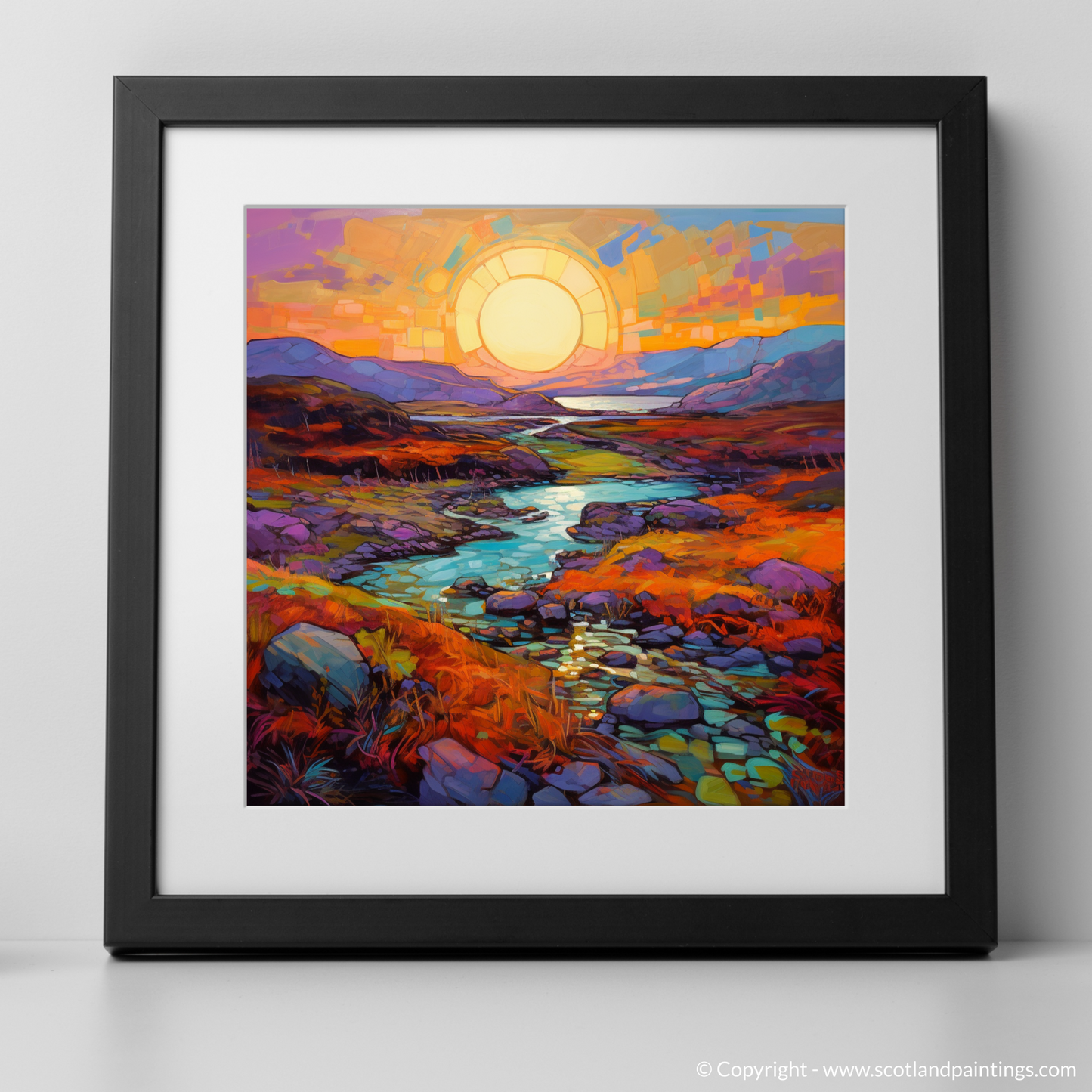 As the sun dips towards the horizon, its luminous presence permeates the scene with warmth and vibrancy in this exquisite print. Capturing the essence of the Isle of Harris in the Outer Hebrides, the artwork evokes the tranquil yet untamed beauty of the Scottish isles through a modern impressionistic lens.