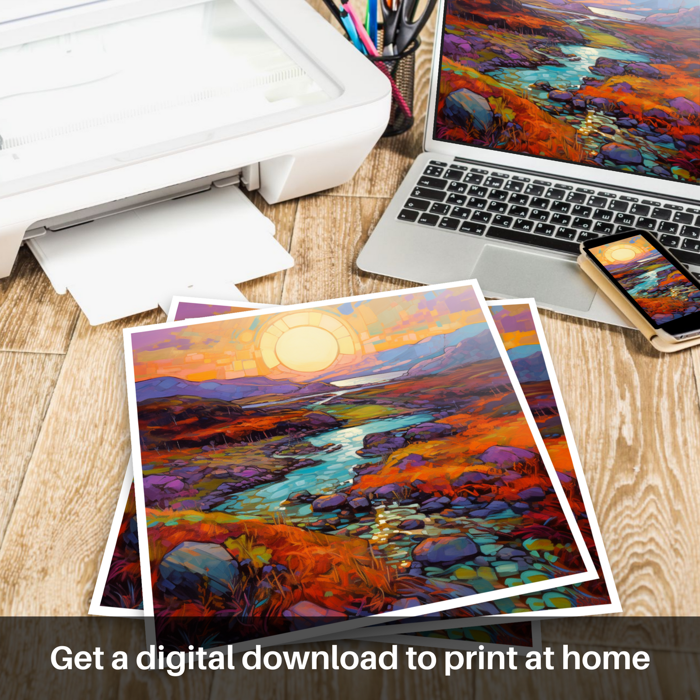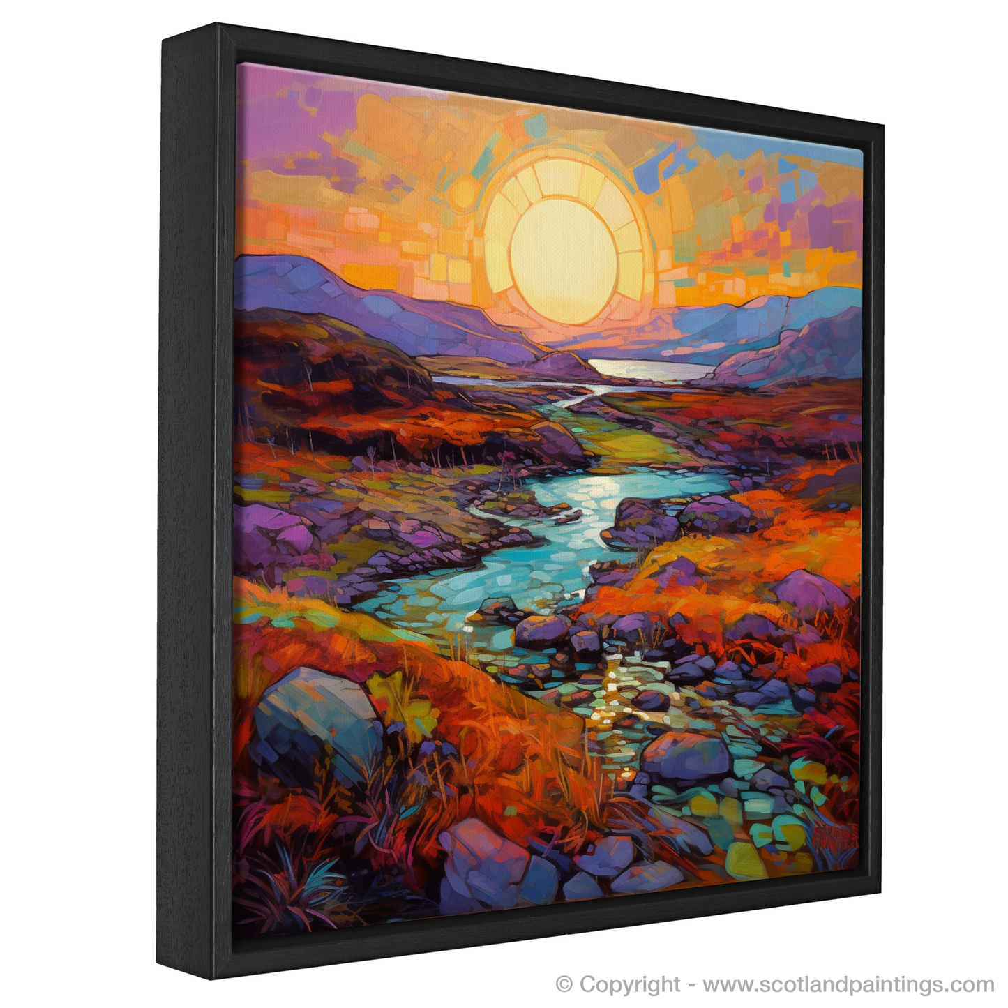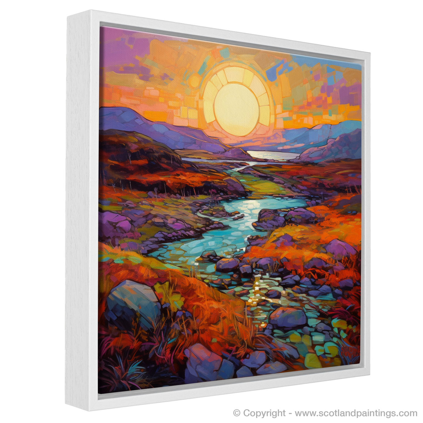 As the sun dips towards the horizon, its luminous presence permeates the scene with warmth and vibrancy in this exquisite print. Capturing the essence of the Isle of Harris in the Outer Hebrides, the artwork evokes the tranquil yet untamed beauty of the Scottish isles through a modern impressionistic lens.